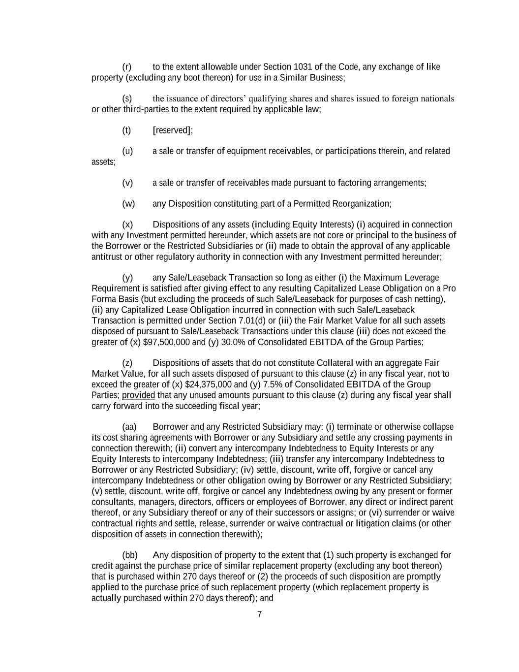 7 (r) to the extent allowable under Section 1031 of the Code, any exchange of like property (excluding any boot thereon) for use in a Similar Business; (s) the issuance of directors’ qualifying shares and shares issued to foreign nationals or other third-parties to the extent required by applicable law; (t) [reserved]; (u) a sale or transfer of equipment receivables, or participations therein, and related assets; (v) a sale or transfer of receivables made pursuant to factoring arrangements; (w) any Disposition constituting part of a Permitted Reorganization; (x) Dispositions of any assets (including Equity Interests) (i) acquired in connection with any Investment permitted hereunder, which assets are not core or principal to the business of the Borrower or the Restricted Subsidiaries or (ii) made to obtain the approval of any applicable antitrust or other regulatory authority in connection with any Investment permitted hereunder; (y) any Sale/Leaseback Transaction so long as either (i) the Maximum Leverage Requirement is satisfied after giving effect to any resulting Capitalized Lease Obligation on a Pro Forma Basis (but excluding the proceeds of such Sale/Leaseback for purposes of cash netting), (ii) any Capitalized Lease Obligation incurred in connection with such Sale/Leaseback Transaction is permitted under Section 7.01(d) or (iii) the Fair Market Value for all such assets disposed of pursuant to Sale/Leaseback Transactions under this clause (iii) does not exceed the greater of (x) $97,500,000 and (y) 30.0% of Consolidated EBITDA of the Group Parties; (z) Dispositions of assets that do not constitute Collateral with an aggregate Fair Market Value, for all such assets disposed of pursuant to this clause (z) in any fiscal year, not to exceed the greater of (x) $24,375,000 and (y) 7.5% of Consolidated EBITDA of the Group Parties; provided that any unused amounts pursuant to this clause (z) during any fiscal year shall carry forward into the succeeding fiscal year; (aa) Borrower and any Restricted Subsidiary may: (i) terminate or otherwise collapse its cost sharing agreements with Borrower or any Subsidiary and settle any crossing payments in connection therewith; (ii) convert any intercompany Indebtedness to Equity Interests or any Equity Interests to intercompany Indebtedness; (iii) transfer any intercompany Indebtedness to Borrower or any Restricted Subsidiary; (iv) settle, discount, write off, forgive or cancel any intercompany Indebtedness or other obligation owing by Borrower or any Restricted Subsidiary; (v) settle, discount, write off, forgive or cancel any Indebtedness owing by any present or former consultants, managers, directors, officers or employees of Borrower, any direct or indirect parent thereof, or any Subsidiary thereof or any of their successors or assigns; or (vi) surrender or waive contractual rights and settle, release, surrender or waive contractual or litigation claims (or other disposition of assets in connection therewith); (bb) Any disposition of property to the extent that (1) such property is exchanged for credit against the purchase price of similar replacement property (excluding any boot thereon) that is purchased within 270 days thereof or (2) the proceeds of such disposition are promptly applied to the purchase price of such replacement property (which replacement property is actually purchased within 270 days thereof); and