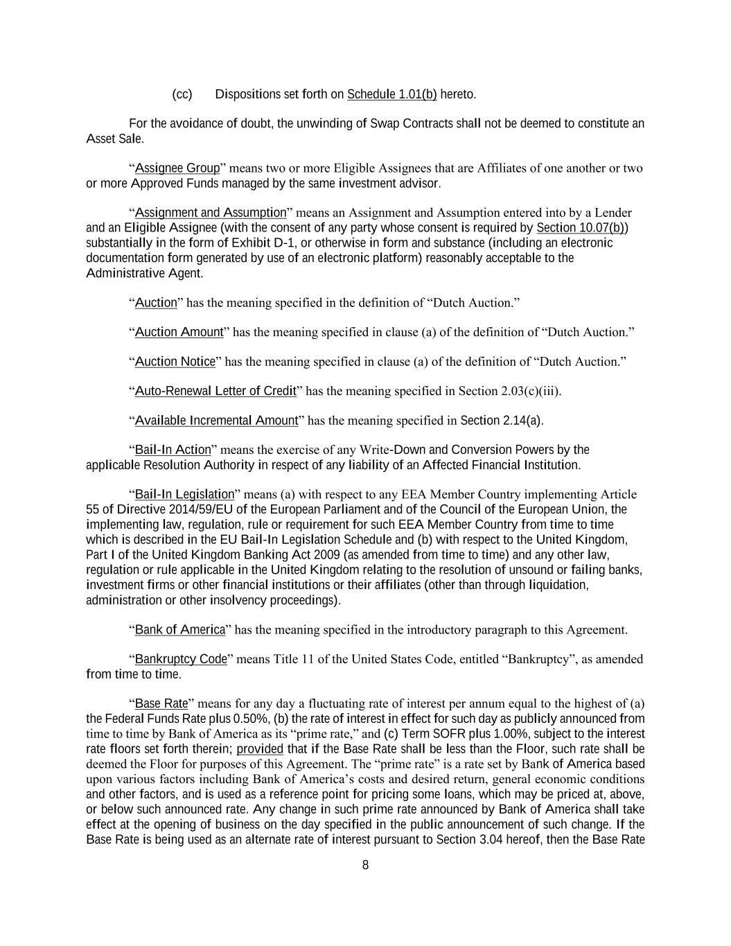 8 (cc) Dispositions set forth on Schedule 1.01(b) hereto. For the avoidance of doubt, the unwinding of Swap Contracts shall not be deemed to constitute an Asset Sale. “Assignee Group” means two or more Eligible Assignees that are Affiliates of one another or two or more Approved Funds managed by the same investment advisor. “Assignment and Assumption” means an Assignment and Assumption entered into by a Lender and an Eligible Assignee (with the consent of any party whose consent is required by Section 10.07(b)) substantially in the form of Exhibit D-1, or otherwise in form and substance (including an electronic documentation form generated by use of an electronic platform) reasonably acceptable to the Administrative Agent. “Auction” has the meaning specified in the definition of “Dutch Auction.” “Auction Amount” has the meaning specified in clause (a) of the definition of “Dutch Auction.” “Auction Notice” has the meaning specified in clause (a) of the definition of “Dutch Auction.” “Auto-Renewal Letter of Credit” has the meaning specified in Section 2.03(c)(iii). “Available Incremental Amount” has the meaning specified in Section 2.14(a). “Bail-In Action” means the exercise of any Write-Down and Conversion Powers by the applicable Resolution Authority in respect of any liability of an Affected Financial Institution. “Bail-In Legislation” means (a) with respect to any EEA Member Country implementing Article 55 of Directive 2014/59/EU of the European Parliament and of the Council of the European Union, the implementing law, regulation, rule or requirement for such EEA Member Country from time to time which is described in the EU Bail-In Legislation Schedule and (b) with respect to the United Kingdom, Part I of the United Kingdom Banking Act 2009 (as amended from time to time) and any other law, regulation or rule applicable in the United Kingdom relating to the resolution of unsound or failing banks, investment firms or other financial institutions or their affiliates (other than through liquidation, administration or other insolvency proceedings). “Bank of America” has the meaning specified in the introductory paragraph to this Agreement. “Bankruptcy Code” means Title 11 of the United States Code, entitled “Bankruptcy”, as amended from time to time. “Base Rate” means for any day a fluctuating rate of interest per annum equal to the highest of (a) the Federal Funds Rate plus 0.50%, (b) the rate of interest in effect for such day as publicly announced from time to time by Bank of America as its “prime rate,” and (c) Term SOFR plus 1.00%, subject to the interest rate floors set forth therein; provided that if the Base Rate shall be less than the Floor, such rate shall be deemed the Floor for purposes of this Agreement. The “prime rate” is a rate set by Bank of America based upon various factors including Bank of America’s costs and desired return, general economic conditions and other factors, and is used as a reference point for pricing some loans, which may be priced at, above, or below such announced rate. Any change in such prime rate announced by Bank of America shall take effect at the opening of business on the day specified in the public announcement of such change. If the Base Rate is being used as an alternate rate of interest pursuant to Section 3.04 hereof, then the Base Rate
