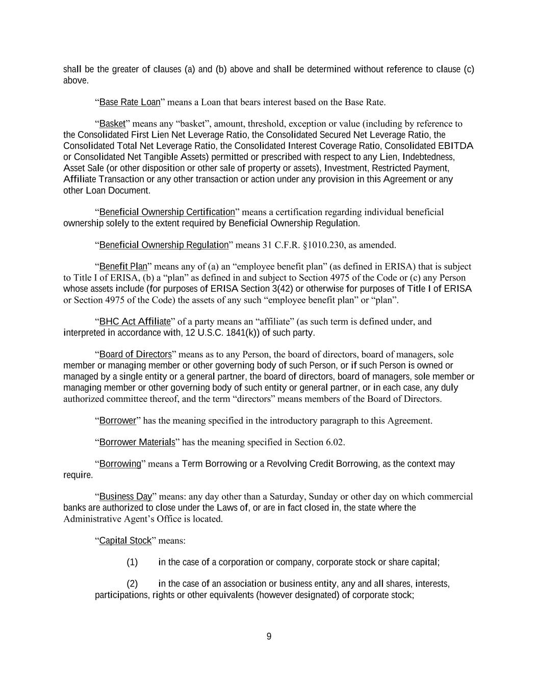 9 shall be the greater of clauses (a) and (b) above and shall be determined without reference to clause (c) above. “Base Rate Loan” means a Loan that bears interest based on the Base Rate. “Basket” means any “basket”, amount, threshold, exception or value (including by reference to the Consolidated First Lien Net Leverage Ratio, the Consolidated Secured Net Leverage Ratio, the Consolidated Total Net Leverage Ratio, the Consolidated Interest Coverage Ratio, Consolidated EBITDA or Consolidated Net Tangible Assets) permitted or prescribed with respect to any Lien, Indebtedness, Asset Sale (or other disposition or other sale of property or assets), Investment, Restricted Payment, Affiliate Transaction or any other transaction or action under any provision in this Agreement or any other Loan Document. “Beneficial Ownership Certification” means a certification regarding individual beneficial ownership solely to the extent required by Beneficial Ownership Regulation. “Beneficial Ownership Regulation” means 31 C.F.R. §1010.230, as amended. “Benefit Plan” means any of (a) an “employee benefit plan” (as defined in ERISA) that is subject to Title I of ERISA, (b) a “plan” as defined in and subject to Section 4975 of the Code or (c) any Person whose assets include (for purposes of ERISA Section 3(42) or otherwise for purposes of Title I of ERISA or Section 4975 of the Code) the assets of any such “employee benefit plan” or “plan”. “BHC Act Affiliate” of a party means an “affiliate” (as such term is defined under, and interpreted in accordance with, 12 U.S.C. 1841(k)) of such party. “Board of Directors” means as to any Person, the board of directors, board of managers, sole member or managing member or other governing body of such Person, or if such Person is owned or managed by a single entity or a general partner, the board of directors, board of managers, sole member or managing member or other governing body of such entity or general partner, or in each case, any duly authorized committee thereof, and the term “directors” means members of the Board of Directors. “Borrower” has the meaning specified in the introductory paragraph to this Agreement. “Borrower Materials” has the meaning specified in Section 6.02. “Borrowing” means a Term Borrowing or a Revolving Credit Borrowing, as the context may require. “Business Day” means: any day other than a Saturday, Sunday or other day on which commercial banks are authorized to close under the Laws of, or are in fact closed in, the state where the Administrative Agent’s Office is located. “Capital Stock” means: (1) in the case of a corporation or company, corporate stock or share capital; (2) in the case of an association or business entity, any and all shares, interests, participations, rights or other equivalents (however designated) of corporate stock;