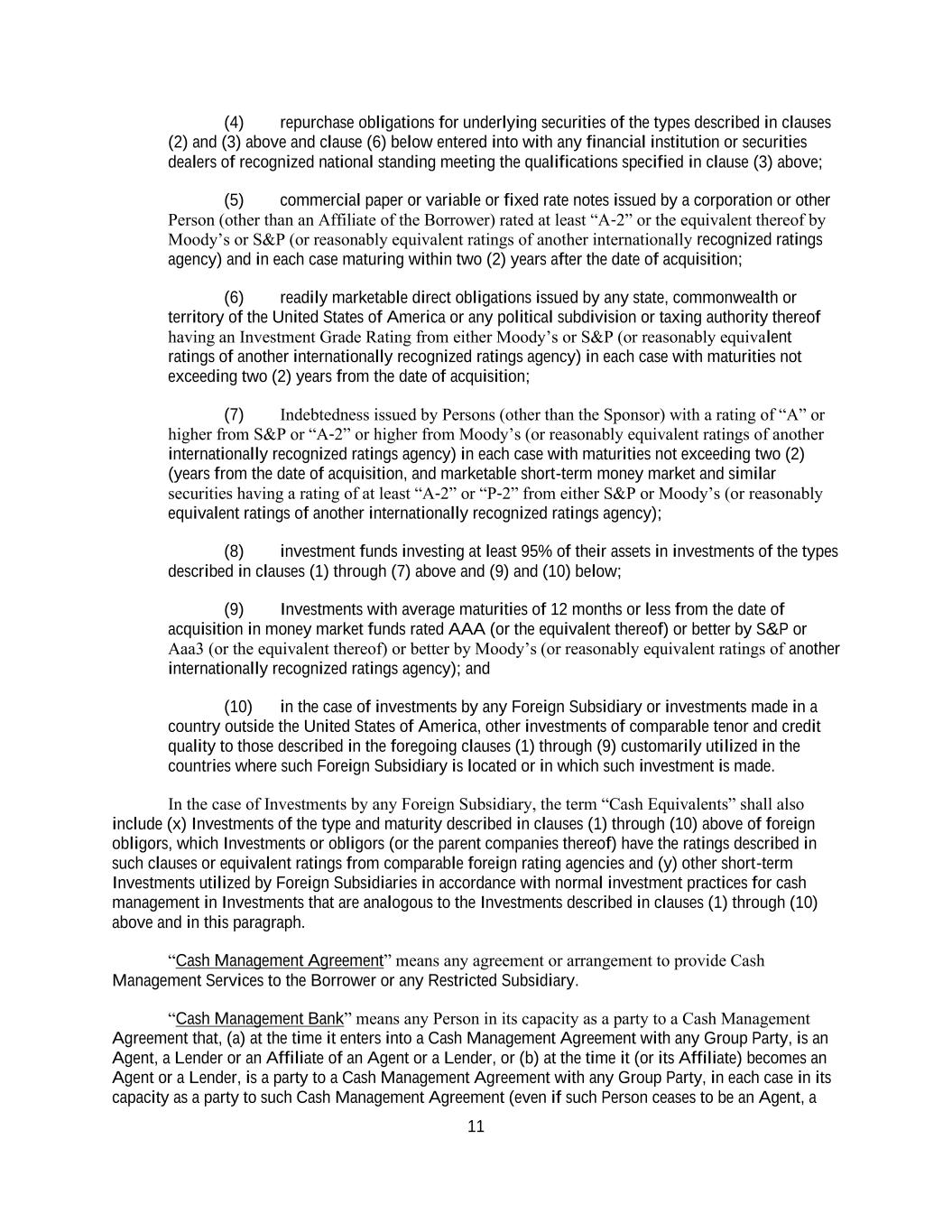 11 (4) repurchase obligations for underlying securities of the types described in clauses (2) and (3) above and clause (6) below entered into with any financial institution or securities dealers of recognized national standing meeting the qualifications specified in clause (3) above; (5) commercial paper or variable or fixed rate notes issued by a corporation or other Person (other than an Affiliate of the Borrower) rated at least “A-2” or the equivalent thereof by Moody’s or S&P (or reasonably equivalent ratings of another internationally recognized ratings agency) and in each case maturing within two (2) years after the date of acquisition; (6) readily marketable direct obligations issued by any state, commonwealth or territory of the United States of America or any political subdivision or taxing authority thereof having an Investment Grade Rating from either Moody’s or S&P (or reasonably equivalent ratings of another internationally recognized ratings agency) in each case with maturities not exceeding two (2) years from the date of acquisition; (7) Indebtedness issued by Persons (other than the Sponsor) with a rating of “A” or higher from S&P or “A-2” or higher from Moody’s (or reasonably equivalent ratings of another internationally recognized ratings agency) in each case with maturities not exceeding two (2) (years from the date of acquisition, and marketable short-term money market and similar securities having a rating of at least “A-2” or “P-2” from either S&P or Moody’s (or reasonably equivalent ratings of another internationally recognized ratings agency); (8) investment funds investing at least 95% of their assets in investments of the types described in clauses (1) through (7) above and (9) and (10) below; (9) Investments with average maturities of 12 months or less from the date of acquisition in money market funds rated AAA (or the equivalent thereof) or better by S&P or Aaa3 (or the equivalent thereof) or better by Moody’s (or reasonably equivalent ratings of another internationally recognized ratings agency); and (10) in the case of investments by any Foreign Subsidiary or investments made in a country outside the United States of America, other investments of comparable tenor and credit quality to those described in the foregoing clauses (1) through (9) customarily utilized in the countries where such Foreign Subsidiary is located or in which such investment is made. In the case of Investments by any Foreign Subsidiary, the term “Cash Equivalents” shall also include (x) Investments of the type and maturity described in clauses (1) through (10) above of foreign obligors, which Investments or obligors (or the parent companies thereof) have the ratings described in such clauses or equivalent ratings from comparable foreign rating agencies and (y) other short-term Investments utilized by Foreign Subsidiaries in accordance with normal investment practices for cash management in Investments that are analogous to the Investments described in clauses (1) through (10) above and in this paragraph. “Cash Management Agreement” means any agreement or arrangement to provide Cash Management Services to the Borrower or any Restricted Subsidiary. “Cash Management Bank” means any Person in its capacity as a party to a Cash Management Agreement that, (a) at the time it enters into a Cash Management Agreement with any Group Party, is an Agent, a Lender or an Affiliate of an Agent or a Lender, or (b) at the time it (or its Affiliate) becomes an Agent or a Lender, is a party to a Cash Management Agreement with any Group Party, in each case in its capacity as a party to such Cash Management Agreement (even if such Person ceases to be an Agent, a