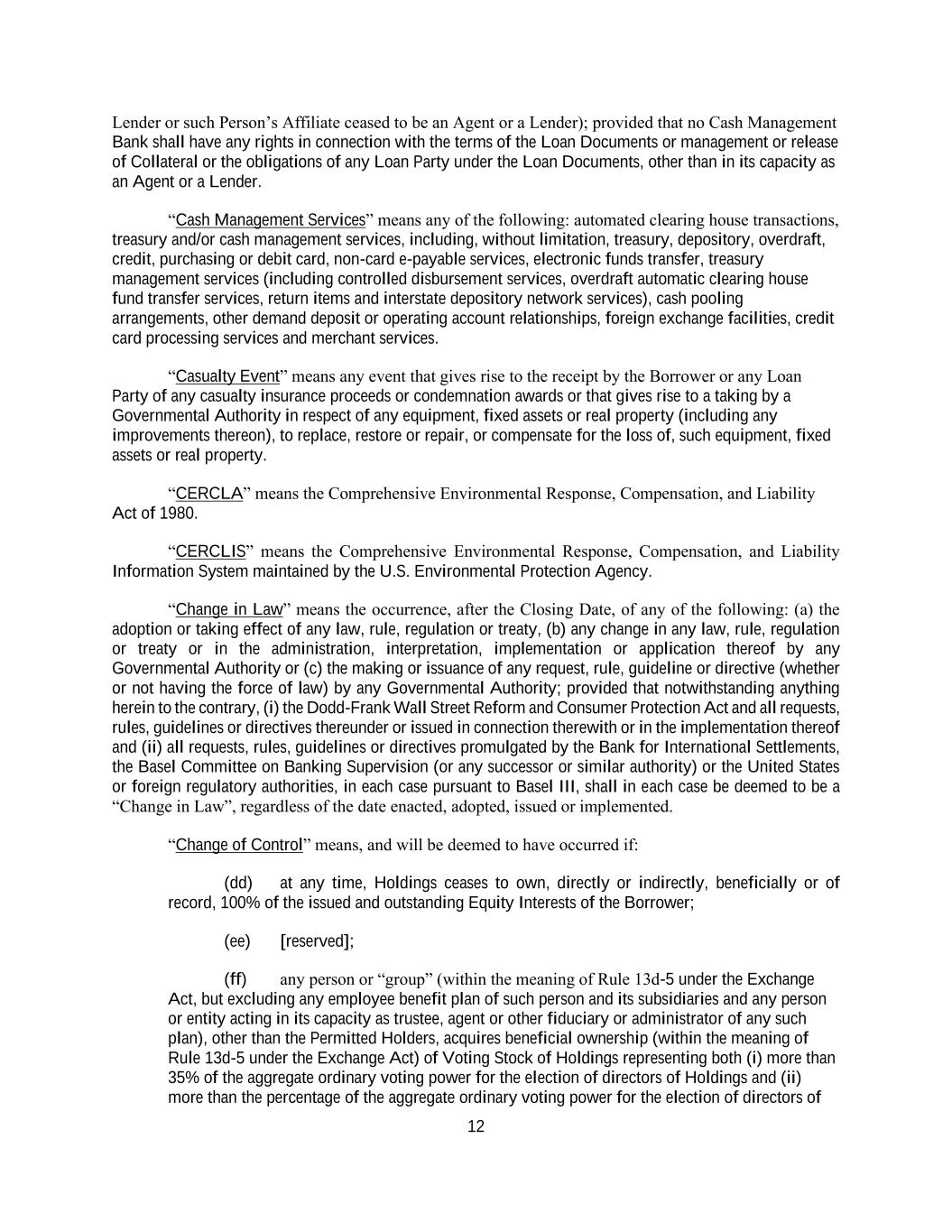 12 Lender or such Person’s Affiliate ceased to be an Agent or a Lender); provided that no Cash Management Bank shall have any rights in connection with the terms of the Loan Documents or management or release of Collateral or the obligations of any Loan Party under the Loan Documents, other than in its capacity as an Agent or a Lender. “Cash Management Services” means any of the following: automated clearing house transactions, treasury and/or cash management services, including, without limitation, treasury, depository, overdraft, credit, purchasing or debit card, non-card e-payable services, electronic funds transfer, treasury management services (including controlled disbursement services, overdraft automatic clearing house fund transfer services, return items and interstate depository network services), cash pooling arrangements, other demand deposit or operating account relationships, foreign exchange facilities, credit card processing services and merchant services. “Casualty Event” means any event that gives rise to the receipt by the Borrower or any Loan Party of any casualty insurance proceeds or condemnation awards or that gives rise to a taking by a Governmental Authority in respect of any equipment, fixed assets or real property (including any improvements thereon), to replace, restore or repair, or compensate for the loss of, such equipment, fixed assets or real property. “CERCLA” means the Comprehensive Environmental Response, Compensation, and Liability Act of 1980. “CERCLIS” means the Comprehensive Environmental Response, Compensation, and Liability Information System maintained by the U.S. Environmental Protection Agency. “Change in Law” means the occurrence, after the Closing Date, of any of the following: (a) the adoption or taking effect of any law, rule, regulation or treaty, (b) any change in any law, rule, regulation or treaty or in the administration, interpretation, implementation or application thereof by any Governmental Authority or (c) the making or issuance of any request, rule, guideline or directive (whether or not having the force of law) by any Governmental Authority; provided that notwithstanding anything herein to the contrary, (i) the Dodd-Frank Wall Street Reform and Consumer Protection Act and all requests, rules, guidelines or directives thereunder or issued in connection therewith or in the implementation thereof and (ii) all requests, rules, guidelines or directives promulgated by the Bank for International Settlements, the Basel Committee on Banking Supervision (or any successor or similar authority) or the United States or foreign regulatory authorities, in each case pursuant to Basel III, shall in each case be deemed to be a “Change in Law”, regardless of the date enacted, adopted, issued or implemented. “Change of Control” means, and will be deemed to have occurred if: (dd) at any time, Holdings ceases to own, directly or indirectly, beneficially or of record, 100% of the issued and outstanding Equity Interests of the Borrower; (ee) [reserved]; (ff) any person or “group” (within the meaning of Rule 13d-5 under the Exchange Act, but excluding any employee benefit plan of such person and its subsidiaries and any person or entity acting in its capacity as trustee, agent or other fiduciary or administrator of any such plan), other than the Permitted Holders, acquires beneficial ownership (within the meaning of Rule 13d-5 under the Exchange Act) of Voting Stock of Holdings representing both (i) more than 35% of the aggregate ordinary voting power for the election of directors of Holdings and (ii) more than the percentage of the aggregate ordinary voting power for the election of directors of