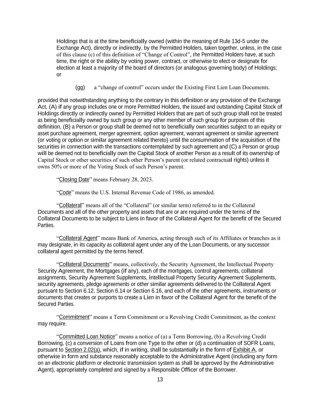 13 Holdings that is at the time beneficially owned (within the meaning of Rule 13d-5 under the Exchange Act), directly or indirectly, by the Permitted Holders, taken together, unless, in the case of this clause (c) of this definition of “Change of Control”, the Permitted Holders have, at such time, the right or the ability by voting power, contract, or otherwise to elect or designate for election at least a majority of the board of directors (or analogous governing body) of Holdings; or (gg) a “change of control” occurs under the Existing First Lien Loan Documents. provided that notwithstanding anything to the contrary in this definition or any provision of the Exchange Act, (A) if any group includes one or more Permitted Holders, the issued and outstanding Capital Stock of Holdings directly or indirectly owned by Permitted Holders that are part of such group shall not be treated as being beneficially owned by such group or any other member of such group for purposes of this definition, (B) a Person or group shall be deemed not to beneficially own securities subject to an equity or asset purchase agreement, merger agreement, option agreement, warrant agreement or similar agreement (or voting or option or similar agreement related thereto) until the consummation of the acquisition of the securities in connection with the transactions contemplated by such agreement and (C) a Person or group will be deemed not to beneficially own the Capital Stock of another Person as a result of its ownership of Capital Stock or other securities of such other Person’s parent (or related contractual rights) unless it owns 50% or more of the Voting Stock of such Person’s parent. “Closing Date” means February 28, 2023. “Code” means the U.S. Internal Revenue Code of 1986, as amended. “Collateral” means all of the “Collateral” (or similar term) referred to in the Collateral Documents and all of the other property and assets that are or are required under the terms of the Collateral Documents to be subject to Liens in favor of the Collateral Agent for the benefit of the Secured Parties. “Collateral Agent” means Bank of America, acting through such of its Affiliates or branches as it may designate, in its capacity as collateral agent under any of the Loan Documents, or any successor collateral agent permitted by the terms hereof. “Collateral Documents” means, collectively, the Security Agreement, the Intellectual Property Security Agreement, the Mortgages (if any), each of the mortgages, control agreements, collateral assignments, Security Agreement Supplements, Intellectual Property Security Agreement Supplements, security agreements, pledge agreements or other similar agreements delivered to the Collateral Agent pursuant to Section 6.12, Section 6.14 or Section 6.16, and each of the other agreements, instruments or documents that creates or purports to create a Lien in favor of the Collateral Agent for the benefit of the Secured Parties. “Commitment” means a Term Commitment or a Revolving Credit Commitment, as the context may require. “Committed Loan Notice” means a notice of (a) a Term Borrowing, (b) a Revolving Credit Borrowing, (c) a conversion of Loans from one Type to the other or (d) a continuation of SOFR Loans, pursuant to Section 2.02(a), which, if in writing, shall be substantially in the form of Exhibit A, or otherwise in form and substance reasonably acceptable to the Administrative Agent (including any form on an electronic platform or electronic transmission system as shall be approved by the Administrative Agent), appropriately completed and signed by a Responsible Officer of the Borrower.