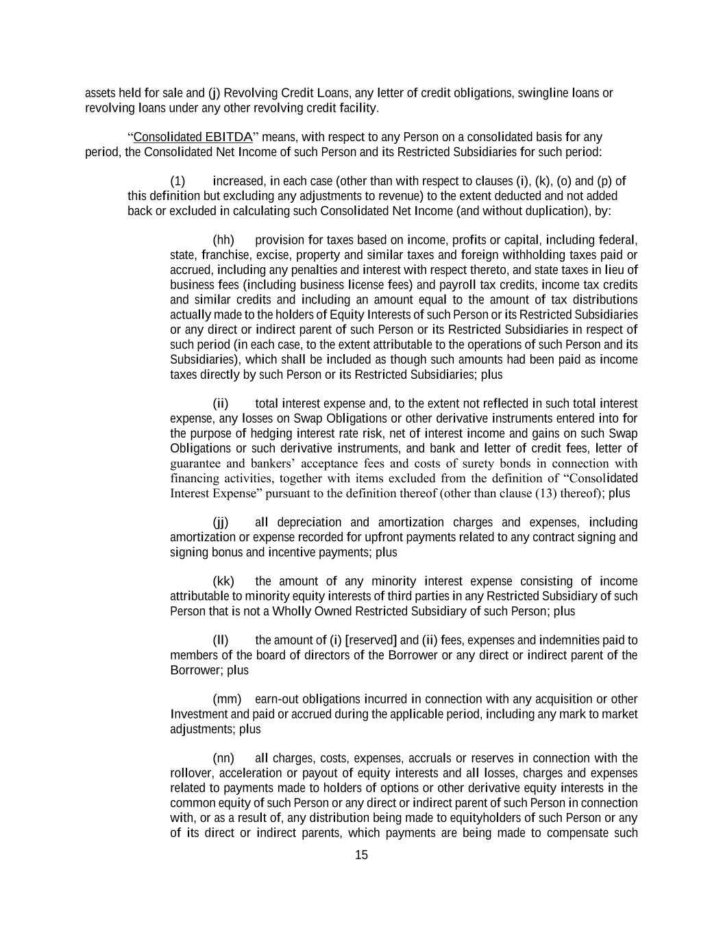 15 assets held for sale and (j) Revolving Credit Loans, any letter of credit obligations, swingline loans or revolving loans under any other revolving credit facility. “Consolidated EBITDA” means, with respect to any Person on a consolidated basis for any period, the Consolidated Net Income of such Person and its Restricted Subsidiaries for such period: (1) increased, in each case (other than with respect to clauses (i), (k), (o) and (p) of this definition but excluding any adjustments to revenue) to the extent deducted and not added back or excluded in calculating such Consolidated Net Income (and without duplication), by: (hh) provision for taxes based on income, profits or capital, including federal, state, franchise, excise, property and similar taxes and foreign withholding taxes paid or accrued, including any penalties and interest with respect thereto, and state taxes in lieu of business fees (including business license fees) and payroll tax credits, income tax credits and similar credits and including an amount equal to the amount of tax distributions actually made to the holders of Equity Interests of such Person or its Restricted Subsidiaries or any direct or indirect parent of such Person or its Restricted Subsidiaries in respect of such period (in each case, to the extent attributable to the operations of such Person and its Subsidiaries), which shall be included as though such amounts had been paid as income taxes directly by such Person or its Restricted Subsidiaries; plus (ii) total interest expense and, to the extent not reflected in such total interest expense, any losses on Swap Obligations or other derivative instruments entered into for the purpose of hedging interest rate risk, net of interest income and gains on such Swap Obligations or such derivative instruments, and bank and letter of credit fees, letter of guarantee and bankers’ acceptance fees and costs of surety bonds in connection with financing activities, together with items excluded from the definition of “Consolidated Interest Expense” pursuant to the definition thereof (other than clause (13) thereof); plus (jj) all depreciation and amortization charges and expenses, including amortization or expense recorded for upfront payments related to any contract signing and signing bonus and incentive payments; plus (kk) the amount of any minority interest expense consisting of income attributable to minority equity interests of third parties in any Restricted Subsidiary of such Person that is not a Wholly Owned Restricted Subsidiary of such Person; plus (ll) the amount of (i) [reserved] and (ii) fees, expenses and indemnities paid to members of the board of directors of the Borrower or any direct or indirect parent of the Borrower; plus (mm) earn-out obligations incurred in connection with any acquisition or other Investment and paid or accrued during the applicable period, including any mark to market adjustments; plus (nn) all charges, costs, expenses, accruals or reserves in connection with the rollover, acceleration or payout of equity interests and all losses, charges and expenses related to payments made to holders of options or other derivative equity interests in the common equity of such Person or any direct or indirect parent of such Person in connection with, or as a result of, any distribution being made to equityholders of such Person or any of its direct or indirect parents, which payments are being made to compensate such
