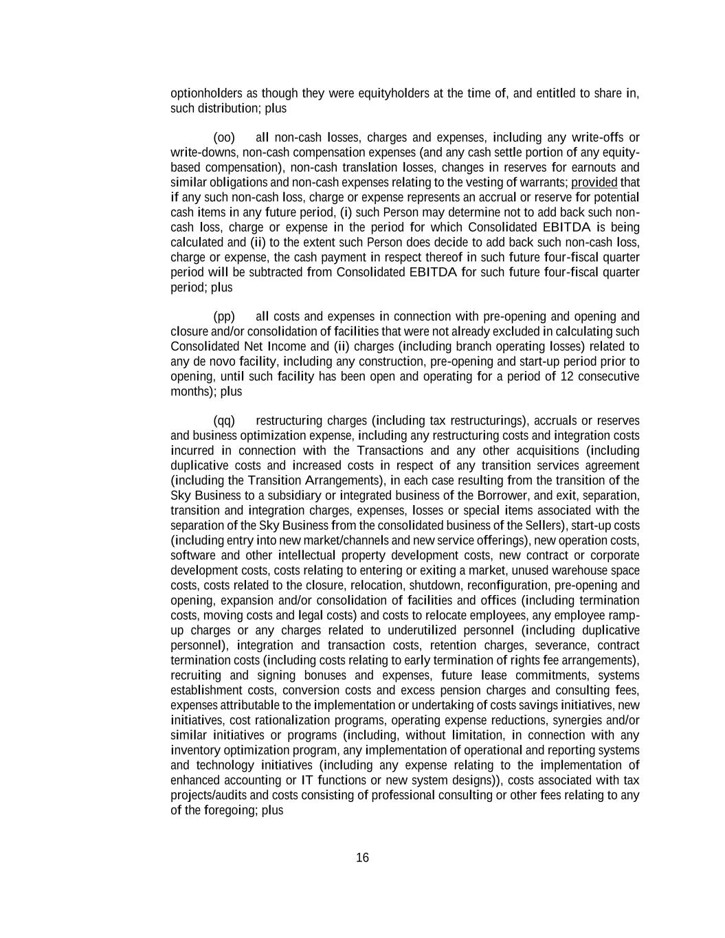 16 optionholders as though they were equityholders at the time of, and entitled to share in, such distribution; plus (oo) all non-cash losses, charges and expenses, including any write-offs or write-downs, non-cash compensation expenses (and any cash settle portion of any equity- based compensation), non-cash translation losses, changes in reserves for earnouts and similar obligations and non-cash expenses relating to the vesting of warrants; provided that if any such non-cash loss, charge or expense represents an accrual or reserve for potential cash items in any future period, (i) such Person may determine not to add back such non- cash loss, charge or expense in the period for which Consolidated EBITDA is being calculated and (ii) to the extent such Person does decide to add back such non-cash loss, charge or expense, the cash payment in respect thereof in such future four-fiscal quarter period will be subtracted from Consolidated EBITDA for such future four-fiscal quarter period; plus (pp) all costs and expenses in connection with pre-opening and opening and closure and/or consolidation of facilities that were not already excluded in calculating such Consolidated Net Income and (ii) charges (including branch operating losses) related to any de novo facility, including any construction, pre-opening and start-up period prior to opening, until such facility has been open and operating for a period of 12 consecutive months); plus (qq) restructuring charges (including tax restructurings), accruals or reserves and business optimization expense, including any restructuring costs and integration costs incurred in connection with the Transactions and any other acquisitions (including duplicative costs and increased costs in respect of any transition services agreement (including the Transition Arrangements), in each case resulting from the transition of the Sky Business to a subsidiary or integrated business of the Borrower, and exit, separation, transition and integration charges, expenses, losses or special items associated with the separation of the Sky Business from the consolidated business of the Sellers), start-up costs (including entry into new market/channels and new service offerings), new operation costs, software and other intellectual property development costs, new contract or corporate development costs, costs relating to entering or exiting a market, unused warehouse space costs, costs related to the closure, relocation, shutdown, reconfiguration, pre-opening and opening, expansion and/or consolidation of facilities and offices (including termination costs, moving costs and legal costs) and costs to relocate employees, any employee ramp- up charges or any charges related to underutilized personnel (including duplicative personnel), integration and transaction costs, retention charges, severance, contract termination costs (including costs relating to early termination of rights fee arrangements), recruiting and signing bonuses and expenses, future lease commitments, systems establishment costs, conversion costs and excess pension charges and consulting fees, expenses attributable to the implementation or undertaking of costs savings initiatives, new initiatives, cost rationalization programs, operating expense reductions, synergies and/or similar initiatives or programs (including, without limitation, in connection with any inventory optimization program, any implementation of operational and reporting systems and technology initiatives (including any expense relating to the implementation of enhanced accounting or IT functions or new system designs)), costs associated with tax projects/audits and costs consisting of professional consulting or other fees relating to any of the foregoing; plus