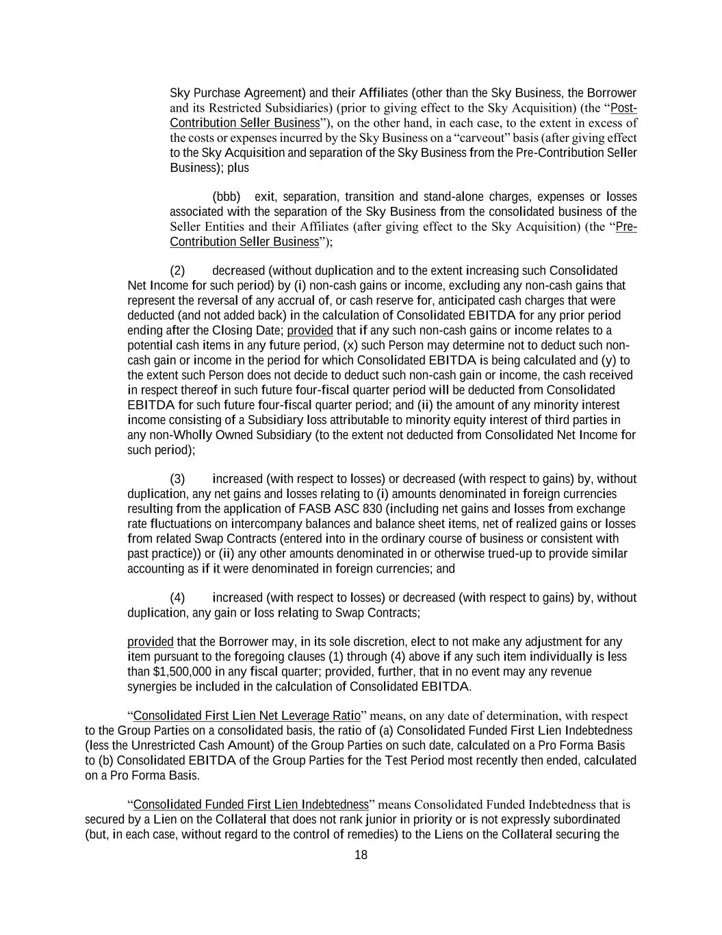 18 Sky Purchase Agreement) and their Affiliates (other than the Sky Business, the Borrower and its Restricted Subsidiaries) (prior to giving effect to the Sky Acquisition) (the “Post- Contribution Seller Business”), on the other hand, in each case, to the extent in excess of the costs or expenses incurred by the Sky Business on a “carveout” basis (after giving effect to the Sky Acquisition and separation of the Sky Business from the Pre-Contribution Seller Business); plus (bbb) exit, separation, transition and stand-alone charges, expenses or losses associated with the separation of the Sky Business from the consolidated business of the Seller Entities and their Affiliates (after giving effect to the Sky Acquisition) (the “Pre- Contribution Seller Business”); (2) decreased (without duplication and to the extent increasing such Consolidated Net Income for such period) by (i) non-cash gains or income, excluding any non-cash gains that represent the reversal of any accrual of, or cash reserve for, anticipated cash charges that were deducted (and not added back) in the calculation of Consolidated EBITDA for any prior period ending after the Closing Date; provided that if any such non-cash gains or income relates to a potential cash items in any future period, (x) such Person may determine not to deduct such non- cash gain or income in the period for which Consolidated EBITDA is being calculated and (y) to the extent such Person does not decide to deduct such non-cash gain or income, the cash received in respect thereof in such future four-fiscal quarter period will be deducted from Consolidated EBITDA for such future four-fiscal quarter period; and (ii) the amount of any minority interest income consisting of a Subsidiary loss attributable to minority equity interest of third parties in any non-Wholly Owned Subsidiary (to the extent not deducted from Consolidated Net Income for such period); (3) increased (with respect to losses) or decreased (with respect to gains) by, without duplication, any net gains and losses relating to (i) amounts denominated in foreign currencies resulting from the application of FASB ASC 830 (including net gains and losses from exchange rate fluctuations on intercompany balances and balance sheet items, net of realized gains or losses from related Swap Contracts (entered into in the ordinary course of business or consistent with past practice)) or (ii) any other amounts denominated in or otherwise trued-up to provide similar accounting as if it were denominated in foreign currencies; and (4) increased (with respect to losses) or decreased (with respect to gains) by, without duplication, any gain or loss relating to Swap Contracts; provided that the Borrower may, in its sole discretion, elect to not make any adjustment for any item pursuant to the foregoing clauses (1) through (4) above if any such item individually is less than $1,500,000 in any fiscal quarter; provided, further, that in no event may any revenue synergies be included in the calculation of Consolidated EBITDA. “Consolidated First Lien Net Leverage Ratio” means, on any date of determination, with respect to the Group Parties on a consolidated basis, the ratio of (a) Consolidated Funded First Lien Indebtedness (less the Unrestricted Cash Amount) of the Group Parties on such date, calculated on a Pro Forma Basis to (b) Consolidated EBITDA of the Group Parties for the Test Period most recently then ended, calculated on a Pro Forma Basis. “Consolidated Funded First Lien Indebtedness” means Consolidated Funded Indebtedness that is secured by a Lien on the Collateral that does not rank junior in priority or is not expressly subordinated (but, in each case, without regard to the control of remedies) to the Liens on the Collateral securing the