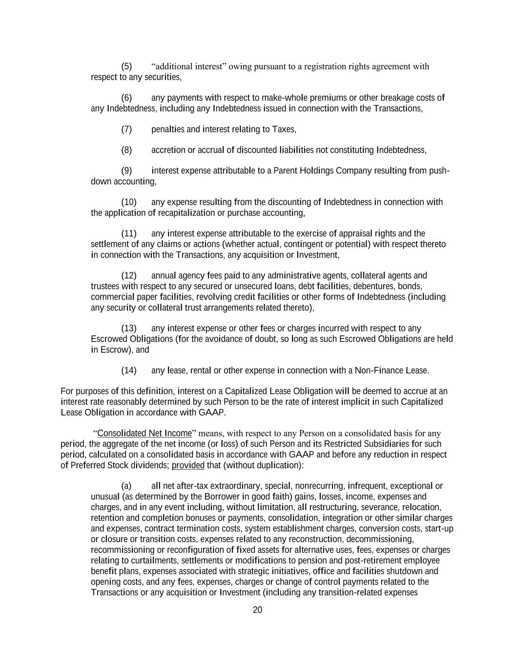 20 (5) “additional interest” owing pursuant to a registration rights agreement with respect to any securities, (6) any payments with respect to make-whole premiums or other breakage costs of any Indebtedness, including any Indebtedness issued in connection with the Transactions, (7) penalties and interest relating to Taxes, (8) accretion or accrual of discounted liabilities not constituting Indebtedness, (9) interest expense attributable to a Parent Holdings Company resulting from push- down accounting, (10) any expense resulting from the discounting of Indebtedness in connection with the application of recapitalization or purchase accounting, (11) any interest expense attributable to the exercise of appraisal rights and the settlement of any claims or actions (whether actual, contingent or potential) with respect thereto in connection with the Transactions, any acquisition or Investment, (12) annual agency fees paid to any administrative agents, collateral agents and trustees with respect to any secured or unsecured loans, debt facilities, debentures, bonds, commercial paper facilities, revolving credit facilities or other forms of Indebtedness (including any security or collateral trust arrangements related thereto), (13) any interest expense or other fees or charges incurred with respect to any Escrowed Obligations (for the avoidance of doubt, so long as such Escrowed Obligations are held in Escrow), and (14) any lease, rental or other expense in connection with a Non-Finance Lease. For purposes of this definition, interest on a Capitalized Lease Obligation will be deemed to accrue at an interest rate reasonably determined by such Person to be the rate of interest implicit in such Capitalized Lease Obligation in accordance with GAAP. “Consolidated Net Income” means, with respect to any Person on a consolidated basis for any period, the aggregate of the net income (or loss) of such Person and its Restricted Subsidiaries for such period, calculated on a consolidated basis in accordance with GAAP and before any reduction in respect of Preferred Stock dividends; provided that (without duplication): (a) all net after-tax extraordinary, special, nonrecurring, infrequent, exceptional or unusual (as determined by the Borrower in good faith) gains, losses, income, expenses and charges, and in any event including, without limitation, all restructuring, severance, relocation, retention and completion bonuses or payments, consolidation, integration or other similar charges and expenses, contract termination costs, system establishment charges, conversion costs, start-up or closure or transition costs, expenses related to any reconstruction, decommissioning, recommissioning or reconfiguration of fixed assets for alternative uses, fees, expenses or charges relating to curtailments, settlements or modifications to pension and post-retirement employee benefit plans, expenses associated with strategic initiatives, office and facilities shutdown and opening costs, and any fees, expenses, charges or change of control payments related to the Transactions or any acquisition or Investment (including any transition-related expenses