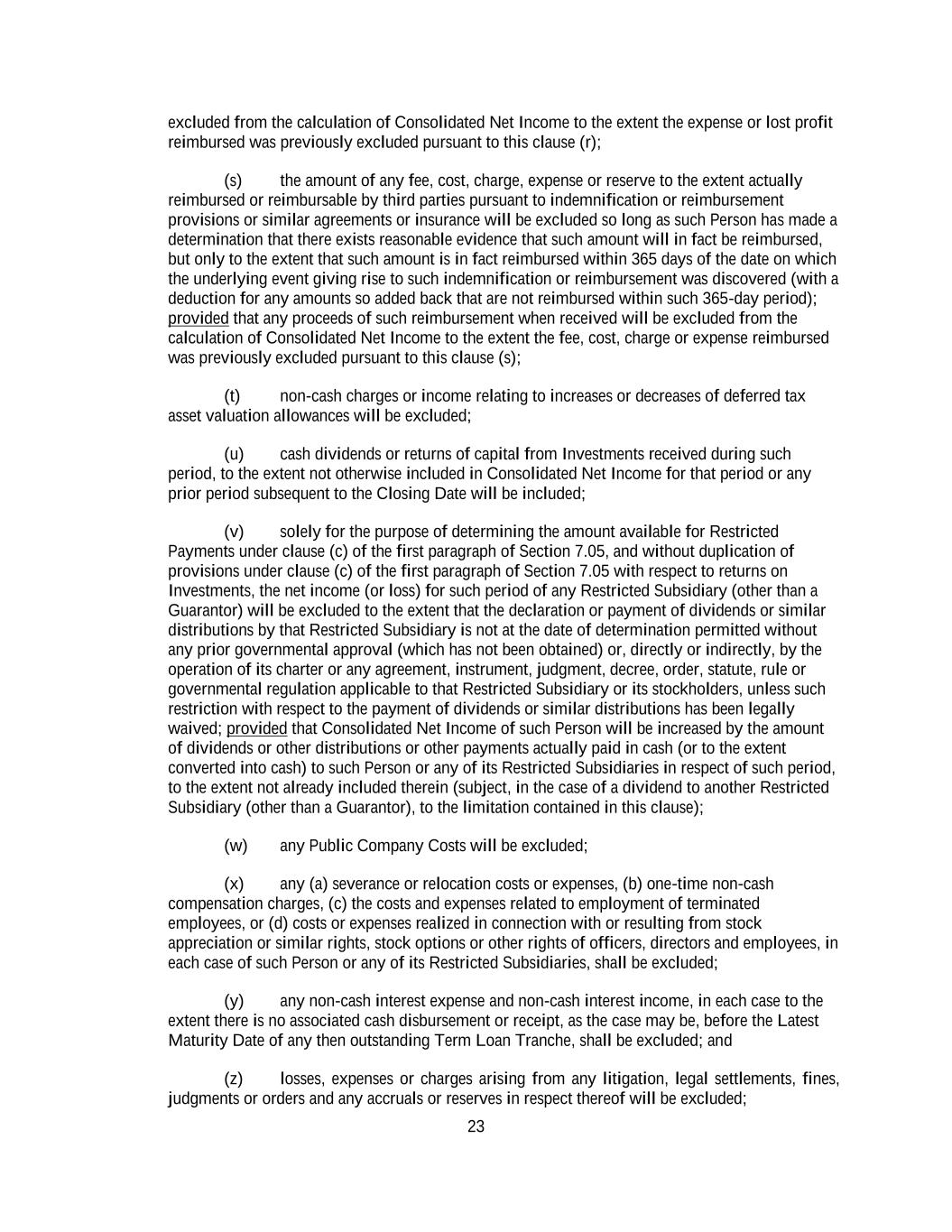 23 excluded from the calculation of Consolidated Net Income to the extent the expense or lost profit reimbursed was previously excluded pursuant to this clause (r); (s) the amount of any fee, cost, charge, expense or reserve to the extent actually reimbursed or reimbursable by third parties pursuant to indemnification or reimbursement provisions or similar agreements or insurance will be excluded so long as such Person has made a determination that there exists reasonable evidence that such amount will in fact be reimbursed, but only to the extent that such amount is in fact reimbursed within 365 days of the date on which the underlying event giving rise to such indemnification or reimbursement was discovered (with a deduction for any amounts so added back that are not reimbursed within such 365-day period); provided that any proceeds of such reimbursement when received will be excluded from the calculation of Consolidated Net Income to the extent the fee, cost, charge or expense reimbursed was previously excluded pursuant to this clause (s); (t) non-cash charges or income relating to increases or decreases of deferred tax asset valuation allowances will be excluded; (u) cash dividends or returns of capital from Investments received during such period, to the extent not otherwise included in Consolidated Net Income for that period or any prior period subsequent to the Closing Date will be included; (v) solely for the purpose of determining the amount available for Restricted Payments under clause (c) of the first paragraph of Section 7.05, and without duplication of provisions under clause (c) of the first paragraph of Section 7.05 with respect to returns on Investments, the net income (or loss) for such period of any Restricted Subsidiary (other than a Guarantor) will be excluded to the extent that the declaration or payment of dividends or similar distributions by that Restricted Subsidiary is not at the date of determination permitted without any prior governmental approval (which has not been obtained) or, directly or indirectly, by the operation of its charter or any agreement, instrument, judgment, decree, order, statute, rule or governmental regulation applicable to that Restricted Subsidiary or its stockholders, unless such restriction with respect to the payment of dividends or similar distributions has been legally waived; provided that Consolidated Net Income of such Person will be increased by the amount of dividends or other distributions or other payments actually paid in cash (or to the extent converted into cash) to such Person or any of its Restricted Subsidiaries in respect of such period, to the extent not already included therein (subject, in the case of a dividend to another Restricted Subsidiary (other than a Guarantor), to the limitation contained in this clause); (w) any Public Company Costs will be excluded; (x) any (a) severance or relocation costs or expenses, (b) one-time non-cash compensation charges, (c) the costs and expenses related to employment of terminated employees, or (d) costs or expenses realized in connection with or resulting from stock appreciation or similar rights, stock options or other rights of officers, directors and employees, in each case of such Person or any of its Restricted Subsidiaries, shall be excluded; (y) any non-cash interest expense and non-cash interest income, in each case to the extent there is no associated cash disbursement or receipt, as the case may be, before the Latest Maturity Date of any then outstanding Term Loan Tranche, shall be excluded; and (z) losses, expenses or charges arising from any litigation, legal settlements, fines, judgments or orders and any accruals or reserves in respect thereof will be excluded;