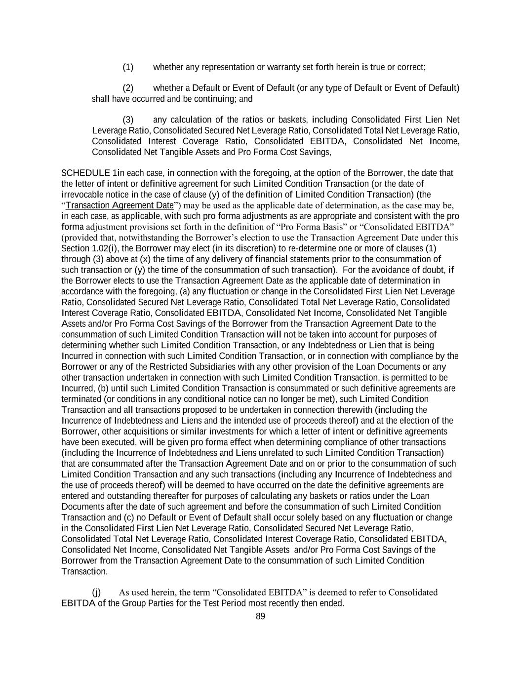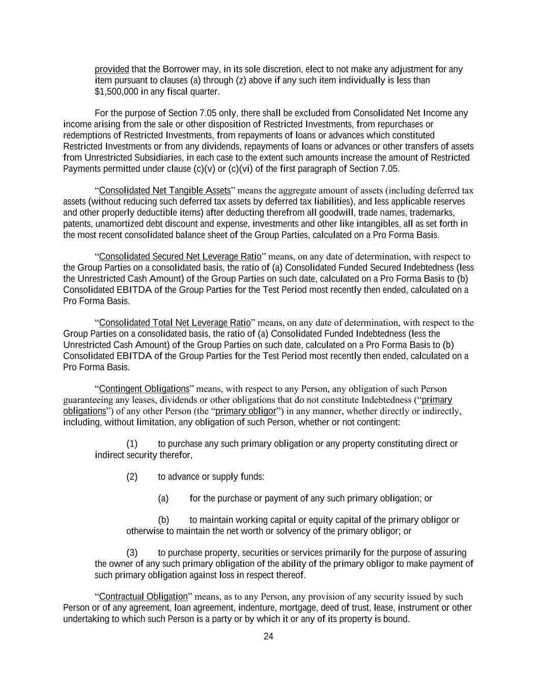 24 provided that the Borrower may, in its sole discretion, elect to not make any adjustment for any item pursuant to clauses (a) through (z) above if any such item individually is less than $1,500,000 in any fiscal quarter. For the purpose of Section 7.05 only, there shall be excluded from Consolidated Net Income any income arising from the sale or other disposition of Restricted Investments, from repurchases or redemptions of Restricted Investments, from repayments of loans or advances which constituted Restricted Investments or from any dividends, repayments of loans or advances or other transfers of assets from Unrestricted Subsidiaries, in each case to the extent such amounts increase the amount of Restricted Payments permitted under clause (c)(v) or (c)(vi) of the first paragraph of Section 7.05. “Consolidated Net Tangible Assets” means the aggregate amount of assets (including deferred tax assets (without reducing such deferred tax assets by deferred tax liabilities), and less applicable reserves and other properly deductible items) after deducting therefrom all goodwill, trade names, trademarks, patents, unamortized debt discount and expense, investments and other like intangibles, all as set forth in the most recent consolidated balance sheet of the Group Parties, calculated on a Pro Forma Basis. “Consolidated Secured Net Leverage Ratio” means, on any date of determination, with respect to the Group Parties on a consolidated basis, the ratio of (a) Consolidated Funded Secured Indebtedness (less the Unrestricted Cash Amount) of the Group Parties on such date, calculated on a Pro Forma Basis to (b) Consolidated EBITDA of the Group Parties for the Test Period most recently then ended, calculated on a Pro Forma Basis. “Consolidated Total Net Leverage Ratio” means, on any date of determination, with respect to the Group Parties on a consolidated basis, the ratio of (a) Consolidated Funded Indebtedness (less the Unrestricted Cash Amount) of the Group Parties on such date, calculated on a Pro Forma Basis to (b) Consolidated EBITDA of the Group Parties for the Test Period most recently then ended, calculated on a Pro Forma Basis. “Contingent Obligations” means, with respect to any Person, any obligation of such Person guaranteeing any leases, dividends or other obligations that do not constitute Indebtedness (“primary obligations”) of any other Person (the “primary obligor”) in any manner, whether directly or indirectly, including, without limitation, any obligation of such Person, whether or not contingent: (1) to purchase any such primary obligation or any property constituting direct or indirect security therefor, (2) to advance or supply funds: (a) for the purchase or payment of any such primary obligation; or (b) to maintain working capital or equity capital of the primary obligor or otherwise to maintain the net worth or solvency of the primary obligor; or (3) to purchase property, securities or services primarily for the purpose of assuring the owner of any such primary obligation of the ability of the primary obligor to make payment of such primary obligation against loss in respect thereof. “Contractual Obligation” means, as to any Person, any provision of any security issued by such Person or of any agreement, loan agreement, indenture, mortgage, deed of trust, lease, instrument or other undertaking to which such Person is a party or by which it or any of its property is bound.