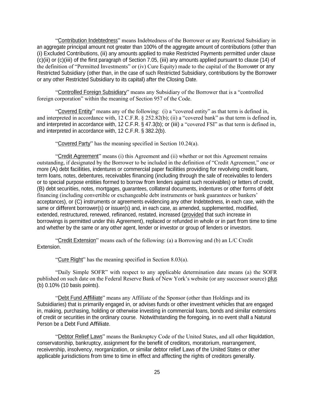 25 “Contribution Indebtedness” means Indebtedness of the Borrower or any Restricted Subsidiary in an aggregate principal amount not greater than 100% of the aggregate amount of contributions (other than (i) Excluded Contributions, (ii) any amounts applied to make Restricted Payments permitted under clause (c)(ii) or (c)(iii) of the first paragraph of Section 7.05, (iii) any amounts applied pursuant to clause (14) of the definition of “Permitted Investments” or (iv) Cure Equity) made to the capital of the Borrower or any Restricted Subsidiary (other than, in the case of such Restricted Subsidiary, contributions by the Borrower or any other Restricted Subsidiary to its capital) after the Closing Date. “Controlled Foreign Subsidiary” means any Subsidiary of the Borrower that is a “controlled foreign corporation” within the meaning of Section 957 of the Code. “Covered Entity” means any of the following: (i) a “covered entity” as that term is defined in, and interpreted in accordance with, 12 C.F.R. § 252.82(b); (ii) a “covered bank” as that term is defined in, and interpreted in accordance with, 12 C.F.R. § 47.3(b); or (iii) a “covered FSI” as that term is defined in, and interpreted in accordance with, 12 C.F.R. § 382.2(b). “Covered Party” has the meaning specified in Section 10.24(a). “Credit Agreement” means (i) this Agreement and (ii) whether or not this Agreement remains outstanding, if designated by the Borrower to be included in the definition of “Credit Agreement,” one or more (A) debt facilities, indentures or commercial paper facilities providing for revolving credit loans, term loans, notes, debentures, receivables financing (including through the sale of receivables to lenders or to special purpose entities formed to borrow from lenders against such receivables) or letters of credit, (B) debt securities, notes, mortgages, guarantees, collateral documents, indentures or other forms of debt financing (including convertible or exchangeable debt instruments or bank guarantees or bankers’ acceptances), or (C) instruments or agreements evidencing any other Indebtedness, in each case, with the same or different borrower(s) or issuer(s) and, in each case, as amended, supplemented, modified, extended, restructured, renewed, refinanced, restated, increased (provided that such increase in borrowings is permitted under this Agreement), replaced or refunded in whole or in part from time to time and whether by the same or any other agent, lender or investor or group of lenders or investors. “Credit Extension” means each of the following: (a) a Borrowing and (b) an L/C Credit Extension. “Cure Right” has the meaning specified in Section 8.03(a). “Daily Simple SOFR” with respect to any applicable determination date means (a) the SOFR published on such date on the Federal Reserve Bank of New York’s website (or any successor source) plus (b) 0.10% (10 basis points). “Debt Fund Affiliate” means any Affiliate of the Sponsor (other than Holdings and its Subsidiaries) that is primarily engaged in, or advises funds or other investment vehicles that are engaged in, making, purchasing, holding or otherwise investing in commercial loans, bonds and similar extensions of credit or securities in the ordinary course. Notwithstanding the foregoing, in no event shall a Natural Person be a Debt Fund Affiliate. “Debtor Relief Laws” means the Bankruptcy Code of the United States, and all other liquidation, conservatorship, bankruptcy, assignment for the benefit of creditors, moratorium, rearrangement, receivership, insolvency, reorganization, or similar debtor relief Laws of the United States or other applicable jurisdictions from time to time in effect and affecting the rights of creditors generally.