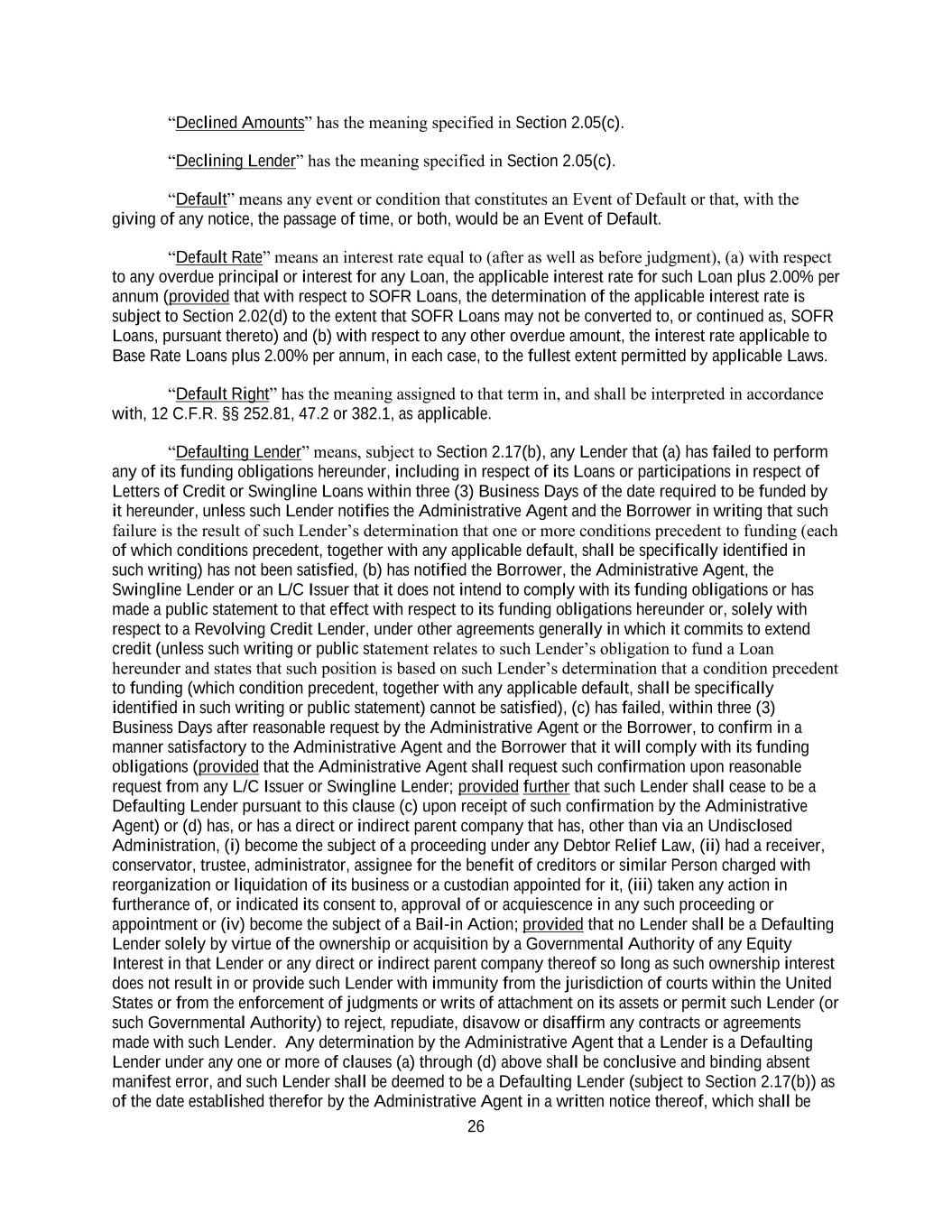 26 “Declined Amounts” has the meaning specified in Section 2.05(c). “Declining Lender” has the meaning specified in Section 2.05(c). “Default” means any event or condition that constitutes an Event of Default or that, with the giving of any notice, the passage of time, or both, would be an Event of Default. “Default Rate” means an interest rate equal to (after as well as before judgment), (a) with respect to any overdue principal or interest for any Loan, the applicable interest rate for such Loan plus 2.00% per annum (provided that with respect to SOFR Loans, the determination of the applicable interest rate is subject to Section 2.02(d) to the extent that SOFR Loans may not be converted to, or continued as, SOFR Loans, pursuant thereto) and (b) with respect to any other overdue amount, the interest rate applicable to Base Rate Loans plus 2.00% per annum, in each case, to the fullest extent permitted by applicable Laws. “Default Right” has the meaning assigned to that term in, and shall be interpreted in accordance with, 12 C.F.R. §§ 252.81, 47.2 or 382.1, as applicable. “Defaulting Lender” means, subject to Section 2.17(b), any Lender that (a) has failed to perform any of its funding obligations hereunder, including in respect of its Loans or participations in respect of Letters of Credit or Swingline Loans within three (3) Business Days of the date required to be funded by it hereunder, unless such Lender notifies the Administrative Agent and the Borrower in writing that such failure is the result of such Lender’s determination that one or more conditions precedent to funding (each of which conditions precedent, together with any applicable default, shall be specifically identified in such writing) has not been satisfied, (b) has notified the Borrower, the Administrative Agent, the Swingline Lender or an L/C Issuer that it does not intend to comply with its funding obligations or has made a public statement to that effect with respect to its funding obligations hereunder or, solely with respect to a Revolving Credit Lender, under other agreements generally in which it commits to extend credit (unless such writing or public statement relates to such Lender’s obligation to fund a Loan hereunder and states that such position is based on such Lender’s determination that a condition precedent to funding (which condition precedent, together with any applicable default, shall be specifically identified in such writing or public statement) cannot be satisfied), (c) has failed, within three (3) Business Days after reasonable request by the Administrative Agent or the Borrower, to confirm in a manner satisfactory to the Administrative Agent and the Borrower that it will comply with its funding obligations (provided that the Administrative Agent shall request such confirmation upon reasonable request from any L/C Issuer or Swingline Lender; provided further that such Lender shall cease to be a Defaulting Lender pursuant to this clause (c) upon receipt of such confirmation by the Administrative Agent) or (d) has, or has a direct or indirect parent company that has, other than via an Undisclosed Administration, (i) become the subject of a proceeding under any Debtor Relief Law, (ii) had a receiver, conservator, trustee, administrator, assignee for the benefit of creditors or similar Person charged with reorganization or liquidation of its business or a custodian appointed for it, (iii) taken any action in furtherance of, or indicated its consent to, approval of or acquiescence in any such proceeding or appointment or (iv) become the subject of a Bail-in Action; provided that no Lender shall be a Defaulting Lender solely by virtue of the ownership or acquisition by a Governmental Authority of any Equity Interest in that Lender or any direct or indirect parent company thereof so long as such ownership interest does not result in or provide such Lender with immunity from the jurisdiction of courts within the United States or from the enforcement of judgments or writs of attachment on its assets or permit such Lender (or such Governmental Authority) to reject, repudiate, disavow or disaffirm any contracts or agreements made with such Lender. Any determination by the Administrative Agent that a Lender is a Defaulting Lender under any one or more of clauses (a) through (d) above shall be conclusive and binding absent manifest error, and such Lender shall be deemed to be a Defaulting Lender (subject to Section 2.17(b)) as of the date established therefor by the Administrative Agent in a written notice thereof, which shall be