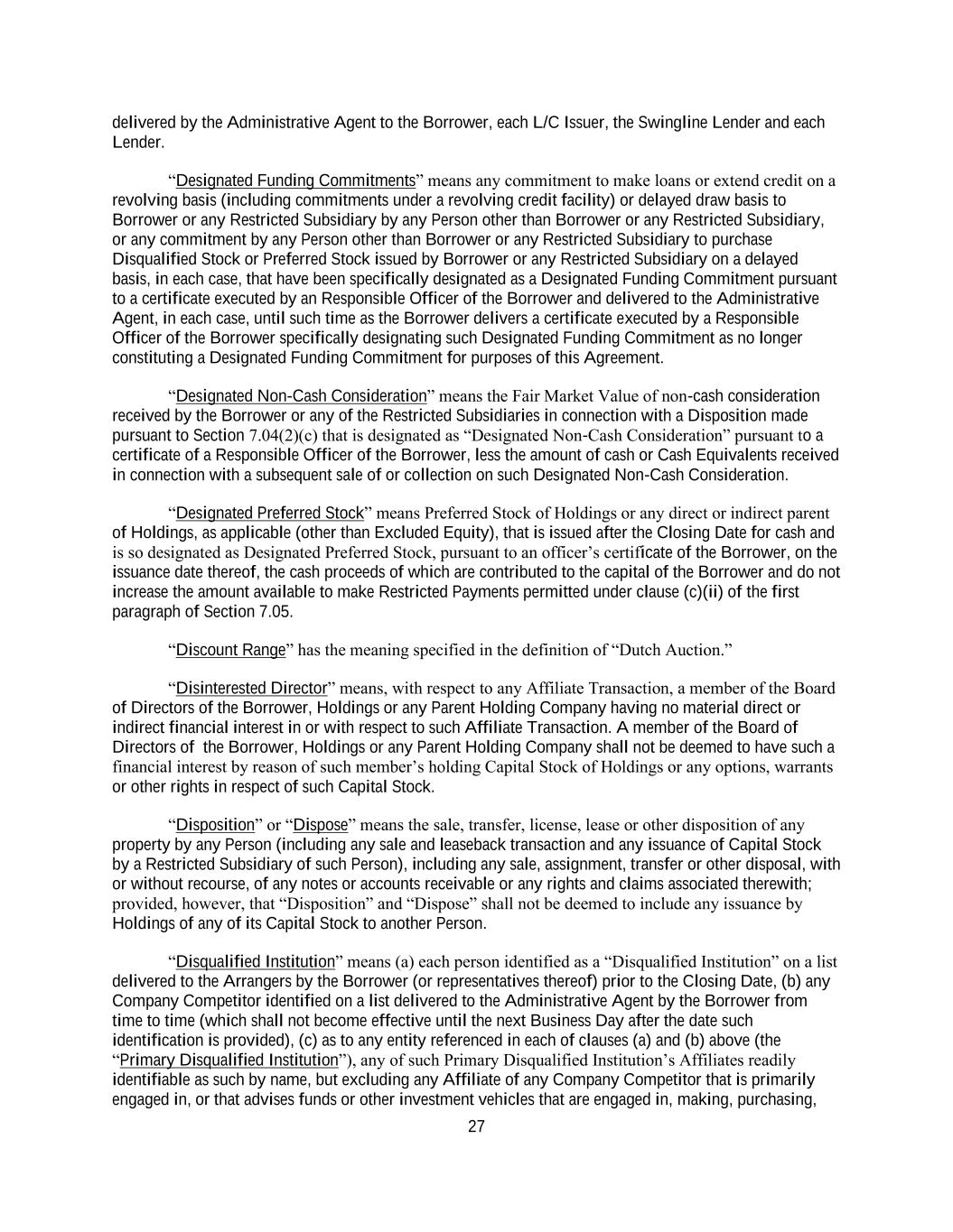 27 delivered by the Administrative Agent to the Borrower, each L/C Issuer, the Swingline Lender and each Lender. “Designated Funding Commitments” means any commitment to make loans or extend credit on a revolving basis (including commitments under a revolving credit facility) or delayed draw basis to Borrower or any Restricted Subsidiary by any Person other than Borrower or any Restricted Subsidiary, or any commitment by any Person other than Borrower or any Restricted Subsidiary to purchase Disqualified Stock or Preferred Stock issued by Borrower or any Restricted Subsidiary on a delayed basis, in each case, that have been specifically designated as a Designated Funding Commitment pursuant to a certificate executed by an Responsible Officer of the Borrower and delivered to the Administrative Agent, in each case, until such time as the Borrower delivers a certificate executed by a Responsible Officer of the Borrower specifically designating such Designated Funding Commitment as no longer constituting a Designated Funding Commitment for purposes of this Agreement. “Designated Non-Cash Consideration” means the Fair Market Value of non-cash consideration received by the Borrower or any of the Restricted Subsidiaries in connection with a Disposition made pursuant to Section 7.04(2)(c) that is designated as “Designated Non-Cash Consideration” pursuant to a certificate of a Responsible Officer of the Borrower, less the amount of cash or Cash Equivalents received in connection with a subsequent sale of or collection on such Designated Non-Cash Consideration. “Designated Preferred Stock” means Preferred Stock of Holdings or any direct or indirect parent of Holdings, as applicable (other than Excluded Equity), that is issued after the Closing Date for cash and is so designated as Designated Preferred Stock, pursuant to an officer’s certificate of the Borrower, on the issuance date thereof, the cash proceeds of which are contributed to the capital of the Borrower and do not increase the amount available to make Restricted Payments permitted under clause (c)(ii) of the first paragraph of Section 7.05. “Discount Range” has the meaning specified in the definition of “Dutch Auction.” “Disinterested Director” means, with respect to any Affiliate Transaction, a member of the Board of Directors of the Borrower, Holdings or any Parent Holding Company having no material direct or indirect financial interest in or with respect to such Affiliate Transaction. A member of the Board of Directors of the Borrower, Holdings or any Parent Holding Company shall not be deemed to have such a financial interest by reason of such member’s holding Capital Stock of Holdings or any options, warrants or other rights in respect of such Capital Stock. “Disposition” or “Dispose” means the sale, transfer, license, lease or other disposition of any property by any Person (including any sale and leaseback transaction and any issuance of Capital Stock by a Restricted Subsidiary of such Person), including any sale, assignment, transfer or other disposal, with or without recourse, of any notes or accounts receivable or any rights and claims associated therewith; provided, however, that “Disposition” and “Dispose” shall not be deemed to include any issuance by Holdings of any of its Capital Stock to another Person. “Disqualified Institution” means (a) each person identified as a “Disqualified Institution” on a list delivered to the Arrangers by the Borrower (or representatives thereof) prior to the Closing Date, (b) any Company Competitor identified on a list delivered to the Administrative Agent by the Borrower from time to time (which shall not become effective until the next Business Day after the date such identification is provided), (c) as to any entity referenced in each of clauses (a) and (b) above (the “Primary Disqualified Institution”), any of such Primary Disqualified Institution’s Affiliates readily identifiable as such by name, but excluding any Affiliate of any Company Competitor that is primarily engaged in, or that advises funds or other investment vehicles that are engaged in, making, purchasing,