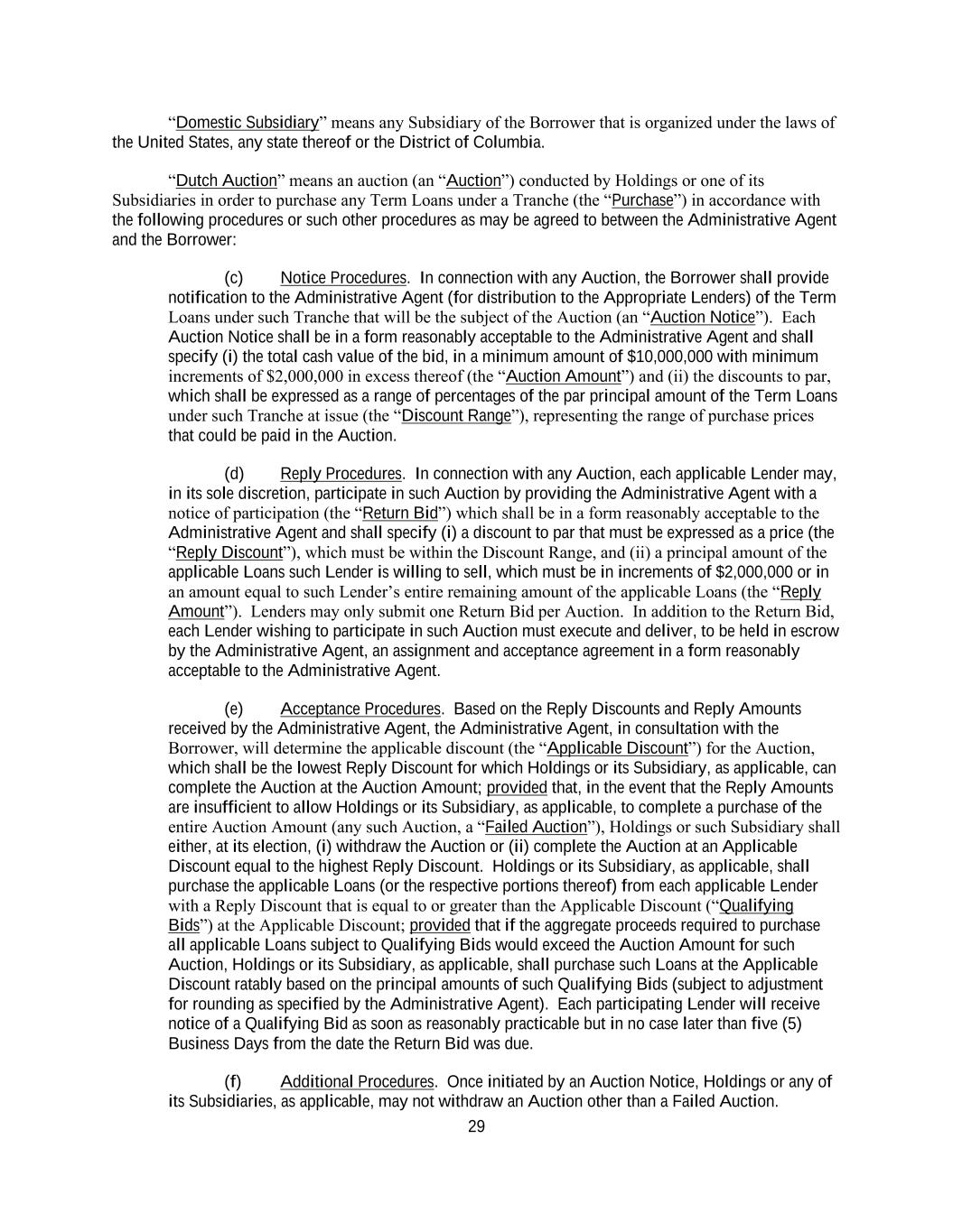 29 “Domestic Subsidiary” means any Subsidiary of the Borrower that is organized under the laws of the United States, any state thereof or the District of Columbia. “Dutch Auction” means an auction (an “Auction”) conducted by Holdings or one of its Subsidiaries in order to purchase any Term Loans under a Tranche (the “Purchase”) in accordance with the following procedures or such other procedures as may be agreed to between the Administrative Agent and the Borrower: (c) Notice Procedures. In connection with any Auction, the Borrower shall provide notification to the Administrative Agent (for distribution to the Appropriate Lenders) of the Term Loans under such Tranche that will be the subject of the Auction (an “Auction Notice”). Each Auction Notice shall be in a form reasonably acceptable to the Administrative Agent and shall specify (i) the total cash value of the bid, in a minimum amount of $10,000,000 with minimum increments of $2,000,000 in excess thereof (the “Auction Amount”) and (ii) the discounts to par, which shall be expressed as a range of percentages of the par principal amount of the Term Loans under such Tranche at issue (the “Discount Range”), representing the range of purchase prices that could be paid in the Auction. (d) Reply Procedures. In connection with any Auction, each applicable Lender may, in its sole discretion, participate in such Auction by providing the Administrative Agent with a notice of participation (the “Return Bid”) which shall be in a form reasonably acceptable to the Administrative Agent and shall specify (i) a discount to par that must be expressed as a price (the “Reply Discount”), which must be within the Discount Range, and (ii) a principal amount of the applicable Loans such Lender is willing to sell, which must be in increments of $2,000,000 or in an amount equal to such Lender’s entire remaining amount of the applicable Loans (the “Reply Amount”). Lenders may only submit one Return Bid per Auction. In addition to the Return Bid, each Lender wishing to participate in such Auction must execute and deliver, to be held in escrow by the Administrative Agent, an assignment and acceptance agreement in a form reasonably acceptable to the Administrative Agent. (e) Acceptance Procedures. Based on the Reply Discounts and Reply Amounts received by the Administrative Agent, the Administrative Agent, in consultation with the Borrower, will determine the applicable discount (the “Applicable Discount”) for the Auction, which shall be the lowest Reply Discount for which Holdings or its Subsidiary, as applicable, can complete the Auction at the Auction Amount; provided that, in the event that the Reply Amounts are insufficient to allow Holdings or its Subsidiary, as applicable, to complete a purchase of the entire Auction Amount (any such Auction, a “Failed Auction”), Holdings or such Subsidiary shall either, at its election, (i) withdraw the Auction or (ii) complete the Auction at an Applicable Discount equal to the highest Reply Discount. Holdings or its Subsidiary, as applicable, shall purchase the applicable Loans (or the respective portions thereof) from each applicable Lender with a Reply Discount that is equal to or greater than the Applicable Discount (“Qualifying Bids”) at the Applicable Discount; provided that if the aggregate proceeds required to purchase all applicable Loans subject to Qualifying Bids would exceed the Auction Amount for such Auction, Holdings or its Subsidiary, as applicable, shall purchase such Loans at the Applicable Discount ratably based on the principal amounts of such Qualifying Bids (subject to adjustment for rounding as specified by the Administrative Agent). Each participating Lender will receive notice of a Qualifying Bid as soon as reasonably practicable but in no case later than five (5) Business Days from the date the Return Bid was due. (f) Additional Procedures. Once initiated by an Auction Notice, Holdings or any of its Subsidiaries, as applicable, may not withdraw an Auction other than a Failed Auction.