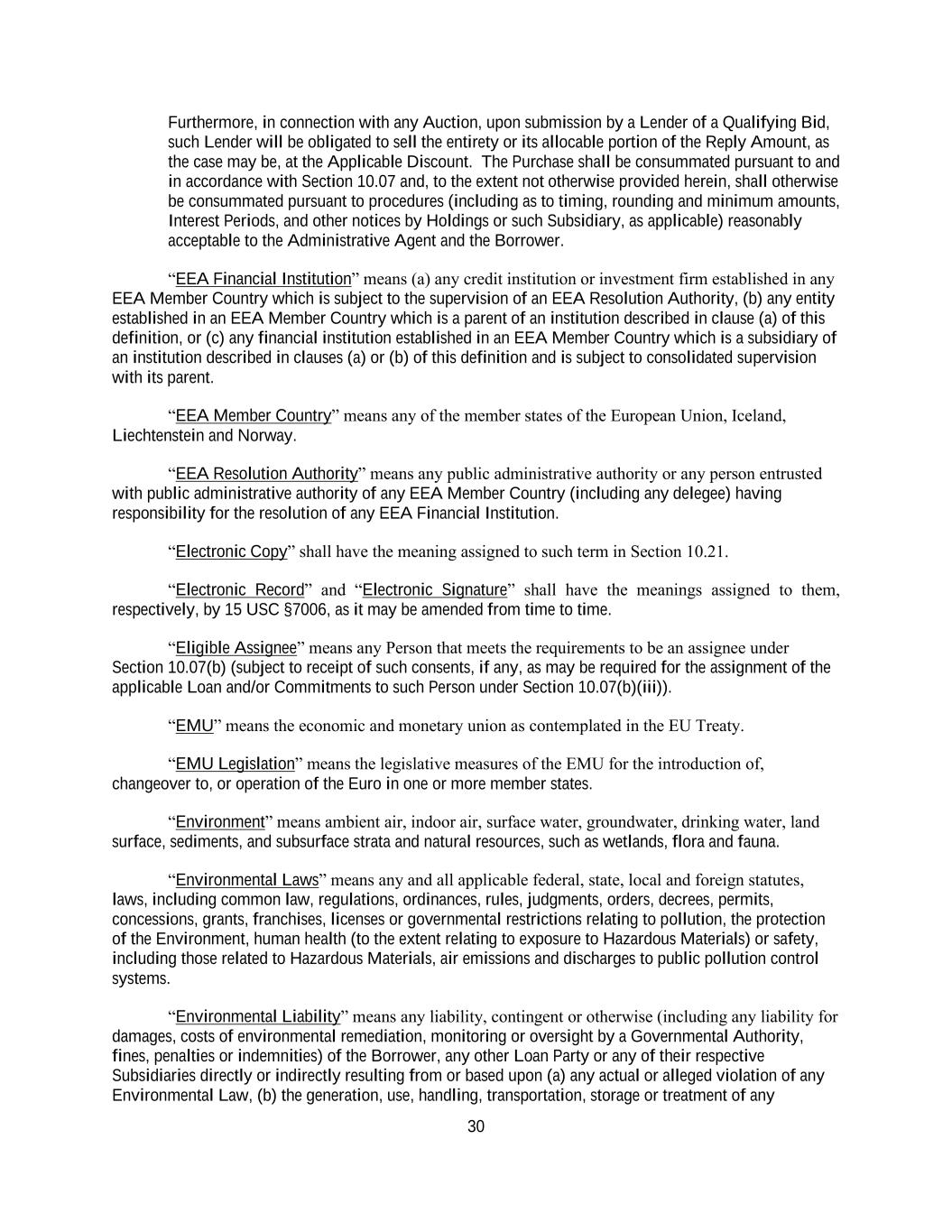 30 Furthermore, in connection with any Auction, upon submission by a Lender of a Qualifying Bid, such Lender will be obligated to sell the entirety or its allocable portion of the Reply Amount, as the case may be, at the Applicable Discount. The Purchase shall be consummated pursuant to and in accordance with Section 10.07 and, to the extent not otherwise provided herein, shall otherwise be consummated pursuant to procedures (including as to timing, rounding and minimum amounts, Interest Periods, and other notices by Holdings or such Subsidiary, as applicable) reasonably acceptable to the Administrative Agent and the Borrower. “EEA Financial Institution” means (a) any credit institution or investment firm established in any EEA Member Country which is subject to the supervision of an EEA Resolution Authority, (b) any entity established in an EEA Member Country which is a parent of an institution described in clause (a) of this definition, or (c) any financial institution established in an EEA Member Country which is a subsidiary of an institution described in clauses (a) or (b) of this definition and is subject to consolidated supervision with its parent. “EEA Member Country” means any of the member states of the European Union, Iceland, Liechtenstein and Norway. “EEA Resolution Authority” means any public administrative authority or any person entrusted with public administrative authority of any EEA Member Country (including any delegee) having responsibility for the resolution of any EEA Financial Institution. “Electronic Copy” shall have the meaning assigned to such term in Section 10.21. “Electronic Record” and “Electronic Signature” shall have the meanings assigned to them, respectively, by 15 USC §7006, as it may be amended from time to time. “Eligible Assignee” means any Person that meets the requirements to be an assignee under Section 10.07(b) (subject to receipt of such consents, if any, as may be required for the assignment of the applicable Loan and/or Commitments to such Person under Section 10.07(b)(iii)). “EMU” means the economic and monetary union as contemplated in the EU Treaty. “EMU Legislation” means the legislative measures of the EMU for the introduction of, changeover to, or operation of the Euro in one or more member states. “Environment” means ambient air, indoor air, surface water, groundwater, drinking water, land surface, sediments, and subsurface strata and natural resources, such as wetlands, flora and fauna. “Environmental Laws” means any and all applicable federal, state, local and foreign statutes, laws, including common law, regulations, ordinances, rules, judgments, orders, decrees, permits, concessions, grants, franchises, licenses or governmental restrictions relating to pollution, the protection of the Environment, human health (to the extent relating to exposure to Hazardous Materials) or safety, including those related to Hazardous Materials, air emissions and discharges to public pollution control systems. “Environmental Liability” means any liability, contingent or otherwise (including any liability for damages, costs of environmental remediation, monitoring or oversight by a Governmental Authority, fines, penalties or indemnities) of the Borrower, any other Loan Party or any of their respective Subsidiaries directly or indirectly resulting from or based upon (a) any actual or alleged violation of any Environmental Law, (b) the generation, use, handling, transportation, storage or treatment of any