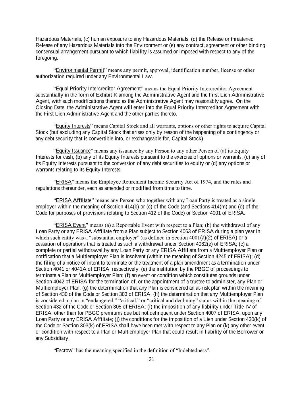 31 Hazardous Materials, (c) human exposure to any Hazardous Materials, (d) the Release or threatened Release of any Hazardous Materials into the Environment or (e) any contract, agreement or other binding consensual arrangement pursuant to which liability is assumed or imposed with respect to any of the foregoing. “Environmental Permit” means any permit, approval, identification number, license or other authorization required under any Environmental Law. “Equal Priority Intercreditor Agreement” means the Equal Priority Intercreditor Agreement substantially in the form of Exhibit K among the Administrative Agent and the First Lien Administrative Agent, with such modifications thereto as the Administrative Agent may reasonably agree. On the Closing Date, the Administrative Agent will enter into the Equal Priority Intercreditor Agreement with the First Lien Administrative Agent and the other parties thereto. “Equity Interests” means Capital Stock and all warrants, options or other rights to acquire Capital Stock (but excluding any Capital Stock that arises only by reason of the happening of a contingency or any debt security that is convertible into, or exchangeable for, Capital Stock). “Equity Issuance” means any issuance by any Person to any other Person of (a) its Equity Interests for cash, (b) any of its Equity Interests pursuant to the exercise of options or warrants, (c) any of its Equity Interests pursuant to the conversion of any debt securities to equity or (d) any options or warrants relating to its Equity Interests. “ERISA” means the Employee Retirement Income Security Act of 1974, and the rules and regulations thereunder, each as amended or modified from time to time. “ERISA Affiliate” means any Person who together with any Loan Party is treated as a single employer within the meaning of Section 414(b) or (c) of the Code (and Sections 414(m) and (o) of the Code for purposes of provisions relating to Section 412 of the Code) or Section 4001 of ERISA. “ERISA Event” means (a) a Reportable Event with respect to a Plan; (b) the withdrawal of any Loan Party or any ERISA Affiliate from a Plan subject to Section 4063 of ERISA during a plan year in which such entity was a “substantial employer” (as defined in Section 4001(a)(2) of ERISA) or a cessation of operations that is treated as such a withdrawal under Section 4062(e) of ERISA; (c) a complete or partial withdrawal by any Loan Party or any ERISA Affiliate from a Multiemployer Plan or notification that a Multiemployer Plan is insolvent (within the meaning of Section 4245 of ERISA); (d) the filing of a notice of intent to terminate or the treatment of a plan amendment as a termination under Section 4041 or 4041A of ERISA, respectively, (e) the institution by the PBGC of proceedings to terminate a Plan or Multiemployer Plan; (f) an event or condition which constitutes grounds under Section 4042 of ERISA for the termination of, or the appointment of a trustee to administer, any Plan or Multiemployer Plan; (g) the determination that any Plan is considered an at-risk plan within the meaning of Section 430 of the Code or Section 303 of ERISA; (h) the determination that any Multiemployer Plan is considered a plan in “endangered,” “critical,” or “critical and declining” status within the meaning of Section 432 of the Code or Section 305 of ERISA; (i) the imposition of any liability under Title IV of ERISA, other than for PBGC premiums due but not delinquent under Section 4007 of ERISA, upon any Loan Party or any ERISA Affiliate; (j) the conditions for the imposition of a Lien under Section 430(k) of the Code or Section 303(k) of ERISA shall have been met with respect to any Plan or (k) any other event or condition with respect to a Plan or Multiemployer Plan that could result in liability of the Borrower or any Subsidiary. “Escrow” has the meaning specified in the definition of “Indebtedness”.
