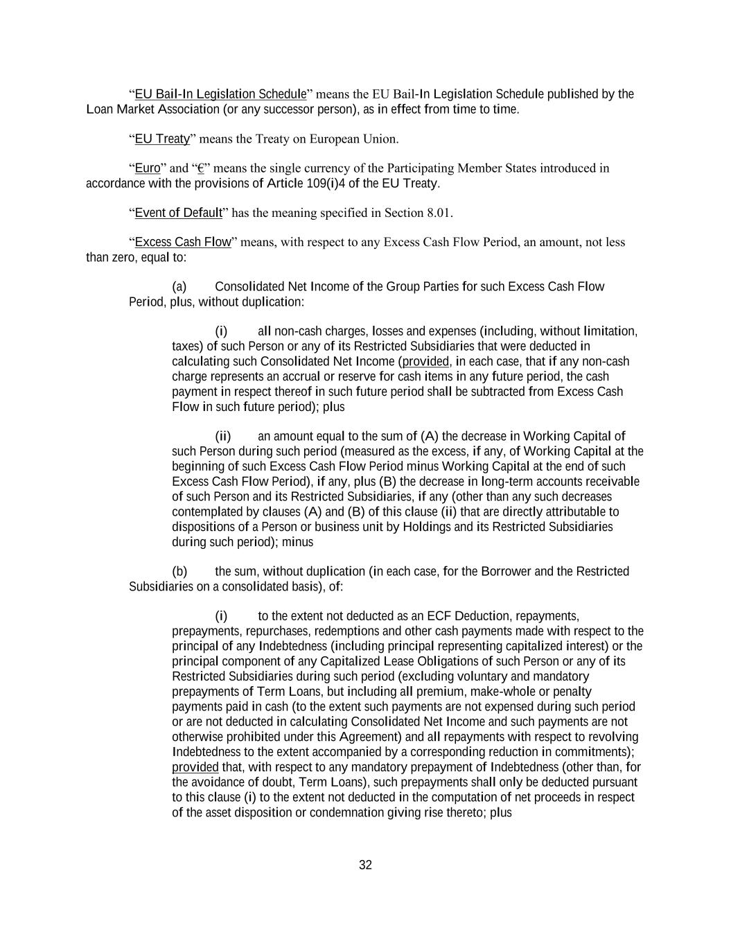 32 “EU Bail-In Legislation Schedule” means the EU Bail-In Legislation Schedule published by the Loan Market Association (or any successor person), as in effect from time to time. “EU Treaty” means the Treaty on European Union. “Euro” and “€” means the single currency of the Participating Member States introduced in accordance with the provisions of Article 109(i)4 of the EU Treaty. “Event of Default” has the meaning specified in Section 8.01. “Excess Cash Flow” means, with respect to any Excess Cash Flow Period, an amount, not less than zero, equal to: (a) Consolidated Net Income of the Group Parties for such Excess Cash Flow Period, plus, without duplication: (i) all non-cash charges, losses and expenses (including, without limitation, taxes) of such Person or any of its Restricted Subsidiaries that were deducted in calculating such Consolidated Net Income (provided, in each case, that if any non-cash charge represents an accrual or reserve for cash items in any future period, the cash payment in respect thereof in such future period shall be subtracted from Excess Cash Flow in such future period); plus (ii) an amount equal to the sum of (A) the decrease in Working Capital of such Person during such period (measured as the excess, if any, of Working Capital at the beginning of such Excess Cash Flow Period minus Working Capital at the end of such Excess Cash Flow Period), if any, plus (B) the decrease in long-term accounts receivable of such Person and its Restricted Subsidiaries, if any (other than any such decreases contemplated by clauses (A) and (B) of this clause (ii) that are directly attributable to dispositions of a Person or business unit by Holdings and its Restricted Subsidiaries during such period); minus (b) the sum, without duplication (in each case, for the Borrower and the Restricted Subsidiaries on a consolidated basis), of: (i) to the extent not deducted as an ECF Deduction, repayments, prepayments, repurchases, redemptions and other cash payments made with respect to the principal of any Indebtedness (including principal representing capitalized interest) or the principal component of any Capitalized Lease Obligations of such Person or any of its Restricted Subsidiaries during such period (excluding voluntary and mandatory prepayments of Term Loans, but including all premium, make-whole or penalty payments paid in cash (to the extent such payments are not expensed during such period or are not deducted in calculating Consolidated Net Income and such payments are not otherwise prohibited under this Agreement) and all repayments with respect to revolving Indebtedness to the extent accompanied by a corresponding reduction in commitments); provided that, with respect to any mandatory prepayment of Indebtedness (other than, for the avoidance of doubt, Term Loans), such prepayments shall only be deducted pursuant to this clause (i) to the extent not deducted in the computation of net proceeds in respect of the asset disposition or condemnation giving rise thereto; plus