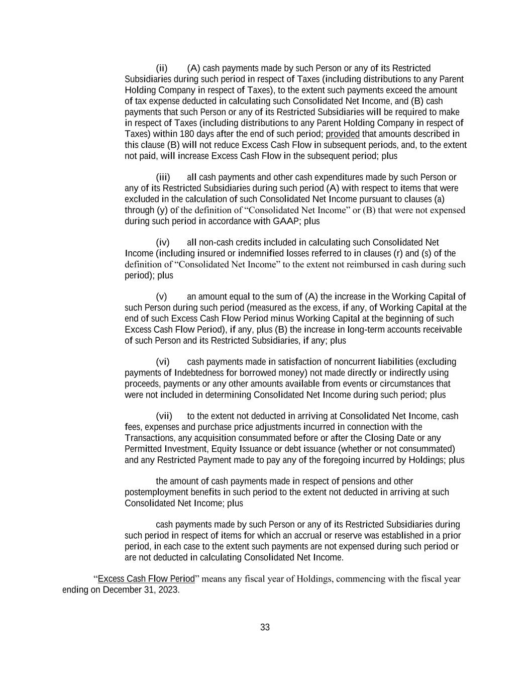 33 (ii) (A) cash payments made by such Person or any of its Restricted Subsidiaries during such period in respect of Taxes (including distributions to any Parent Holding Company in respect of Taxes), to the extent such payments exceed the amount of tax expense deducted in calculating such Consolidated Net Income, and (B) cash payments that such Person or any of its Restricted Subsidiaries will be required to make in respect of Taxes (including distributions to any Parent Holding Company in respect of Taxes) within 180 days after the end of such period; provided that amounts described in this clause (B) will not reduce Excess Cash Flow in subsequent periods, and, to the extent not paid, will increase Excess Cash Flow in the subsequent period; plus (iii) all cash payments and other cash expenditures made by such Person or any of its Restricted Subsidiaries during such period (A) with respect to items that were excluded in the calculation of such Consolidated Net Income pursuant to clauses (a) through (y) of the definition of “Consolidated Net Income” or (B) that were not expensed during such period in accordance with GAAP; plus (iv) all non-cash credits included in calculating such Consolidated Net Income (including insured or indemnified losses referred to in clauses (r) and (s) of the definition of “Consolidated Net Income” to the extent not reimbursed in cash during such period); plus (v) an amount equal to the sum of (A) the increase in the Working Capital of such Person during such period (measured as the excess, if any, of Working Capital at the end of such Excess Cash Flow Period minus Working Capital at the beginning of such Excess Cash Flow Period), if any, plus (B) the increase in long-term accounts receivable of such Person and its Restricted Subsidiaries, if any; plus (vi) cash payments made in satisfaction of noncurrent liabilities (excluding payments of Indebtedness for borrowed money) not made directly or indirectly using proceeds, payments or any other amounts available from events or circumstances that were not included in determining Consolidated Net Income during such period; plus (vii) to the extent not deducted in arriving at Consolidated Net Income, cash fees, expenses and purchase price adjustments incurred in connection with the Transactions, any acquisition consummated before or after the Closing Date or any Permitted Investment, Equity Issuance or debt issuance (whether or not consummated) and any Restricted Payment made to pay any of the foregoing incurred by Holdings; plus the amount of cash payments made in respect of pensions and other postemployment benefits in such period to the extent not deducted in arriving at such Consolidated Net Income; plus cash payments made by such Person or any of its Restricted Subsidiaries during such period in respect of items for which an accrual or reserve was established in a prior period, in each case to the extent such payments are not expensed during such period or are not deducted in calculating Consolidated Net Income. “Excess Cash Flow Period” means any fiscal year of Holdings, commencing with the fiscal year ending on December 31, 2023.