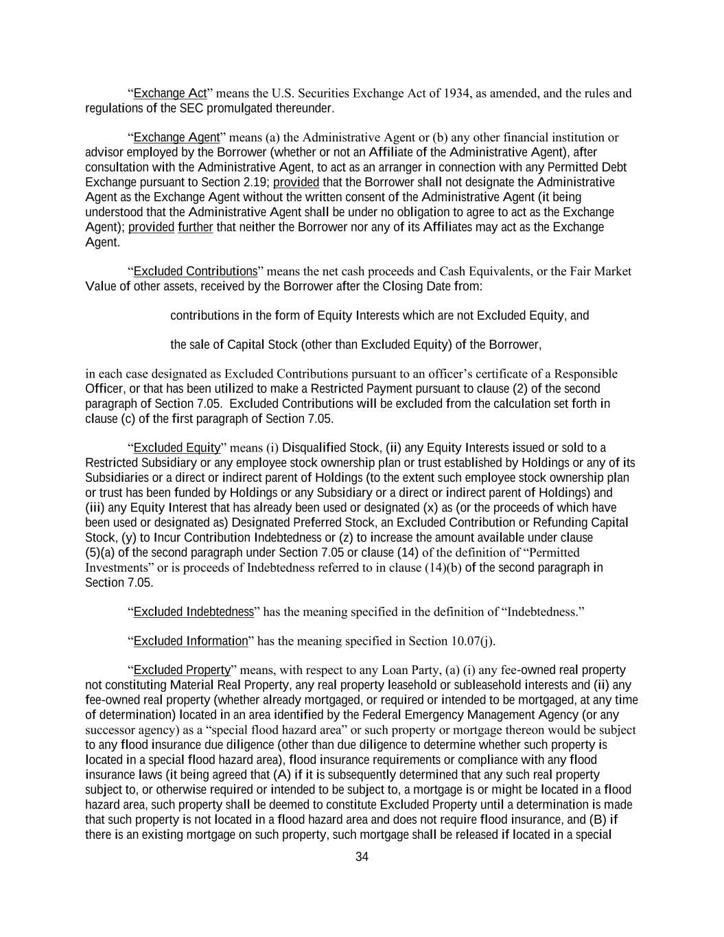 34 “Exchange Act” means the U.S. Securities Exchange Act of 1934, as amended, and the rules and regulations of the SEC promulgated thereunder. “Exchange Agent” means (a) the Administrative Agent or (b) any other financial institution or advisor employed by the Borrower (whether or not an Affiliate of the Administrative Agent), after consultation with the Administrative Agent, to act as an arranger in connection with any Permitted Debt Exchange pursuant to Section 2.19; provided that the Borrower shall not designate the Administrative Agent as the Exchange Agent without the written consent of the Administrative Agent (it being understood that the Administrative Agent shall be under no obligation to agree to act as the Exchange Agent); provided further that neither the Borrower nor any of its Affiliates may act as the Exchange Agent. “Excluded Contributions” means the net cash proceeds and Cash Equivalents, or the Fair Market Value of other assets, received by the Borrower after the Closing Date from: contributions in the form of Equity Interests which are not Excluded Equity, and the sale of Capital Stock (other than Excluded Equity) of the Borrower, in each case designated as Excluded Contributions pursuant to an officer’s certificate of a Responsible Officer, or that has been utilized to make a Restricted Payment pursuant to clause (2) of the second paragraph of Section 7.05. Excluded Contributions will be excluded from the calculation set forth in clause (c) of the first paragraph of Section 7.05. “Excluded Equity” means (i) Disqualified Stock, (ii) any Equity Interests issued or sold to a Restricted Subsidiary or any employee stock ownership plan or trust established by Holdings or any of its Subsidiaries or a direct or indirect parent of Holdings (to the extent such employee stock ownership plan or trust has been funded by Holdings or any Subsidiary or a direct or indirect parent of Holdings) and (iii) any Equity Interest that has already been used or designated (x) as (or the proceeds of which have been used or designated as) Designated Preferred Stock, an Excluded Contribution or Refunding Capital Stock, (y) to Incur Contribution Indebtedness or (z) to increase the amount available under clause (5)(a) of the second paragraph under Section 7.05 or clause (14) of the definition of “Permitted Investments” or is proceeds of Indebtedness referred to in clause (14)(b) of the second paragraph in Section 7.05. “Excluded Indebtedness” has the meaning specified in the definition of “Indebtedness.” “Excluded Information” has the meaning specified in Section 10.07(j). “Excluded Property” means, with respect to any Loan Party, (a) (i) any fee-owned real property not constituting Material Real Property, any real property leasehold or subleasehold interests and (ii) any fee-owned real property (whether already mortgaged, or required or intended to be mortgaged, at any time of determination) located in an area identified by the Federal Emergency Management Agency (or any successor agency) as a “special flood hazard area” or such property or mortgage thereon would be subject to any flood insurance due diligence (other than due diligence to determine whether such property is located in a special flood hazard area), flood insurance requirements or compliance with any flood insurance laws (it being agreed that (A) if it is subsequently determined that any such real property subject to, or otherwise required or intended to be subject to, a mortgage is or might be located in a flood hazard area, such property shall be deemed to constitute Excluded Property until a determination is made that such property is not located in a flood hazard area and does not require flood insurance, and (B) if there is an existing mortgage on such property, such mortgage shall be released if located in a special