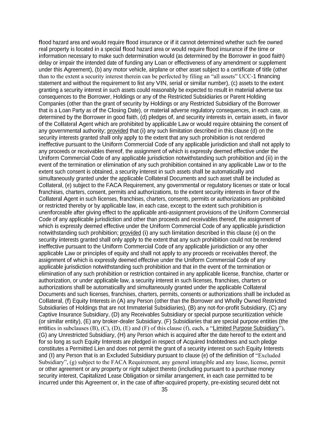 35 flood hazard area and would require flood insurance or if it cannot determined whether such fee owned real property is located in a special flood hazard area or would require flood insurance if the time or information necessary to make such determination would (as determined by the Borrower in good faith) delay or impair the intended date of funding any Loan or effectiveness of any amendment or supplement under this Agreement), (b) any motor vehicle, airplane or other asset subject to a certificate of title (other than to the extent a security interest therein can be perfected by filing an “all assets” UCC-1 financing statement and without the requirement to list any VIN, serial or similar number), (c) assets to the extent granting a security interest in such assets could reasonably be expected to result in material adverse tax consequences to the Borrower, Holdings or any of the Restricted Subsidiaries or Parent Holding Companies (other than the grant of security by Holdings or any Restricted Subsidiary of the Borrower that is a Loan Party as of the Closing Date), or material adverse regulatory consequences, in each case, as determined by the Borrower in good faith, (d) pledges of, and security interests in, certain assets, in favor of the Collateral Agent which are prohibited by applicable Law or would require obtaining the consent of any governmental authority; provided that (i) any such limitation described in this clause (d) on the security interests granted shall only apply to the extent that any such prohibition is not rendered ineffective pursuant to the Uniform Commercial Code of any applicable jurisdiction and shall not apply to any proceeds or receivables thereof, the assignment of which is expressly deemed effective under the Uniform Commercial Code of any applicable jurisdiction notwithstanding such prohibition and (ii) in the event of the termination or elimination of any such prohibition contained in any applicable Law or to the extent such consent is obtained, a security interest in such assets shall be automatically and simultaneously granted under the applicable Collateral Documents and such asset shall be included as Collateral, (e) subject to the FACA Requirement, any governmental or regulatory licenses or state or local franchises, charters, consent, permits and authorizations, to the extent security interests in favor of the Collateral Agent in such licenses, franchises, charters, consents, permits or authorizations are prohibited or restricted thereby or by applicable law, in each case, except to the extent such prohibition is unenforceable after giving effect to the applicable anti-assignment provisions of the Uniform Commercial Code of any applicable jurisdiction and other than proceeds and receivables thereof, the assignment of which is expressly deemed effective under the Uniform Commercial Code of any applicable jurisdiction notwithstanding such prohibition; provided (i) any such limitation described in this clause (e) on the security interests granted shall only apply to the extent that any such prohibition could not be rendered ineffective pursuant to the Uniform Commercial Code of any applicable jurisdiction or any other applicable Law or principles of equity and shall not apply to any proceeds or receivables thereof, the assignment of which is expressly deemed effective under the Uniform Commercial Code of any applicable jurisdiction notwithstanding such prohibition and that in the event of the termination or elimination of any such prohibition or restriction contained in any applicable license, franchise, charter or authorization, or under applicable law, a security interest in such licenses, franchises, charters or authorizations shall be automatically and simultaneously granted under the applicable Collateral Documents and such licenses, franchises, charters, permits, consents or authorizations shall be included as Collateral, (f) Equity Interests in (A) any Person (other than the Borrower and Wholly Owned Restricted Subsidiaries of Holdings that are not Immaterial Subsidiaries), (B) any not-for-profit Subsidiary, (C) any Captive Insurance Subsidiary, (D) any Receivables Subsidiary or special purpose securitization vehicle (or similar entity), (E) any broker-dealer Subsidiary, (F) Subsidiaries that are special purpose entities (the entities in subclauses (B), (C), (D), (E) and (F) of this clause (f), each, a “Limited Purpose Subsidiary”), (G) any Unrestricted Subsidiary, (H) any Person which is acquired after the date hereof to the extent and for so long as such Equity Interests are pledged in respect of Acquired Indebtedness and such pledge constitutes a Permitted Lien and does not permit the grant of a security interest on such Equity Interests and (I) any Person that is an Excluded Subsidiary pursuant to clause (e) of the definition of “Excluded Subsidiary”, (g) subject to the FACA Requirement, any general intangible and any lease, license, permit or other agreement or any property or right subject thereto (including pursuant to a purchase money security interest, Capitalized Lease Obligation or similar arrangement, in each case permitted to be incurred under this Agreement or, in the case of after-acquired property, pre-existing secured debt not