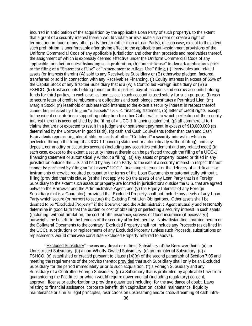 36 incurred in anticipation of the acquisition by the applicable Loan Party of such property), to the extent that a grant of a security interest therein would violate or invalidate such item or create a right of termination in favor of any other party thereto (other than a Loan Party), in each case, except to the extent such prohibition is unenforceable after giving effect to the applicable anti-assignment provisions of the Uniform Commercial Code of any applicable jurisdiction and other than proceeds and receivables thereof, the assignment of which is expressly deemed effective under the Uniform Commercial Code of any applicable jurisdiction notwithstanding such prohibition, (h) “intent-to-use” trademark applications prior to the filing of a “Statement of Use” or “Amendment to Allege Use” filing, (i) receivables and related assets (or interests therein) (A) sold to any Receivables Subsidiary or (B) otherwise pledged, factored, transferred or sold in connection with any Receivables Financing, (j) Equity Interests in excess of 65% of the Capital Stock of any first-tier Subsidiary that is a (A) a Controlled Foreign Subsidiary or (B) a FSHCO, (k) trust accounts holding funds for third parties, payroll accounts and escrow accounts holding funds for third parties, in each case, as long as each such account is used solely for such purpose, (l) cash to secure letter of credit reimbursement obligations and such pledge constitutes a Permitted Lien, (m) Margin Stock, (n) leasehold or subleasehold interests to the extent a security interest in respect thereof cannot be perfected by filing an “all-assets” UCC-1 financing statement, (o) letter of credit rights, except to the extent constituting a supporting obligation for other Collateral as to which perfection of the security interest therein is accomplished by the filing of a UCC-1 financing statement, (p) all commercial tort claims that are not expected to result in a judgment or settlement payment in excess of $10,000,000 (as determined by the Borrower in good faith), (q) cash and Cash Equivalents (other than cash and Cash Equivalents representing identifiable proceeds of other “Collateral” a security interest in which is perfected through the filing of a UCC-1 financing statement or automatically without filing), and any deposit, commodity or securities account (including any securities entitlement and any related asset) (in each case, except to the extent a security interest therein can be perfected through the filing of a UCC-1 financing statement or automatically without a filing), (s) any assets or property located or titled in any jurisdiction outside the U.S. and held by any Loan Party, to the extent a security interest in respect thereof cannot be perfected by filing an “all-assets” UCC-1 financing statement or the delivery of certificates or instruments otherwise required pursuant to the terms of the Loan Documents or automatically without a filing (provided that this clause (s) shall not apply to (x) the assets of any Loan Party that is a Foreign Subsidiary to the extent such assets or property are located in jurisdictions outside the U.S. that are agreed between the Borrower and the Administrative Agent, and (y) the Equity Interests of any Foreign Subsidiary that is a Guarantor); provided that Excluded Property shall not include any assets of any Loan Party which secure (or purport to secure) the Existing First Lien Obligations. Other assets shall be deemed to be “Excluded Property” if the Borrower and the Administrative Agent mutually and reasonably determine in good faith that the burden or cost of obtaining or perfecting a security interest in such assets (including, without limitation, the cost of title insurance, surveys or flood insurance (if necessary)) outweighs the benefit to the Lenders of the security afforded thereby. Notwithstanding anything herein or the Collateral Documents to the contrary, Excluded Property shall not include any Proceeds (as defined in the UCC), substitutions or replacements of any Excluded Property (unless such Proceeds, substitutions or replacements would otherwise constitute Excluded Property referred to above). “Excluded Subsidiary” means any direct or indirect Subsidiary of the Borrower that is (a) an Unrestricted Subsidiary, (b) a non-Wholly-Owned Subsidiary, (c) an Immaterial Subsidiary, (d) a FSHCO, (e) established or created pursuant to clause (14)(g) of the second paragraph of Section 7.05 and meeting the requirements of the proviso thereto; provided that such Subsidiary shall only be an Excluded Subsidiary for the period immediately prior to such acquisition, (f) a Foreign Subsidiary and any Subsidiary of a Controlled Foreign Subsidiary; (g) a Subsidiary that is prohibited by applicable Law from guaranteeing the Facilities, or which would require governmental (including regulatory) consent, approval, license or authorization to provide a guarantee (including, for the avoidance of doubt, Laws relating to financial assistance, corporate benefit, thin capitalization, capital maintenance, liquidity maintenance or similar legal principles, restrictions on upstreaming and/or cross-streaming of cash intra-