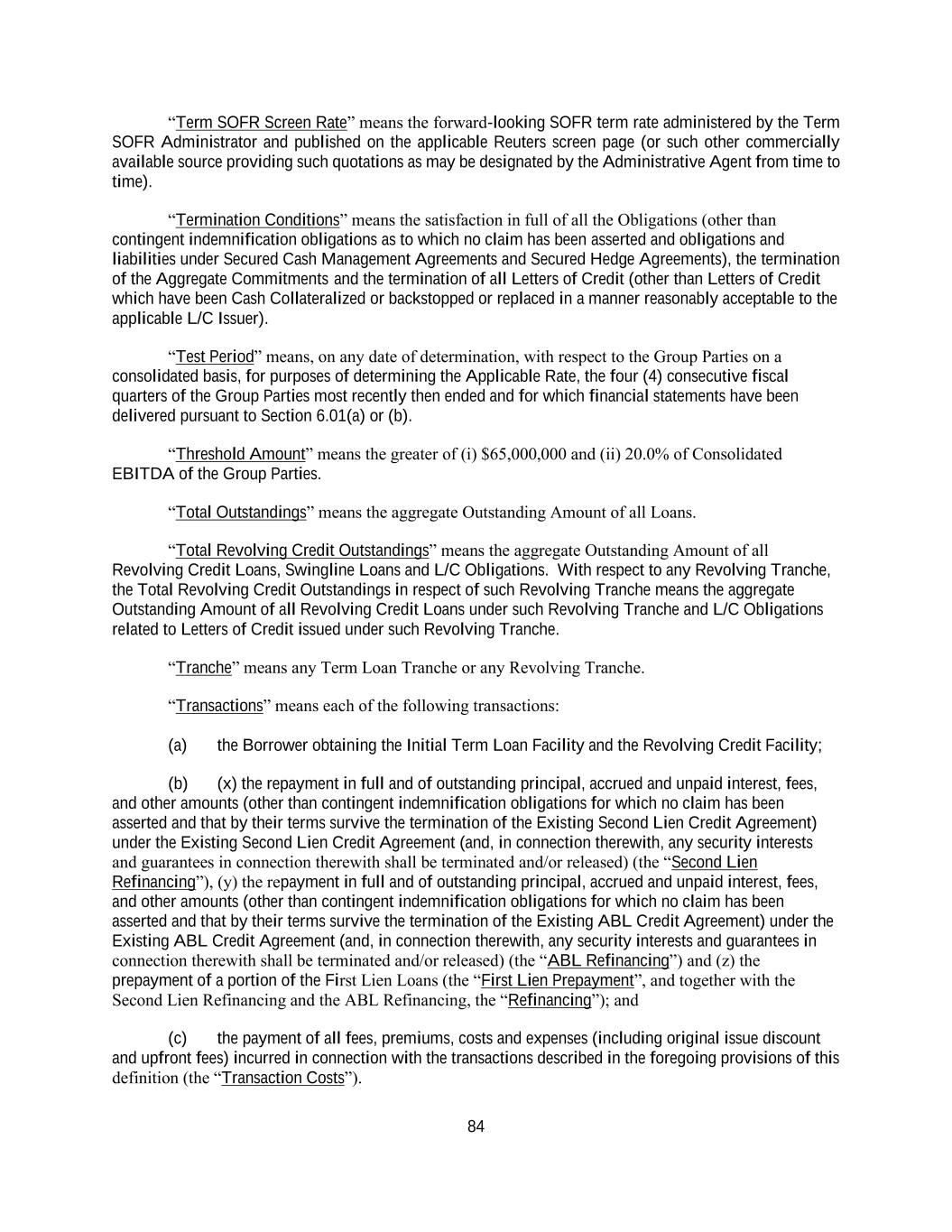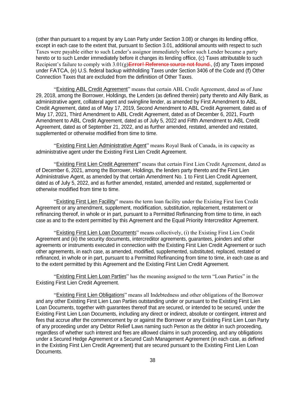 38 (other than pursuant to a request by any Loan Party under Section 3.08) or changes its lending office, except in each case to the extent that, pursuant to Section 3.01, additional amounts with respect to such Taxes were payable either to such Lender’s assignor immediately before such Lender became a party hereto or to such Lender immediately before it changes its lending office, (c) Taxes attributable to such Recipient’s failure to comply with 3.01(g)Error! Reference source not found., (d) any Taxes imposed under FATCA, (e) U.S. federal backup withholding Taxes under Section 3406 of the Code and (f) Other Connection Taxes that are excluded from the definition of Other Taxes. “Existing ABL Credit Agreement” means that certain ABL Credit Agreement, dated as of June 29, 2018, among the Borrower, Holdings, the Lenders (as defined therein) party thereto and Ally Bank, as administrative agent, collateral agent and swingline lender, as amended by First Amendment to ABL Credit Agreement, dated as of May 17, 2019, Second Amendment to ABL Credit Agreement, dated as of May 17, 2021, Third Amendment to ABL Credit Agreement, dated as of December 6, 2021, Fourth Amendment to ABL Credit Agreement, dated as of July 5, 2022 and Fifth Amendment to ABL Credit Agreement, dated as of September 21, 2022, and as further amended, restated, amended and restated, supplemented or otherwise modified from time to time. “Existing First Lien Administrative Agent” means Royal Bank of Canada, in its capacity as administrative agent under the Existing First Lien Credit Agreement. “Existing First Lien Credit Agreement” means that certain First Lien Credit Agreement, dated as of December 6, 2021, among the Borrower, Holdings, the lenders party thereto and the First Lien Administrative Agent, as amended by that certain Amendment No. 1 to First Lien Credit Agreement, dated as of July 5, 2022, and as further amended, restated, amended and restated, supplemented or otherwise modified from time to time. “Existing First Lien Facility” means the term loan facility under the Existing First lien Credit Agreement or any amendment, supplement, modification, substitution, replacement, restatement or refinancing thereof, in whole or in part, pursuant to a Permitted Refinancing from time to time, in each case as and to the extent permitted by this Agreement and the Equal Priority Intercreditor Agreement. “Existing First Lien Loan Documents” means collectively, (i) the Existing First Lien Credit Agreement and (ii) the security documents, intercreditor agreements, guarantees, joinders and other agreements or instruments executed in connection with the Existing First Lien Credit Agreement or such other agreements, in each case, as amended, modified, supplemented, substituted, replaced, restated or refinanced, in whole or in part, pursuant to a Permitted Refinancing from time to time, in each case as and to the extent permitted by this Agreement and the Existing First Lien Credit Agreement. “Existing First Lien Loan Parties” has the meaning assigned to the term “Loan Parties” in the Existing First Lien Credit Agreement. “Existing First Lien Obligations” means all Indebtedness and other obligations of the Borrower and any other Existing First Lien Loan Parties outstanding under or pursuant to the Existing First Lien Loan Documents, together with guarantees thereof that are secured, or intended to be secured, under the Existing First Lien Loan Documents, including any direct or indirect, absolute or contingent, interest and fees that accrue after the commencement by or against the Borrower or any Existing First Lien Loan Party of any proceeding under any Debtor Relief Laws naming such Person as the debtor in such proceeding, regardless of whether such interest and fees are allowed claims in such proceeding, and any obligations under a Secured Hedge Agreement or a Secured Cash Management Agreement (in each case, as defined in the Existing First Lien Credit Agreement) that are secured pursuant to the Existing First Lien Loan Documents.