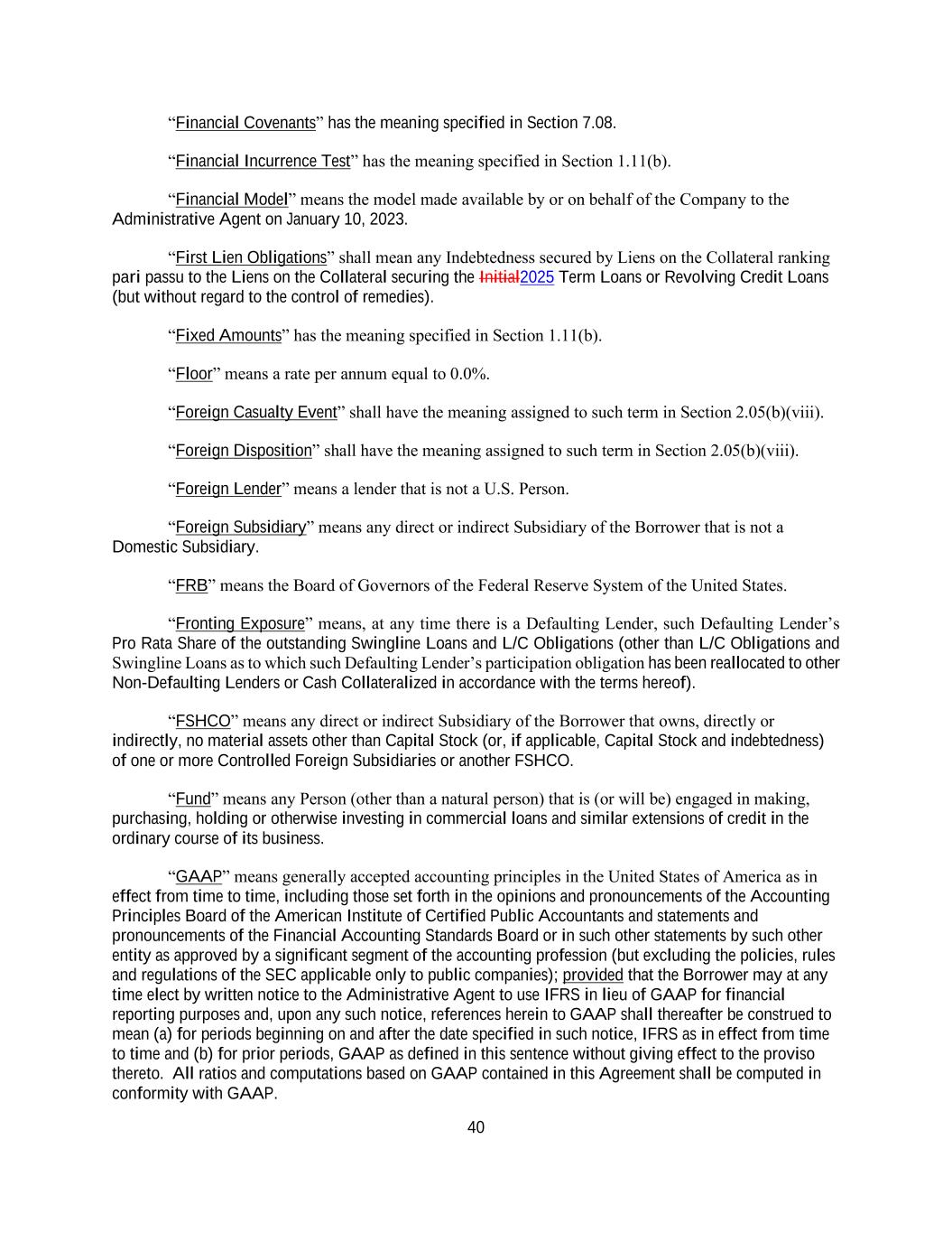 40 “Financial Covenants” has the meaning specified in Section 7.08. “Financial Incurrence Test” has the meaning specified in Section 1.11(b). “Financial Model” means the model made available by or on behalf of the Company to the Administrative Agent on January 10, 2023. “First Lien Obligations” shall mean any Indebtedness secured by Liens on the Collateral ranking pari passu to the Liens on the Collateral securing the Initial2025 Term Loans or Revolving Credit Loans (but without regard to the control of remedies). “Fixed Amounts” has the meaning specified in Section 1.11(b). “Floor” means a rate per annum equal to 0.0%. “Foreign Casualty Event” shall have the meaning assigned to such term in Section 2.05(b)(viii). “Foreign Disposition” shall have the meaning assigned to such term in Section 2.05(b)(viii). “Foreign Lender” means a lender that is not a U.S. Person. “Foreign Subsidiary” means any direct or indirect Subsidiary of the Borrower that is not a Domestic Subsidiary. “FRB” means the Board of Governors of the Federal Reserve System of the United States. “Fronting Exposure” means, at any time there is a Defaulting Lender, such Defaulting Lender’s Pro Rata Share of the outstanding Swingline Loans and L/C Obligations (other than L/C Obligations and Swingline Loans as to which such Defaulting Lender’s participation obligation has been reallocated to other Non-Defaulting Lenders or Cash Collateralized in accordance with the terms hereof). “FSHCO” means any direct or indirect Subsidiary of the Borrower that owns, directly or indirectly, no material assets other than Capital Stock (or, if applicable, Capital Stock and indebtedness) of one or more Controlled Foreign Subsidiaries or another FSHCO. “Fund” means any Person (other than a natural person) that is (or will be) engaged in making, purchasing, holding or otherwise investing in commercial loans and similar extensions of credit in the ordinary course of its business. “GAAP” means generally accepted accounting principles in the United States of America as in effect from time to time, including those set forth in the opinions and pronouncements of the Accounting Principles Board of the American Institute of Certified Public Accountants and statements and pronouncements of the Financial Accounting Standards Board or in such other statements by such other entity as approved by a significant segment of the accounting profession (but excluding the policies, rules and regulations of the SEC applicable only to public companies); provided that the Borrower may at any time elect by written notice to the Administrative Agent to use IFRS in lieu of GAAP for financial reporting purposes and, upon any such notice, references herein to GAAP shall thereafter be construed to mean (a) for periods beginning on and after the date specified in such notice, IFRS as in effect from time to time and (b) for prior periods, GAAP as defined in this sentence without giving effect to the proviso thereto. All ratios and computations based on GAAP contained in this Agreement shall be computed in conformity with GAAP.