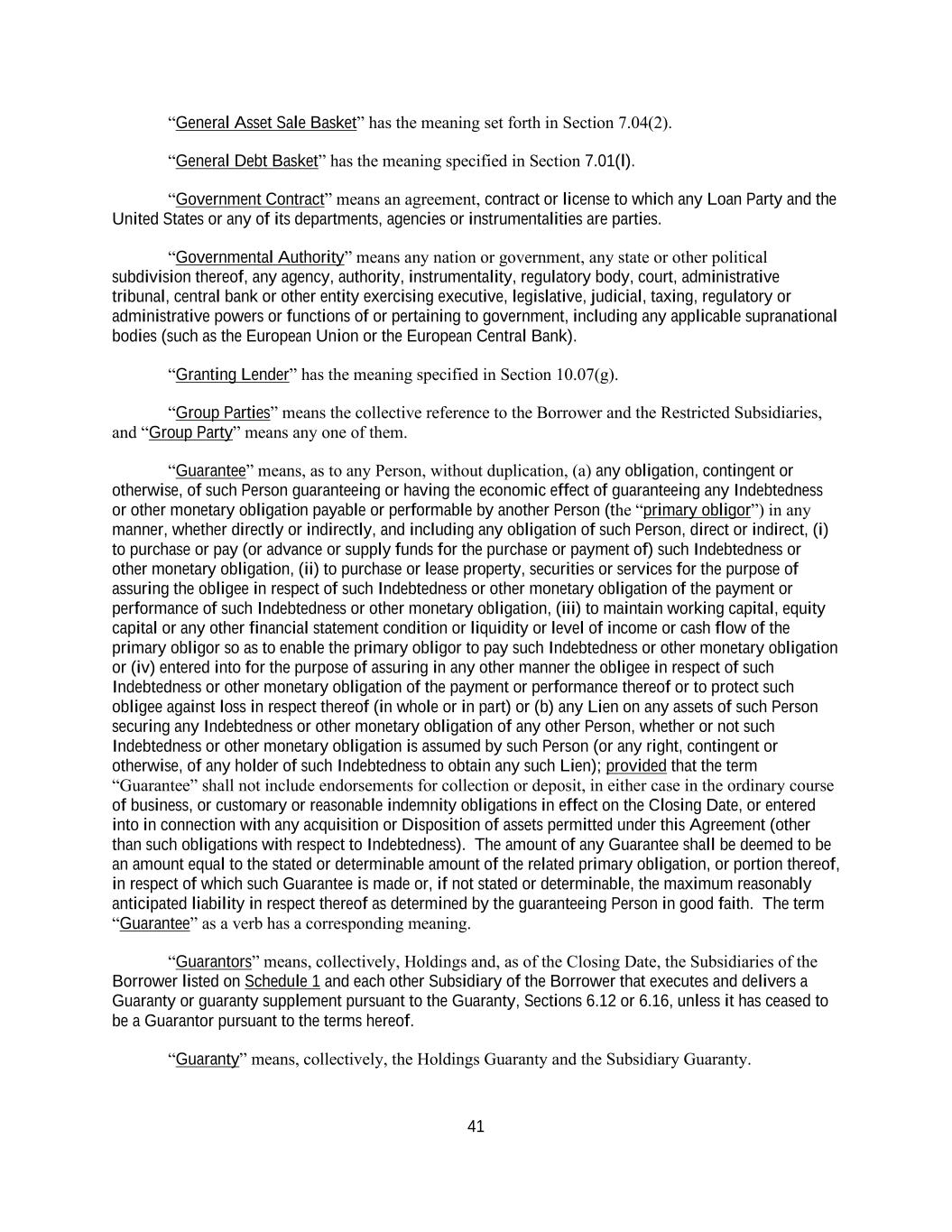 41 “General Asset Sale Basket” has the meaning set forth in Section 7.04(2). “General Debt Basket” has the meaning specified in Section 7.01(l). “Government Contract” means an agreement, contract or license to which any Loan Party and the United States or any of its departments, agencies or instrumentalities are parties. “Governmental Authority” means any nation or government, any state or other political subdivision thereof, any agency, authority, instrumentality, regulatory body, court, administrative tribunal, central bank or other entity exercising executive, legislative, judicial, taxing, regulatory or administrative powers or functions of or pertaining to government, including any applicable supranational bodies (such as the European Union or the European Central Bank). “Granting Lender” has the meaning specified in Section 10.07(g). “Group Parties” means the collective reference to the Borrower and the Restricted Subsidiaries, and “Group Party” means any one of them. “Guarantee” means, as to any Person, without duplication, (a) any obligation, contingent or otherwise, of such Person guaranteeing or having the economic effect of guaranteeing any Indebtedness or other monetary obligation payable or performable by another Person (the “primary obligor”) in any manner, whether directly or indirectly, and including any obligation of such Person, direct or indirect, (i) to purchase or pay (or advance or supply funds for the purchase or payment of) such Indebtedness or other monetary obligation, (ii) to purchase or lease property, securities or services for the purpose of assuring the obligee in respect of such Indebtedness or other monetary obligation of the payment or performance of such Indebtedness or other monetary obligation, (iii) to maintain working capital, equity capital or any other financial statement condition or liquidity or level of income or cash flow of the primary obligor so as to enable the primary obligor to pay such Indebtedness or other monetary obligation or (iv) entered into for the purpose of assuring in any other manner the obligee in respect of such Indebtedness or other monetary obligation of the payment or performance thereof or to protect such obligee against loss in respect thereof (in whole or in part) or (b) any Lien on any assets of such Person securing any Indebtedness or other monetary obligation of any other Person, whether or not such Indebtedness or other monetary obligation is assumed by such Person (or any right, contingent or otherwise, of any holder of such Indebtedness to obtain any such Lien); provided that the term “Guarantee” shall not include endorsements for collection or deposit, in either case in the ordinary course of business, or customary or reasonable indemnity obligations in effect on the Closing Date, or entered into in connection with any acquisition or Disposition of assets permitted under this Agreement (other than such obligations with respect to Indebtedness). The amount of any Guarantee shall be deemed to be an amount equal to the stated or determinable amount of the related primary obligation, or portion thereof, in respect of which such Guarantee is made or, if not stated or determinable, the maximum reasonably anticipated liability in respect thereof as determined by the guaranteeing Person in good faith. The term “Guarantee” as a verb has a corresponding meaning. “Guarantors” means, collectively, Holdings and, as of the Closing Date, the Subsidiaries of the Borrower listed on Schedule 1 and each other Subsidiary of the Borrower that executes and delivers a Guaranty or guaranty supplement pursuant to the Guaranty, Sections 6.12 or 6.16, unless it has ceased to be a Guarantor pursuant to the terms hereof. “Guaranty” means, collectively, the Holdings Guaranty and the Subsidiary Guaranty.