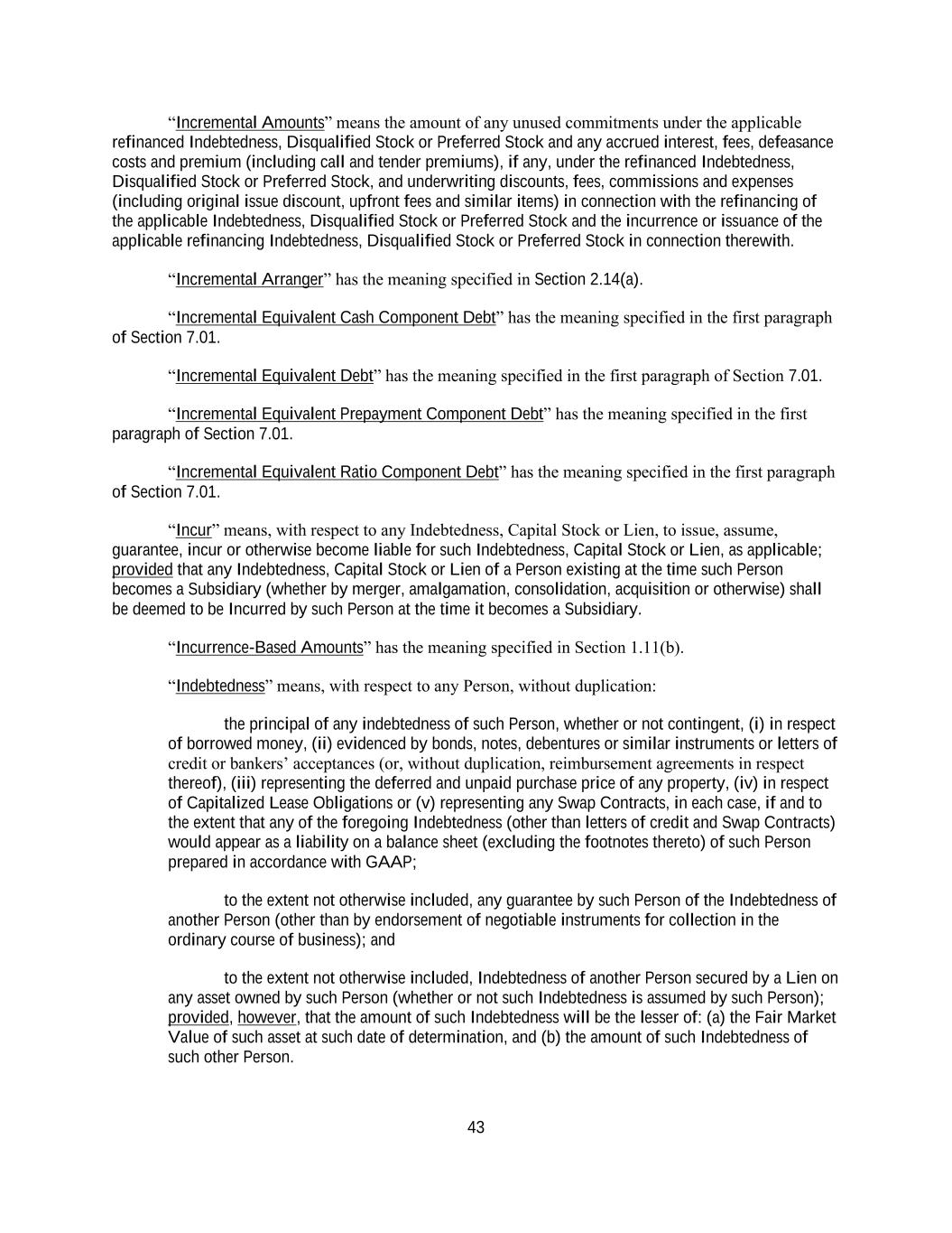 43 “Incremental Amounts” means the amount of any unused commitments under the applicable refinanced Indebtedness, Disqualified Stock or Preferred Stock and any accrued interest, fees, defeasance costs and premium (including call and tender premiums), if any, under the refinanced Indebtedness, Disqualified Stock or Preferred Stock, and underwriting discounts, fees, commissions and expenses (including original issue discount, upfront fees and similar items) in connection with the refinancing of the applicable Indebtedness, Disqualified Stock or Preferred Stock and the incurrence or issuance of the applicable refinancing Indebtedness, Disqualified Stock or Preferred Stock in connection therewith. “Incremental Arranger” has the meaning specified in Section 2.14(a). “Incremental Equivalent Cash Component Debt” has the meaning specified in the first paragraph of Section 7.01. “Incremental Equivalent Debt” has the meaning specified in the first paragraph of Section 7.01. “Incremental Equivalent Prepayment Component Debt” has the meaning specified in the first paragraph of Section 7.01. “Incremental Equivalent Ratio Component Debt” has the meaning specified in the first paragraph of Section 7.01. “Incur” means, with respect to any Indebtedness, Capital Stock or Lien, to issue, assume, guarantee, incur or otherwise become liable for such Indebtedness, Capital Stock or Lien, as applicable; provided that any Indebtedness, Capital Stock or Lien of a Person existing at the time such Person becomes a Subsidiary (whether by merger, amalgamation, consolidation, acquisition or otherwise) shall be deemed to be Incurred by such Person at the time it becomes a Subsidiary. “Incurrence-Based Amounts” has the meaning specified in Section 1.11(b). “Indebtedness” means, with respect to any Person, without duplication: the principal of any indebtedness of such Person, whether or not contingent, (i) in respect of borrowed money, (ii) evidenced by bonds, notes, debentures or similar instruments or letters of credit or bankers’ acceptances (or, without duplication, reimbursement agreements in respect thereof), (iii) representing the deferred and unpaid purchase price of any property, (iv) in respect of Capitalized Lease Obligations or (v) representing any Swap Contracts, in each case, if and to the extent that any of the foregoing Indebtedness (other than letters of credit and Swap Contracts) would appear as a liability on a balance sheet (excluding the footnotes thereto) of such Person prepared in accordance with GAAP; to the extent not otherwise included, any guarantee by such Person of the Indebtedness of another Person (other than by endorsement of negotiable instruments for collection in the ordinary course of business); and to the extent not otherwise included, Indebtedness of another Person secured by a Lien on any asset owned by such Person (whether or not such Indebtedness is assumed by such Person); provided, however, that the amount of such Indebtedness will be the lesser of: (a) the Fair Market Value of such asset at such date of determination, and (b) the amount of such Indebtedness of such other Person.