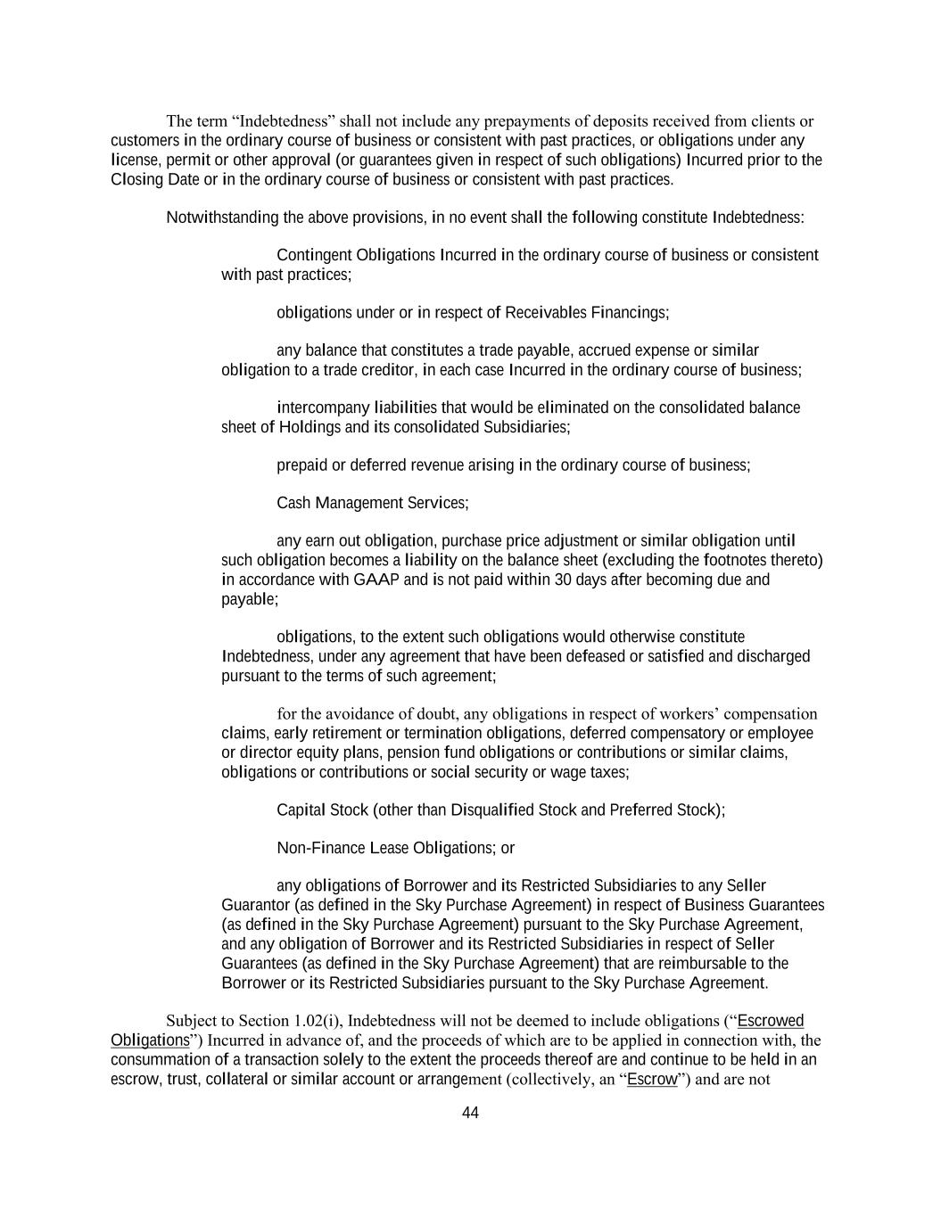 44 The term “Indebtedness” shall not include any prepayments of deposits received from clients or customers in the ordinary course of business or consistent with past practices, or obligations under any license, permit or other approval (or guarantees given in respect of such obligations) Incurred prior to the Closing Date or in the ordinary course of business or consistent with past practices. Notwithstanding the above provisions, in no event shall the following constitute Indebtedness: Contingent Obligations Incurred in the ordinary course of business or consistent with past practices; obligations under or in respect of Receivables Financings; any balance that constitutes a trade payable, accrued expense or similar obligation to a trade creditor, in each case Incurred in the ordinary course of business; intercompany liabilities that would be eliminated on the consolidated balance sheet of Holdings and its consolidated Subsidiaries; prepaid or deferred revenue arising in the ordinary course of business; Cash Management Services; any earn out obligation, purchase price adjustment or similar obligation until such obligation becomes a liability on the balance sheet (excluding the footnotes thereto) in accordance with GAAP and is not paid within 30 days after becoming due and payable; obligations, to the extent such obligations would otherwise constitute Indebtedness, under any agreement that have been defeased or satisfied and discharged pursuant to the terms of such agreement; for the avoidance of doubt, any obligations in respect of workers’ compensation claims, early retirement or termination obligations, deferred compensatory or employee or director equity plans, pension fund obligations or contributions or similar claims, obligations or contributions or social security or wage taxes; Capital Stock (other than Disqualified Stock and Preferred Stock); Non-Finance Lease Obligations; or any obligations of Borrower and its Restricted Subsidiaries to any Seller Guarantor (as defined in the Sky Purchase Agreement) in respect of Business Guarantees (as defined in the Sky Purchase Agreement) pursuant to the Sky Purchase Agreement, and any obligation of Borrower and its Restricted Subsidiaries in respect of Seller Guarantees (as defined in the Sky Purchase Agreement) that are reimbursable to the Borrower or its Restricted Subsidiaries pursuant to the Sky Purchase Agreement. Subject to Section 1.02(i), Indebtedness will not be deemed to include obligations (“Escrowed Obligations”) Incurred in advance of, and the proceeds of which are to be applied in connection with, the consummation of a transaction solely to the extent the proceeds thereof are and continue to be held in an escrow, trust, collateral or similar account or arrangement (collectively, an “Escrow”) and are not