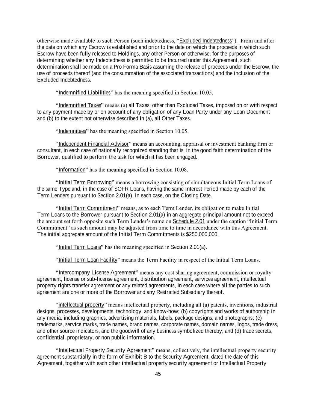 45 otherwise made available to such Person (such indebtedness, “Excluded Indebtedness”). From and after the date on which any Escrow is established and prior to the date on which the proceeds in which such Escrow have been fully released to Holdings, any other Person or otherwise, for the purposes of determining whether any Indebtedness is permitted to be Incurred under this Agreement, such determination shall be made on a Pro Forma Basis assuming the release of proceeds under the Escrow, the use of proceeds thereof (and the consummation of the associated transactions) and the inclusion of the Excluded Indebtedness. “Indemnified Liabilities” has the meaning specified in Section 10.05. “Indemnified Taxes” means (a) all Taxes, other than Excluded Taxes, imposed on or with respect to any payment made by or on account of any obligation of any Loan Party under any Loan Document and (b) to the extent not otherwise described in (a), all Other Taxes. “Indemnitees” has the meaning specified in Section 10.05. “Independent Financial Advisor” means an accounting, appraisal or investment banking firm or consultant, in each case of nationally recognized standing that is, in the good faith determination of the Borrower, qualified to perform the task for which it has been engaged. “Information” has the meaning specified in Section 10.08. “Initial Term Borrowing” means a borrowing consisting of simultaneous Initial Term Loans of the same Type and, in the case of SOFR Loans, having the same Interest Period made by each of the Term Lenders pursuant to Section 2.01(a), in each case, on the Closing Date. “Initial Term Commitment” means, as to each Term Lender, its obligation to make Initial Term Loans to the Borrower pursuant to Section 2.01(a) in an aggregate principal amount not to exceed the amount set forth opposite such Term Lender’s name on Schedule 2.01 under the caption “Initial Term Commitment” as such amount may be adjusted from time to time in accordance with this Agreement. The initial aggregate amount of the Initial Term Commitments is $250,000,000. “Initial Term Loans” has the meaning specified in Section 2.01(a). “Initial Term Loan Facility” means the Term Facility in respect of the Initial Term Loans. “Intercompany License Agreement” means any cost sharing agreement, commission or royalty agreement, license or sub-license agreement, distribution agreement, services agreement, intellectual property rights transfer agreement or any related agreements, in each case where all the parties to such agreement are one or more of the Borrower and any Restricted Subsidiary thereof. “intellectual property” means intellectual property, including all (a) patents, inventions, industrial designs, processes, developments, technology, and know-how; (b) copyrights and works of authorship in any media, including graphics, advertising materials, labels, package designs, and photographs; (c) trademarks, service marks, trade names, brand names, corporate names, domain names, logos, trade dress, and other source indicators, and the goodwill of any business symbolized thereby; and (d) trade secrets, confidential, proprietary, or non public information. “Intellectual Property Security Agreement” means, collectively, the intellectual property security agreement substantially in the form of Exhibit B to the Security Agreement, dated the date of this Agreement, together with each other intellectual property security agreement or Intellectual Property