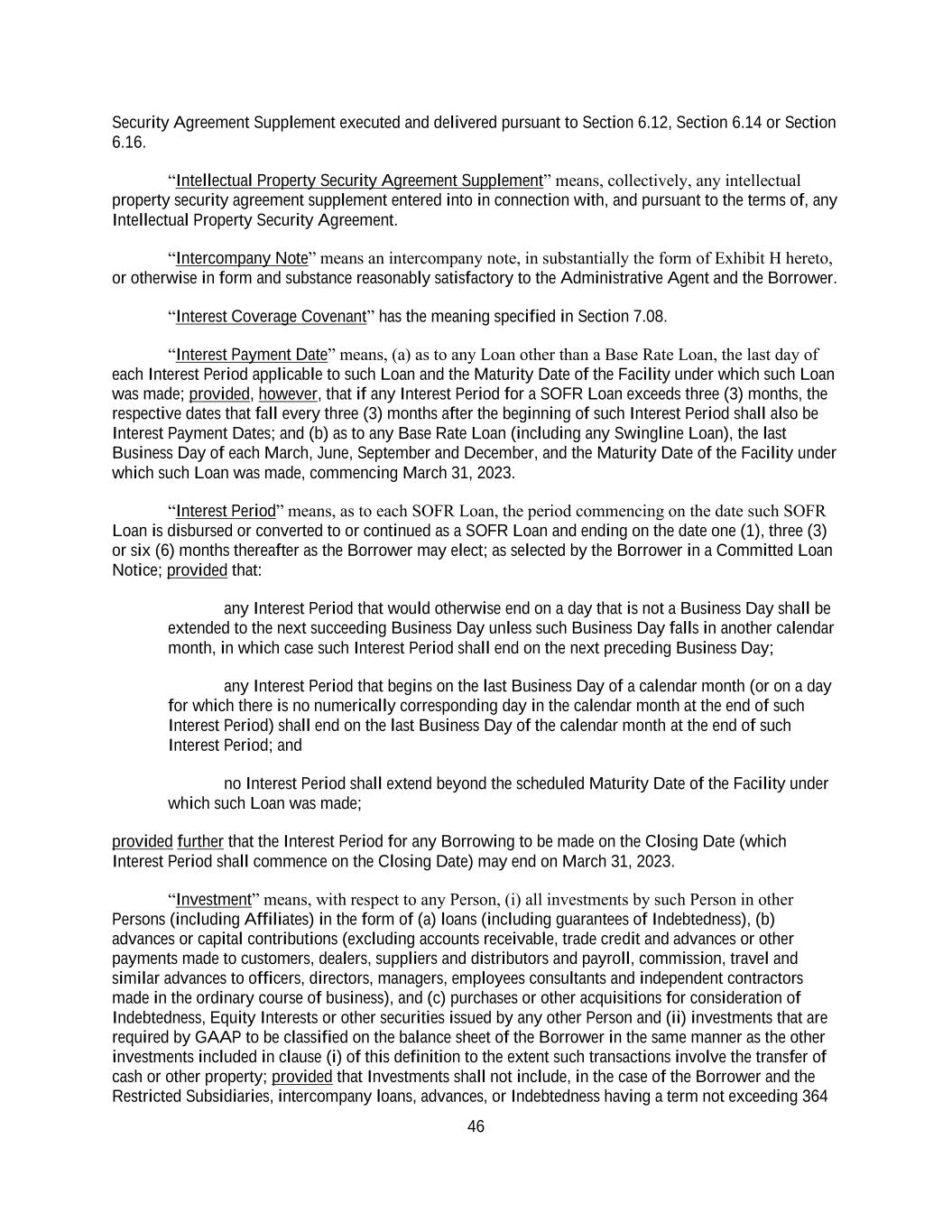 46 Security Agreement Supplement executed and delivered pursuant to Section 6.12, Section 6.14 or Section 6.16. “Intellectual Property Security Agreement Supplement” means, collectively, any intellectual property security agreement supplement entered into in connection with, and pursuant to the terms of, any Intellectual Property Security Agreement. “Intercompany Note” means an intercompany note, in substantially the form of Exhibit H hereto, or otherwise in form and substance reasonably satisfactory to the Administrative Agent and the Borrower. “Interest Coverage Covenant” has the meaning specified in Section 7.08. “Interest Payment Date” means, (a) as to any Loan other than a Base Rate Loan, the last day of each Interest Period applicable to such Loan and the Maturity Date of the Facility under which such Loan was made; provided, however, that if any Interest Period for a SOFR Loan exceeds three (3) months, the respective dates that fall every three (3) months after the beginning of such Interest Period shall also be Interest Payment Dates; and (b) as to any Base Rate Loan (including any Swingline Loan), the last Business Day of each March, June, September and December, and the Maturity Date of the Facility under which such Loan was made, commencing March 31, 2023. “Interest Period” means, as to each SOFR Loan, the period commencing on the date such SOFR Loan is disbursed or converted to or continued as a SOFR Loan and ending on the date one (1), three (3) or six (6) months thereafter as the Borrower may elect; as selected by the Borrower in a Committed Loan Notice; provided that: any Interest Period that would otherwise end on a day that is not a Business Day shall be extended to the next succeeding Business Day unless such Business Day falls in another calendar month, in which case such Interest Period shall end on the next preceding Business Day; any Interest Period that begins on the last Business Day of a calendar month (or on a day for which there is no numerically corresponding day in the calendar month at the end of such Interest Period) shall end on the last Business Day of the calendar month at the end of such Interest Period; and no Interest Period shall extend beyond the scheduled Maturity Date of the Facility under which such Loan was made; provided further that the Interest Period for any Borrowing to be made on the Closing Date (which Interest Period shall commence on the Closing Date) may end on March 31, 2023. “Investment” means, with respect to any Person, (i) all investments by such Person in other Persons (including Affiliates) in the form of (a) loans (including guarantees of Indebtedness), (b) advances or capital contributions (excluding accounts receivable, trade credit and advances or other payments made to customers, dealers, suppliers and distributors and payroll, commission, travel and similar advances to officers, directors, managers, employees consultants and independent contractors made in the ordinary course of business), and (c) purchases or other acquisitions for consideration of Indebtedness, Equity Interests or other securities issued by any other Person and (ii) investments that are required by GAAP to be classified on the balance sheet of the Borrower in the same manner as the other investments included in clause (i) of this definition to the extent such transactions involve the transfer of cash or other property; provided that Investments shall not include, in the case of the Borrower and the Restricted Subsidiaries, intercompany loans, advances, or Indebtedness having a term not exceeding 364