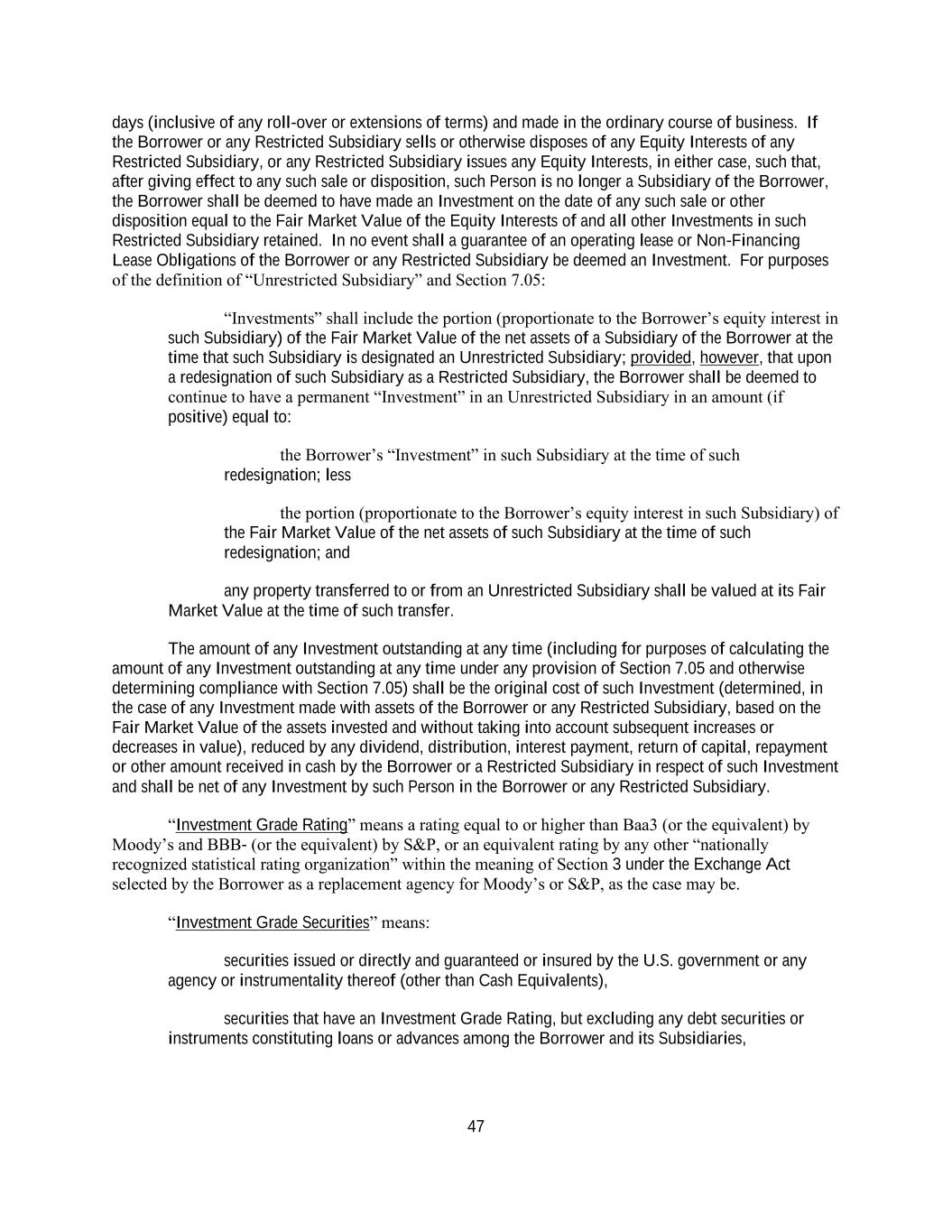 47 days (inclusive of any roll-over or extensions of terms) and made in the ordinary course of business. If the Borrower or any Restricted Subsidiary sells or otherwise disposes of any Equity Interests of any Restricted Subsidiary, or any Restricted Subsidiary issues any Equity Interests, in either case, such that, after giving effect to any such sale or disposition, such Person is no longer a Subsidiary of the Borrower, the Borrower shall be deemed to have made an Investment on the date of any such sale or other disposition equal to the Fair Market Value of the Equity Interests of and all other Investments in such Restricted Subsidiary retained. In no event shall a guarantee of an operating lease or Non-Financing Lease Obligations of the Borrower or any Restricted Subsidiary be deemed an Investment. For purposes of the definition of “Unrestricted Subsidiary” and Section 7.05: “Investments” shall include the portion (proportionate to the Borrower’s equity interest in such Subsidiary) of the Fair Market Value of the net assets of a Subsidiary of the Borrower at the time that such Subsidiary is designated an Unrestricted Subsidiary; provided, however, that upon a redesignation of such Subsidiary as a Restricted Subsidiary, the Borrower shall be deemed to continue to have a permanent “Investment” in an Unrestricted Subsidiary in an amount (if positive) equal to: the Borrower’s “Investment” in such Subsidiary at the time of such redesignation; less the portion (proportionate to the Borrower’s equity interest in such Subsidiary) of the Fair Market Value of the net assets of such Subsidiary at the time of such redesignation; and any property transferred to or from an Unrestricted Subsidiary shall be valued at its Fair Market Value at the time of such transfer. The amount of any Investment outstanding at any time (including for purposes of calculating the amount of any Investment outstanding at any time under any provision of Section 7.05 and otherwise determining compliance with Section 7.05) shall be the original cost of such Investment (determined, in the case of any Investment made with assets of the Borrower or any Restricted Subsidiary, based on the Fair Market Value of the assets invested and without taking into account subsequent increases or decreases in value), reduced by any dividend, distribution, interest payment, return of capital, repayment or other amount received in cash by the Borrower or a Restricted Subsidiary in respect of such Investment and shall be net of any Investment by such Person in the Borrower or any Restricted Subsidiary. “Investment Grade Rating” means a rating equal to or higher than Baa3 (or the equivalent) by Moody’s and BBB- (or the equivalent) by S&P, or an equivalent rating by any other “nationally recognized statistical rating organization” within the meaning of Section 3 under the Exchange Act selected by the Borrower as a replacement agency for Moody’s or S&P, as the case may be. “Investment Grade Securities” means: securities issued or directly and guaranteed or insured by the U.S. government or any agency or instrumentality thereof (other than Cash Equivalents), securities that have an Investment Grade Rating, but excluding any debt securities or instruments constituting loans or advances among the Borrower and its Subsidiaries,