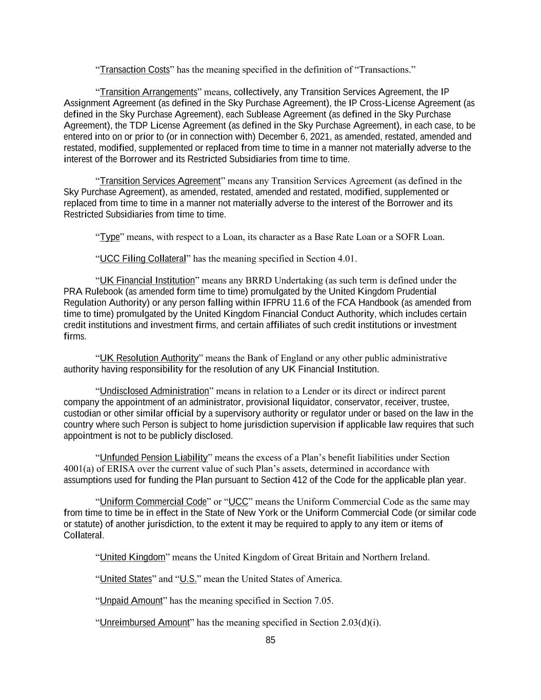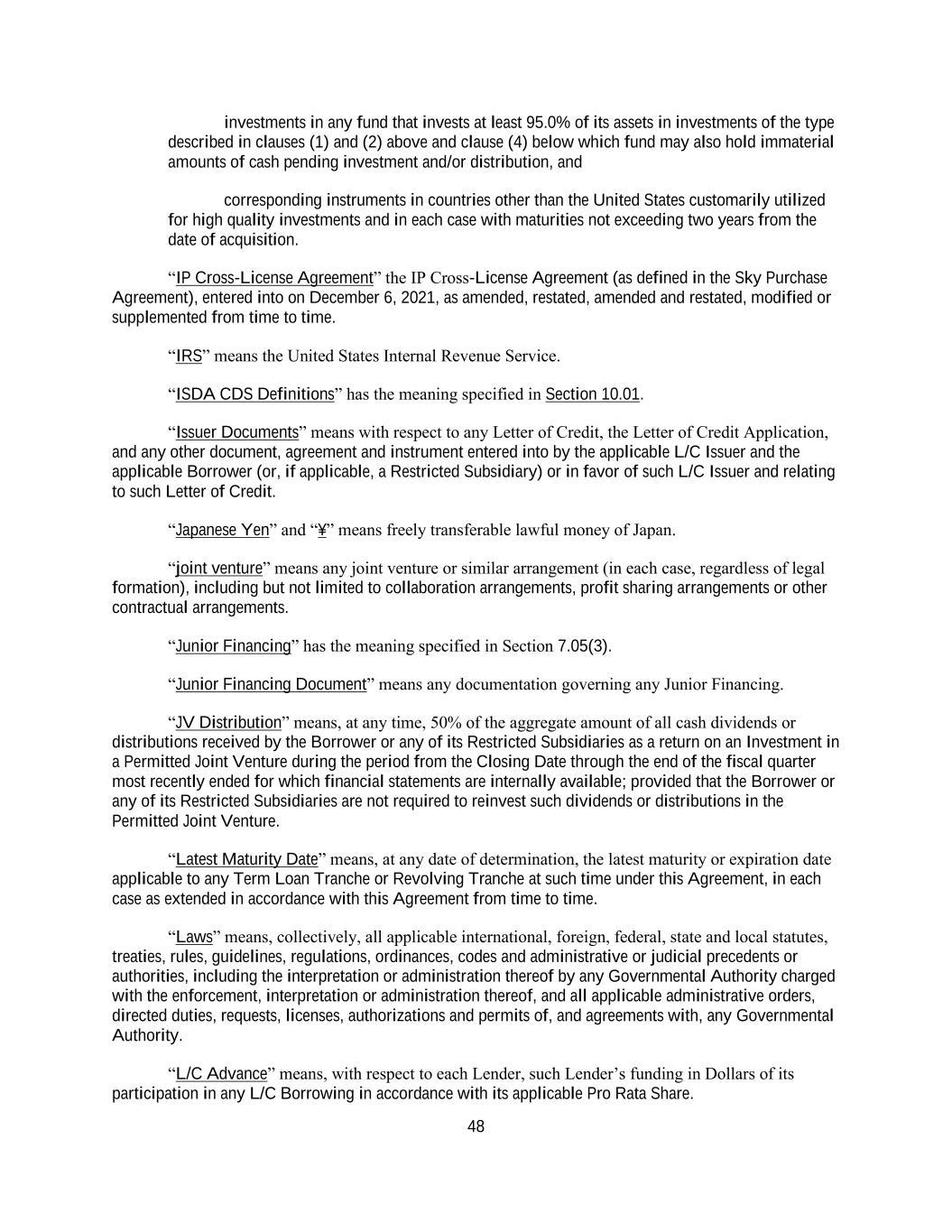 48 investments in any fund that invests at least 95.0% of its assets in investments of the type described in clauses (1) and (2) above and clause (4) below which fund may also hold immaterial amounts of cash pending investment and/or distribution, and corresponding instruments in countries other than the United States customarily utilized for high quality investments and in each case with maturities not exceeding two years from the date of acquisition. “IP Cross-License Agreement” the IP Cross-License Agreement (as defined in the Sky Purchase Agreement), entered into on December 6, 2021, as amended, restated, amended and restated, modified or supplemented from time to time. “IRS” means the United States Internal Revenue Service. “ISDA CDS Definitions” has the meaning specified in Section 10.01. “Issuer Documents” means with respect to any Letter of Credit, the Letter of Credit Application, and any other document, agreement and instrument entered into by the applicable L/C Issuer and the applicable Borrower (or, if applicable, a Restricted Subsidiary) or in favor of such L/C Issuer and relating to such Letter of Credit. “Japanese Yen” and “¥” means freely transferable lawful money of Japan. “joint venture” means any joint venture or similar arrangement (in each case, regardless of legal formation), including but not limited to collaboration arrangements, profit sharing arrangements or other contractual arrangements. “Junior Financing” has the meaning specified in Section 7.05(3). “Junior Financing Document” means any documentation governing any Junior Financing. “JV Distribution” means, at any time, 50% of the aggregate amount of all cash dividends or distributions received by the Borrower or any of its Restricted Subsidiaries as a return on an Investment in a Permitted Joint Venture during the period from the Closing Date through the end of the fiscal quarter most recently ended for which financial statements are internally available; provided that the Borrower or any of its Restricted Subsidiaries are not required to reinvest such dividends or distributions in the Permitted Joint Venture. “Latest Maturity Date” means, at any date of determination, the latest maturity or expiration date applicable to any Term Loan Tranche or Revolving Tranche at such time under this Agreement, in each case as extended in accordance with this Agreement from time to time. “Laws” means, collectively, all applicable international, foreign, federal, state and local statutes, treaties, rules, guidelines, regulations, ordinances, codes and administrative or judicial precedents or authorities, including the interpretation or administration thereof by any Governmental Authority charged with the enforcement, interpretation or administration thereof, and all applicable administrative orders, directed duties, requests, licenses, authorizations and permits of, and agreements with, any Governmental Authority. “L/C Advance” means, with respect to each Lender, such Lender’s funding in Dollars of its participation in any L/C Borrowing in accordance with its applicable Pro Rata Share.