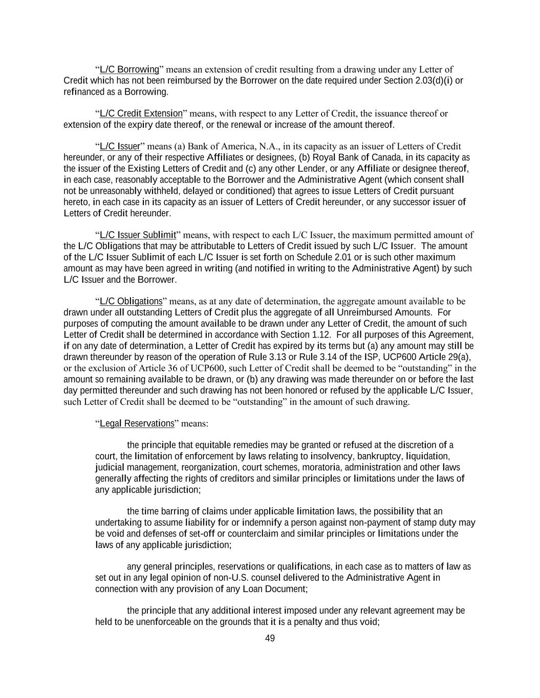 49 “L/C Borrowing” means an extension of credit resulting from a drawing under any Letter of Credit which has not been reimbursed by the Borrower on the date required under Section 2.03(d)(i) or refinanced as a Borrowing. “L/C Credit Extension” means, with respect to any Letter of Credit, the issuance thereof or extension of the expiry date thereof, or the renewal or increase of the amount thereof. “L/C Issuer” means (a) Bank of America, N.A., in its capacity as an issuer of Letters of Credit hereunder, or any of their respective Affiliates or designees, (b) Royal Bank of Canada, in its capacity as the issuer of the Existing Letters of Credit and (c) any other Lender, or any Affiliate or designee thereof, in each case, reasonably acceptable to the Borrower and the Administrative Agent (which consent shall not be unreasonably withheld, delayed or conditioned) that agrees to issue Letters of Credit pursuant hereto, in each case in its capacity as an issuer of Letters of Credit hereunder, or any successor issuer of Letters of Credit hereunder. “L/C Issuer Sublimit” means, with respect to each L/C Issuer, the maximum permitted amount of the L/C Obligations that may be attributable to Letters of Credit issued by such L/C Issuer. The amount of the L/C Issuer Sublimit of each L/C Issuer is set forth on Schedule 2.01 or is such other maximum amount as may have been agreed in writing (and notified in writing to the Administrative Agent) by such L/C Issuer and the Borrower. “L/C Obligations” means, as at any date of determination, the aggregate amount available to be drawn under all outstanding Letters of Credit plus the aggregate of all Unreimbursed Amounts. For purposes of computing the amount available to be drawn under any Letter of Credit, the amount of such Letter of Credit shall be determined in accordance with Section 1.12. For all purposes of this Agreement, if on any date of determination, a Letter of Credit has expired by its terms but (a) any amount may still be drawn thereunder by reason of the operation of Rule 3.13 or Rule 3.14 of the ISP, UCP600 Article 29(a), or the exclusion of Article 36 of UCP600, such Letter of Credit shall be deemed to be “outstanding” in the amount so remaining available to be drawn, or (b) any drawing was made thereunder on or before the last day permitted thereunder and such drawing has not been honored or refused by the applicable L/C Issuer, such Letter of Credit shall be deemed to be “outstanding” in the amount of such drawing. “Legal Reservations” means: the principle that equitable remedies may be granted or refused at the discretion of a court, the limitation of enforcement by laws relating to insolvency, bankruptcy, liquidation, judicial management, reorganization, court schemes, moratoria, administration and other laws generally affecting the rights of creditors and similar principles or limitations under the laws of any applicable jurisdiction; the time barring of claims under applicable limitation laws, the possibility that an undertaking to assume liability for or indemnify a person against non-payment of stamp duty may be void and defenses of set-off or counterclaim and similar principles or limitations under the laws of any applicable jurisdiction; any general principles, reservations or qualifications, in each case as to matters of law as set out in any legal opinion of non-U.S. counsel delivered to the Administrative Agent in connection with any provision of any Loan Document; the principle that any additional interest imposed under any relevant agreement may be held to be unenforceable on the grounds that it is a penalty and thus void;