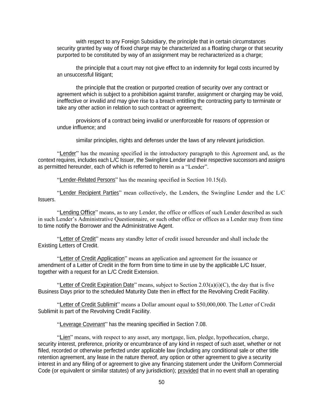 50 with respect to any Foreign Subsidiary, the principle that in certain circumstances security granted by way of fixed charge may be characterized as a floating charge or that security purported to be constituted by way of an assignment may be recharacterized as a charge; the principle that a court may not give effect to an indemnity for legal costs incurred by an unsuccessful litigant; the principle that the creation or purported creation of security over any contract or agreement which is subject to a prohibition against transfer, assignment or charging may be void, ineffective or invalid and may give rise to a breach entitling the contracting party to terminate or take any other action in relation to such contract or agreement; provisions of a contract being invalid or unenforceable for reasons of oppression or undue influence; and similar principles, rights and defenses under the laws of any relevant jurisdiction. “Lender” has the meaning specified in the introductory paragraph to this Agreement and, as the context requires, includes each L/C Issuer, the Swingline Lender and their respective successors and assigns as permitted hereunder, each of which is referred to herein as a “Lender”. “Lender-Related Persons” has the meaning specified in Section 10.15(d). “Lender Recipient Parties” mean collectively, the Lenders, the Swingline Lender and the L/C Issuers. “Lending Office” means, as to any Lender, the office or offices of such Lender described as such in such Lender’s Administrative Questionnaire, or such other office or offices as a Lender may from time to time notify the Borrower and the Administrative Agent. “Letter of Credit” means any standby letter of credit issued hereunder and shall include the Existing Letters of Credit. “Letter of Credit Application” means an application and agreement for the issuance or amendment of a Letter of Credit in the form from time to time in use by the applicable L/C Issuer, together with a request for an L/C Credit Extension. “Letter of Credit Expiration Date” means, subject to Section 2.03(a)(i)(C), the day that is five Business Days prior to the scheduled Maturity Date then in effect for the Revolving Credit Facility. “Letter of Credit Sublimit” means a Dollar amount equal to $50,000,000. The Letter of Credit Sublimit is part of the Revolving Credit Facility. “Leverage Covenant” has the meaning specified in Section 7.08. “Lien” means, with respect to any asset, any mortgage, lien, pledge, hypothecation, charge, security interest, preference, priority or encumbrance of any kind in respect of such asset, whether or not filed, recorded or otherwise perfected under applicable law (including any conditional sale or other title retention agreement, any lease in the nature thereof, any option or other agreement to give a security interest in and any filing of or agreement to give any financing statement under the Uniform Commercial Code (or equivalent or similar statutes) of any jurisdiction); provided that in no event shall an operating
