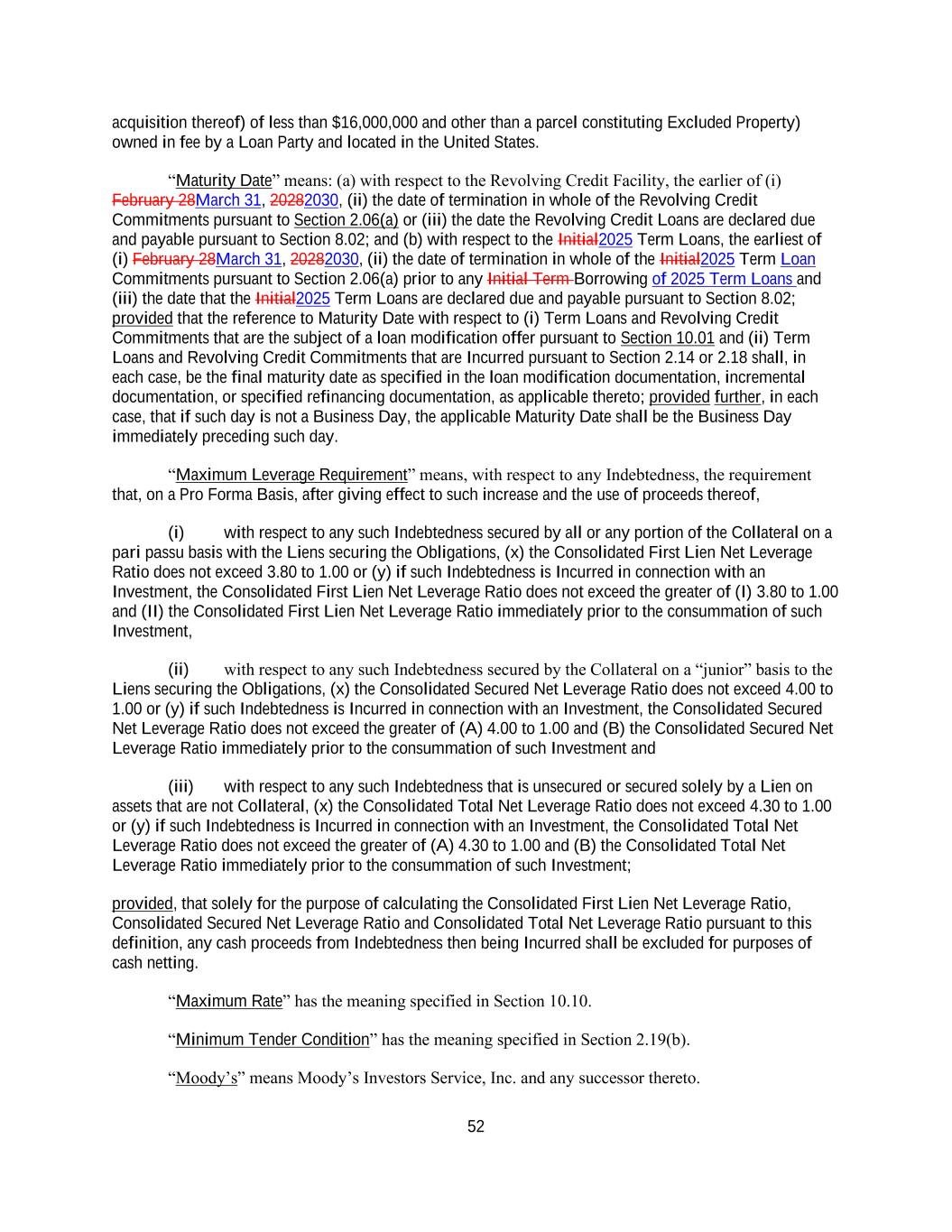 52 acquisition thereof) of less than $16,000,000 and other than a parcel constituting Excluded Property) owned in fee by a Loan Party and located in the United States. “Maturity Date” means: (a) with respect to the Revolving Credit Facility, the earlier of (i) February 28March 31, 20282030, (ii) the date of termination in whole of the Revolving Credit Commitments pursuant to Section 2.06(a) or (iii) the date the Revolving Credit Loans are declared due and payable pursuant to Section 8.02; and (b) with respect to the Initial2025 Term Loans, the earliest of (i) February 28March 31, 20282030, (ii) the date of termination in whole of the Initial2025 Term Loan Commitments pursuant to Section 2.06(a) prior to any Initial Term Borrowing of 2025 Term Loans and (iii) the date that the Initial2025 Term Loans are declared due and payable pursuant to Section 8.02; provided that the reference to Maturity Date with respect to (i) Term Loans and Revolving Credit Commitments that are the subject of a loan modification offer pursuant to Section 10.01 and (ii) Term Loans and Revolving Credit Commitments that are Incurred pursuant to Section 2.14 or 2.18 shall, in each case, be the final maturity date as specified in the loan modification documentation, incremental documentation, or specified refinancing documentation, as applicable thereto; provided further, in each case, that if such day is not a Business Day, the applicable Maturity Date shall be the Business Day immediately preceding such day. “Maximum Leverage Requirement” means, with respect to any Indebtedness, the requirement that, on a Pro Forma Basis, after giving effect to such increase and the use of proceeds thereof, (i) with respect to any such Indebtedness secured by all or any portion of the Collateral on a pari passu basis with the Liens securing the Obligations, (x) the Consolidated First Lien Net Leverage Ratio does not exceed 3.80 to 1.00 or (y) if such Indebtedness is Incurred in connection with an Investment, the Consolidated First Lien Net Leverage Ratio does not exceed the greater of (I) 3.80 to 1.00 and (II) the Consolidated First Lien Net Leverage Ratio immediately prior to the consummation of such Investment, (ii) with respect to any such Indebtedness secured by the Collateral on a “junior” basis to the Liens securing the Obligations, (x) the Consolidated Secured Net Leverage Ratio does not exceed 4.00 to 1.00 or (y) if such Indebtedness is Incurred in connection with an Investment, the Consolidated Secured Net Leverage Ratio does not exceed the greater of (A) 4.00 to 1.00 and (B) the Consolidated Secured Net Leverage Ratio immediately prior to the consummation of such Investment and (iii) with respect to any such Indebtedness that is unsecured or secured solely by a Lien on assets that are not Collateral, (x) the Consolidated Total Net Leverage Ratio does not exceed 4.30 to 1.00 or (y) if such Indebtedness is Incurred in connection with an Investment, the Consolidated Total Net Leverage Ratio does not exceed the greater of (A) 4.30 to 1.00 and (B) the Consolidated Total Net Leverage Ratio immediately prior to the consummation of such Investment; provided, that solely for the purpose of calculating the Consolidated First Lien Net Leverage Ratio, Consolidated Secured Net Leverage Ratio and Consolidated Total Net Leverage Ratio pursuant to this definition, any cash proceeds from Indebtedness then being Incurred shall be excluded for purposes of cash netting. “Maximum Rate” has the meaning specified in Section 10.10. “Minimum Tender Condition” has the meaning specified in Section 2.19(b). “Moody’s” means Moody’s Investors Service, Inc. and any successor thereto.