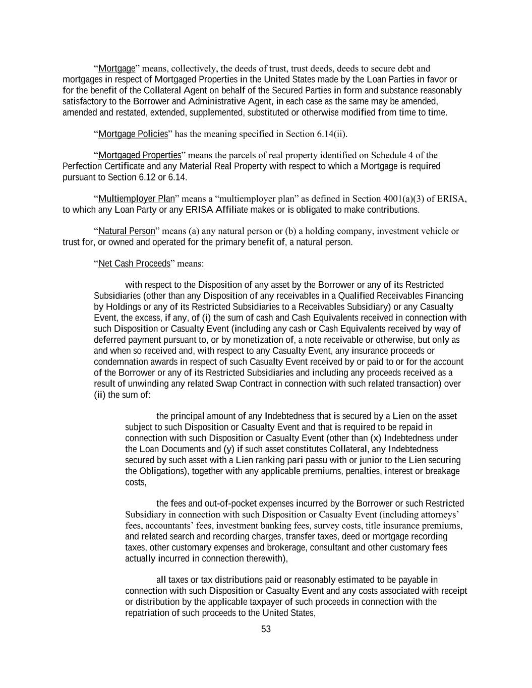 53 “Mortgage” means, collectively, the deeds of trust, trust deeds, deeds to secure debt and mortgages in respect of Mortgaged Properties in the United States made by the Loan Parties in favor or for the benefit of the Collateral Agent on behalf of the Secured Parties in form and substance reasonably satisfactory to the Borrower and Administrative Agent, in each case as the same may be amended, amended and restated, extended, supplemented, substituted or otherwise modified from time to time. “Mortgage Policies” has the meaning specified in Section 6.14(ii). “Mortgaged Properties” means the parcels of real property identified on Schedule 4 of the Perfection Certificate and any Material Real Property with respect to which a Mortgage is required pursuant to Section 6.12 or 6.14. “Multiemployer Plan” means a “multiemployer plan” as defined in Section 4001(a)(3) of ERISA, to which any Loan Party or any ERISA Affiliate makes or is obligated to make contributions. “Natural Person” means (a) any natural person or (b) a holding company, investment vehicle or trust for, or owned and operated for the primary benefit of, a natural person. “Net Cash Proceeds” means: with respect to the Disposition of any asset by the Borrower or any of its Restricted Subsidiaries (other than any Disposition of any receivables in a Qualified Receivables Financing by Holdings or any of its Restricted Subsidiaries to a Receivables Subsidiary) or any Casualty Event, the excess, if any, of (i) the sum of cash and Cash Equivalents received in connection with such Disposition or Casualty Event (including any cash or Cash Equivalents received by way of deferred payment pursuant to, or by monetization of, a note receivable or otherwise, but only as and when so received and, with respect to any Casualty Event, any insurance proceeds or condemnation awards in respect of such Casualty Event received by or paid to or for the account of the Borrower or any of its Restricted Subsidiaries and including any proceeds received as a result of unwinding any related Swap Contract in connection with such related transaction) over (ii) the sum of: the principal amount of any Indebtedness that is secured by a Lien on the asset subject to such Disposition or Casualty Event and that is required to be repaid in connection with such Disposition or Casualty Event (other than (x) Indebtedness under the Loan Documents and (y) if such asset constitutes Collateral, any Indebtedness secured by such asset with a Lien ranking pari passu with or junior to the Lien securing the Obligations), together with any applicable premiums, penalties, interest or breakage costs, the fees and out-of-pocket expenses incurred by the Borrower or such Restricted Subsidiary in connection with such Disposition or Casualty Event (including attorneys’ fees, accountants’ fees, investment banking fees, survey costs, title insurance premiums, and related search and recording charges, transfer taxes, deed or mortgage recording taxes, other customary expenses and brokerage, consultant and other customary fees actually incurred in connection therewith), all taxes or tax distributions paid or reasonably estimated to be payable in connection with such Disposition or Casualty Event and any costs associated with receipt or distribution by the applicable taxpayer of such proceeds in connection with the repatriation of such proceeds to the United States,