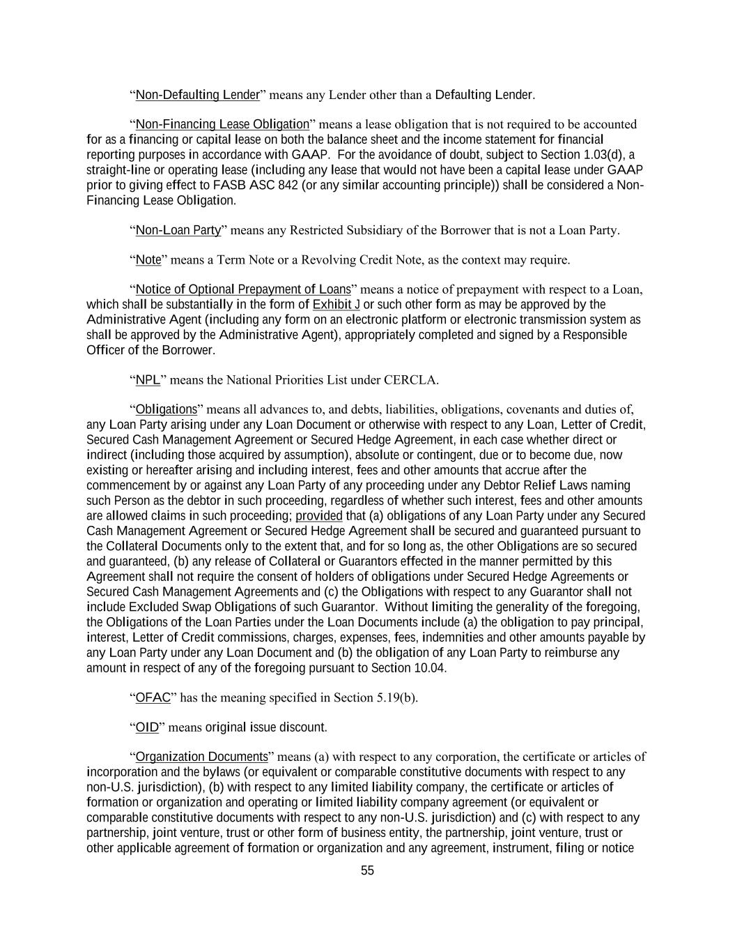 55 “Non-Defaulting Lender” means any Lender other than a Defaulting Lender. “Non-Financing Lease Obligation” means a lease obligation that is not required to be accounted for as a financing or capital lease on both the balance sheet and the income statement for financial reporting purposes in accordance with GAAP. For the avoidance of doubt, subject to Section 1.03(d), a straight-line or operating lease (including any lease that would not have been a capital lease under GAAP prior to giving effect to FASB ASC 842 (or any similar accounting principle)) shall be considered a Non- Financing Lease Obligation. “Non-Loan Party” means any Restricted Subsidiary of the Borrower that is not a Loan Party. “Note” means a Term Note or a Revolving Credit Note, as the context may require. “Notice of Optional Prepayment of Loans” means a notice of prepayment with respect to a Loan, which shall be substantially in the form of Exhibit J or such other form as may be approved by the Administrative Agent (including any form on an electronic platform or electronic transmission system as shall be approved by the Administrative Agent), appropriately completed and signed by a Responsible Officer of the Borrower. “NPL” means the National Priorities List under CERCLA. “Obligations” means all advances to, and debts, liabilities, obligations, covenants and duties of, any Loan Party arising under any Loan Document or otherwise with respect to any Loan, Letter of Credit, Secured Cash Management Agreement or Secured Hedge Agreement, in each case whether direct or indirect (including those acquired by assumption), absolute or contingent, due or to become due, now existing or hereafter arising and including interest, fees and other amounts that accrue after the commencement by or against any Loan Party of any proceeding under any Debtor Relief Laws naming such Person as the debtor in such proceeding, regardless of whether such interest, fees and other amounts are allowed claims in such proceeding; provided that (a) obligations of any Loan Party under any Secured Cash Management Agreement or Secured Hedge Agreement shall be secured and guaranteed pursuant to the Collateral Documents only to the extent that, and for so long as, the other Obligations are so secured and guaranteed, (b) any release of Collateral or Guarantors effected in the manner permitted by this Agreement shall not require the consent of holders of obligations under Secured Hedge Agreements or Secured Cash Management Agreements and (c) the Obligations with respect to any Guarantor shall not include Excluded Swap Obligations of such Guarantor. Without limiting the generality of the foregoing, the Obligations of the Loan Parties under the Loan Documents include (a) the obligation to pay principal, interest, Letter of Credit commissions, charges, expenses, fees, indemnities and other amounts payable by any Loan Party under any Loan Document and (b) the obligation of any Loan Party to reimburse any amount in respect of any of the foregoing pursuant to Section 10.04. “OFAC” has the meaning specified in Section 5.19(b). “OID” means original issue discount. “Organization Documents” means (a) with respect to any corporation, the certificate or articles of incorporation and the bylaws (or equivalent or comparable constitutive documents with respect to any non-U.S. jurisdiction), (b) with respect to any limited liability company, the certificate or articles of formation or organization and operating or limited liability company agreement (or equivalent or comparable constitutive documents with respect to any non-U.S. jurisdiction) and (c) with respect to any partnership, joint venture, trust or other form of business entity, the partnership, joint venture, trust or other applicable agreement of formation or organization and any agreement, instrument, filing or notice