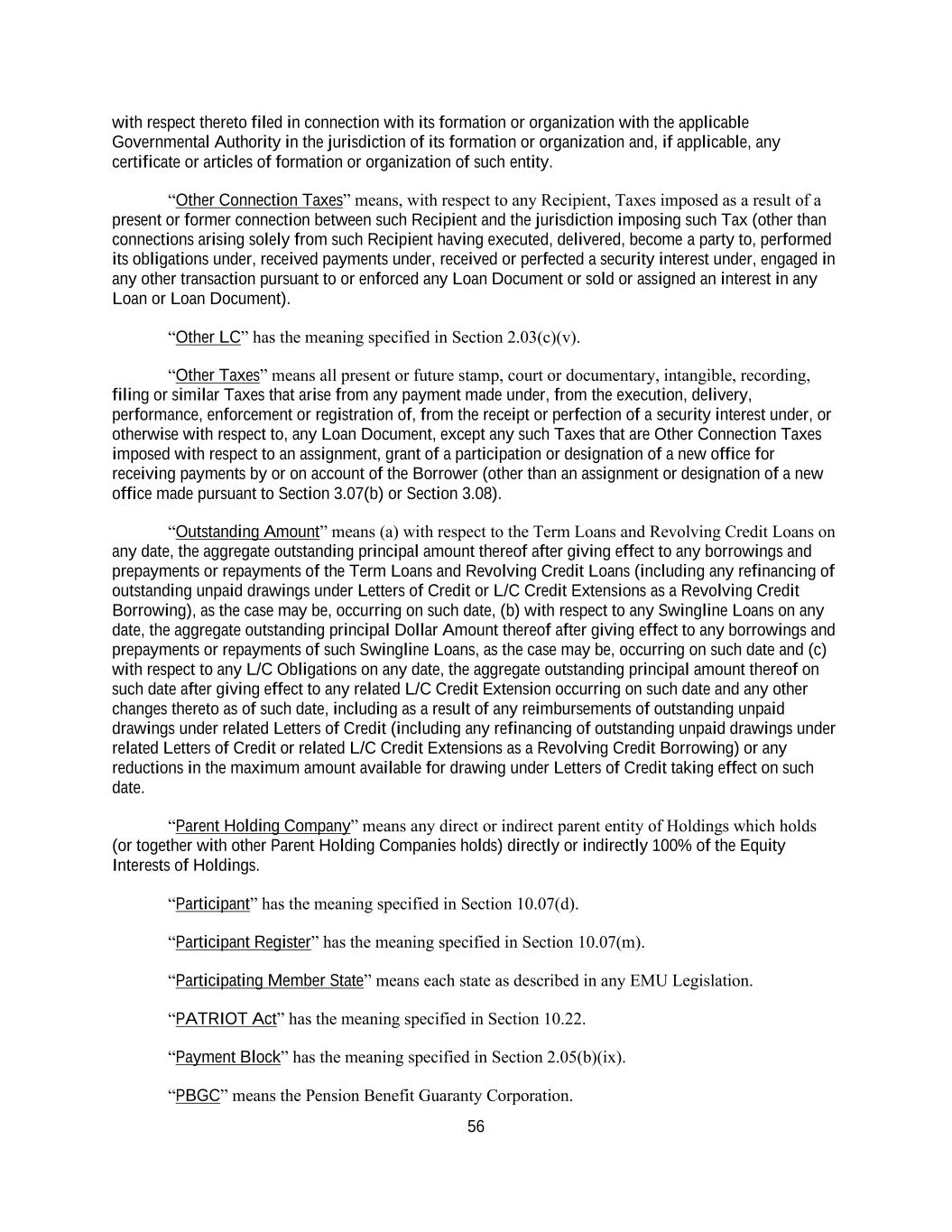 56 with respect thereto filed in connection with its formation or organization with the applicable Governmental Authority in the jurisdiction of its formation or organization and, if applicable, any certificate or articles of formation or organization of such entity. “Other Connection Taxes” means, with respect to any Recipient, Taxes imposed as a result of a present or former connection between such Recipient and the jurisdiction imposing such Tax (other than connections arising solely from such Recipient having executed, delivered, become a party to, performed its obligations under, received payments under, received or perfected a security interest under, engaged in any other transaction pursuant to or enforced any Loan Document or sold or assigned an interest in any Loan or Loan Document). “Other LC” has the meaning specified in Section 2.03(c)(v). “Other Taxes” means all present or future stamp, court or documentary, intangible, recording, filing or similar Taxes that arise from any payment made under, from the execution, delivery, performance, enforcement or registration of, from the receipt or perfection of a security interest under, or otherwise with respect to, any Loan Document, except any such Taxes that are Other Connection Taxes imposed with respect to an assignment, grant of a participation or designation of a new office for receiving payments by or on account of the Borrower (other than an assignment or designation of a new office made pursuant to Section 3.07(b) or Section 3.08). “Outstanding Amount” means (a) with respect to the Term Loans and Revolving Credit Loans on any date, the aggregate outstanding principal amount thereof after giving effect to any borrowings and prepayments or repayments of the Term Loans and Revolving Credit Loans (including any refinancing of outstanding unpaid drawings under Letters of Credit or L/C Credit Extensions as a Revolving Credit Borrowing), as the case may be, occurring on such date, (b) with respect to any Swingline Loans on any date, the aggregate outstanding principal Dollar Amount thereof after giving effect to any borrowings and prepayments or repayments of such Swingline Loans, as the case may be, occurring on such date and (c) with respect to any L/C Obligations on any date, the aggregate outstanding principal amount thereof on such date after giving effect to any related L/C Credit Extension occurring on such date and any other changes thereto as of such date, including as a result of any reimbursements of outstanding unpaid drawings under related Letters of Credit (including any refinancing of outstanding unpaid drawings under related Letters of Credit or related L/C Credit Extensions as a Revolving Credit Borrowing) or any reductions in the maximum amount available for drawing under Letters of Credit taking effect on such date. “Parent Holding Company” means any direct or indirect parent entity of Holdings which holds (or together with other Parent Holding Companies holds) directly or indirectly 100% of the Equity Interests of Holdings. “Participant” has the meaning specified in Section 10.07(d). “Participant Register” has the meaning specified in Section 10.07(m). “Participating Member State” means each state as described in any EMU Legislation. “PATRIOT Act” has the meaning specified in Section 10.22. “Payment Block” has the meaning specified in Section 2.05(b)(ix). “PBGC” means the Pension Benefit Guaranty Corporation.