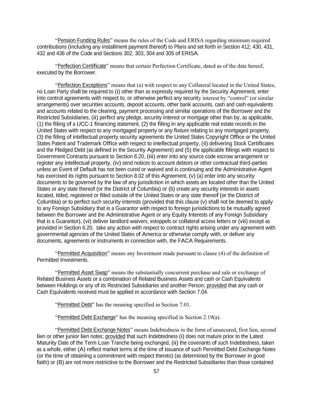 57 “Pension Funding Rules” means the rules of the Code and ERISA regarding minimum required contributions (including any installment payment thereof) to Plans and set forth in Section 412, 430, 431, 432 and 436 of the Code and Sections 302, 303, 304 and 305 of ERISA. “Perfection Certificate” means that certain Perfection Certificate, dated as of the date hereof, executed by the Borrower. “Perfection Exceptions” means that (a) with respect to any Collateral located in the United States, no Loan Party shall be required to (i) other than as expressly required by the Security Agreement, enter into control agreements with respect to, or otherwise perfect any security interest by “control” (or similar arrangements) over securities accounts, deposit accounts, other bank accounts, cash and cash equivalents and accounts related to the clearing, payment processing and similar operations of the Borrower and the Restricted Subsidiaries, (ii) perfect any pledge, security interest or mortgage other than by, as applicable, (1) the filing of a UCC-1 financing statement, (2) the filing in any applicable real estate records in the United States with respect to any mortgaged property or any fixture relating to any mortgaged property, (3) the filing of intellectual property security agreements the United States Copyright Office or the United States Patent and Trademark Office with respect to intellectual property, (4) delivering Stock Certificates and the Pledged Debt (as defined in the Security Agreement) and (5) the applicable filings with respect to Government Contracts pursuant to Section 6.20, (iii) enter into any source code escrow arrangement or register any intellectual property, (iv) send notices to account debtors or other contractual third-parties unless an Event of Default has not been cured or waived and is continuing and the Administrative Agent has exercised its rights pursuant to Section 8.02 of this Agreement, (v) (a) enter into any security documents to be governed by the law of any jurisdiction in which assets are located other than the United States or any state thereof (or the District of Columbia) or (b) create any security interests in assets located, titled, registered or filed outside of the United States or any state thereof (or the District of Columbia) or to perfect such security interests (provided that this clause (v) shall not be deemed to apply to any Foreign Subsidiary that is a Guarantor with respect to foreign jurisdictions to be mutually agreed between the Borrower and the Administrative Agent or any Equity Interests of any Foreign Subsidiary that is a Guarantor), (vi) deliver landlord waivers, estoppels or collateral access letters or (vii) except as provided in Section 6.20, take any action with respect to contract rights arising under any agreement with governmental agencies of the United States of America or otherwise comply with, or deliver any documents, agreements or instruments in connection with, the FACA Requirements. “Permitted Acquisition” means any Investment made pursuant to clause (4) of the definition of Permitted Investments. “Permitted Asset Swap” means the substantially concurrent purchase and sale or exchange of Related Business Assets or a combination of Related Business Assets and cash or Cash Equivalents between Holdings or any of its Restricted Subsidiaries and another Person; provided that any cash or Cash Equivalents received must be applied in accordance with Section 7.04. “Permitted Debt” has the meaning specified in Section 7.01. “Permitted Debt Exchange” has the meaning specified in Section 2.19(a). “Permitted Debt Exchange Notes” means Indebtedness in the form of unsecured, first lien, second lien or other junior lien notes; provided that such Indebtedness (i) does not mature prior to the Latest Maturity Date of the Term Loan Tranche being exchanged, (ii) the covenants of such Indebtedness, taken as a whole, either (A) reflect market terms at the time of issuance of such Permitted Debt Exchange Notes (or the time of obtaining a commitment with respect thereto) (as determined by the Borrower in good faith) or (B) are not more restrictive to the Borrower and the Restricted Subsidiaries than those contained