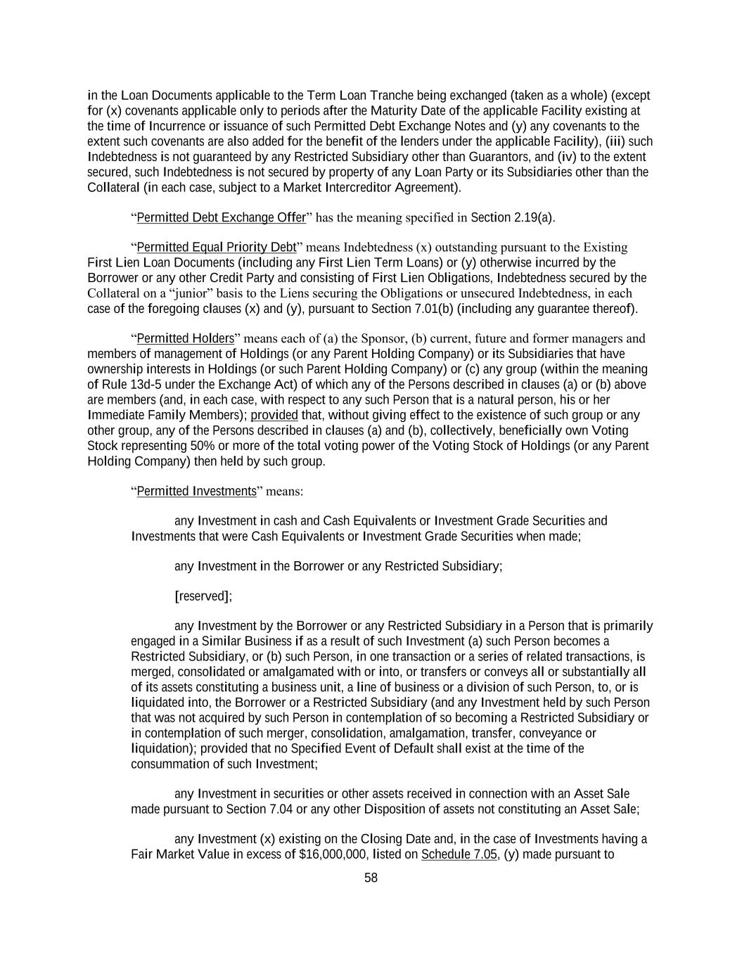 58 in the Loan Documents applicable to the Term Loan Tranche being exchanged (taken as a whole) (except for (x) covenants applicable only to periods after the Maturity Date of the applicable Facility existing at the time of Incurrence or issuance of such Permitted Debt Exchange Notes and (y) any covenants to the extent such covenants are also added for the benefit of the lenders under the applicable Facility), (iii) such Indebtedness is not guaranteed by any Restricted Subsidiary other than Guarantors, and (iv) to the extent secured, such Indebtedness is not secured by property of any Loan Party or its Subsidiaries other than the Collateral (in each case, subject to a Market Intercreditor Agreement). “Permitted Debt Exchange Offer” has the meaning specified in Section 2.19(a). “Permitted Equal Priority Debt” means Indebtedness (x) outstanding pursuant to the Existing First Lien Loan Documents (including any First Lien Term Loans) or (y) otherwise incurred by the Borrower or any other Credit Party and consisting of First Lien Obligations, Indebtedness secured by the Collateral on a “junior” basis to the Liens securing the Obligations or unsecured Indebtedness, in each case of the foregoing clauses (x) and (y), pursuant to Section 7.01(b) (including any guarantee thereof). “Permitted Holders” means each of (a) the Sponsor, (b) current, future and former managers and members of management of Holdings (or any Parent Holding Company) or its Subsidiaries that have ownership interests in Holdings (or such Parent Holding Company) or (c) any group (within the meaning of Rule 13d-5 under the Exchange Act) of which any of the Persons described in clauses (a) or (b) above are members (and, in each case, with respect to any such Person that is a natural person, his or her Immediate Family Members); provided that, without giving effect to the existence of such group or any other group, any of the Persons described in clauses (a) and (b), collectively, beneficially own Voting Stock representing 50% or more of the total voting power of the Voting Stock of Holdings (or any Parent Holding Company) then held by such group. “Permitted Investments” means: any Investment in cash and Cash Equivalents or Investment Grade Securities and Investments that were Cash Equivalents or Investment Grade Securities when made; any Investment in the Borrower or any Restricted Subsidiary; [reserved]; any Investment by the Borrower or any Restricted Subsidiary in a Person that is primarily engaged in a Similar Business if as a result of such Investment (a) such Person becomes a Restricted Subsidiary, or (b) such Person, in one transaction or a series of related transactions, is merged, consolidated or amalgamated with or into, or transfers or conveys all or substantially all of its assets constituting a business unit, a line of business or a division of such Person, to, or is liquidated into, the Borrower or a Restricted Subsidiary (and any Investment held by such Person that was not acquired by such Person in contemplation of so becoming a Restricted Subsidiary or in contemplation of such merger, consolidation, amalgamation, transfer, conveyance or liquidation); provided that no Specified Event of Default shall exist at the time of the consummation of such Investment; any Investment in securities or other assets received in connection with an Asset Sale made pursuant to Section 7.04 or any other Disposition of assets not constituting an Asset Sale; any Investment (x) existing on the Closing Date and, in the case of Investments having a Fair Market Value in excess of $16,000,000, listed on Schedule 7.05, (y) made pursuant to