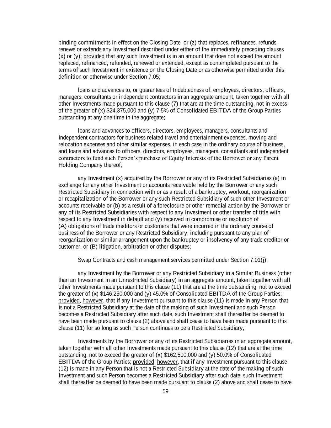 59 binding commitments in effect on the Closing Date or (z) that replaces, refinances, refunds, renews or extends any Investment described under either of the immediately preceding clauses (x) or (y); provided that any such Investment is in an amount that does not exceed the amount replaced, refinanced, refunded, renewed or extended, except as contemplated pursuant to the terms of such Investment in existence on the Closing Date or as otherwise permitted under this definition or otherwise under Section 7.05; loans and advances to, or guarantees of Indebtedness of, employees, directors, officers, managers, consultants or independent contractors in an aggregate amount, taken together with all other Investments made pursuant to this clause (7) that are at the time outstanding, not in excess of the greater of (x) $24,375,000 and (y) 7.5% of Consolidated EBITDA of the Group Parties outstanding at any one time in the aggregate; loans and advances to officers, directors, employees, managers, consultants and independent contractors for business related travel and entertainment expenses, moving and relocation expenses and other similar expenses, in each case in the ordinary course of business, and loans and advances to officers, directors, employees, managers, consultants and independent contractors to fund such Person’s purchase of Equity Interests of the Borrower or any Parent Holding Company thereof; any Investment (x) acquired by the Borrower or any of its Restricted Subsidiaries (a) in exchange for any other Investment or accounts receivable held by the Borrower or any such Restricted Subsidiary in connection with or as a result of a bankruptcy, workout, reorganization or recapitalization of the Borrower or any such Restricted Subsidiary of such other Investment or accounts receivable or (b) as a result of a foreclosure or other remedial action by the Borrower or any of its Restricted Subsidiaries with respect to any Investment or other transfer of title with respect to any Investment in default and (y) received in compromise or resolution of (A) obligations of trade creditors or customers that were incurred in the ordinary course of business of the Borrower or any Restricted Subsidiary, including pursuant to any plan of reorganization or similar arrangement upon the bankruptcy or insolvency of any trade creditor or customer, or (B) litigation, arbitration or other disputes; Swap Contracts and cash management services permitted under Section 7.01(j); any Investment by the Borrower or any Restricted Subsidiary in a Similar Business (other than an Investment in an Unrestricted Subsidiary) in an aggregate amount, taken together with all other Investments made pursuant to this clause (11) that are at the time outstanding, not to exceed the greater of (x) $146,250,000 and (y) 45.0% of Consolidated EBITDA of the Group Parties; provided, however, that if any Investment pursuant to this clause (11) is made in any Person that is not a Restricted Subsidiary at the date of the making of such Investment and such Person becomes a Restricted Subsidiary after such date, such Investment shall thereafter be deemed to have been made pursuant to clause (2) above and shall cease to have been made pursuant to this clause (11) for so long as such Person continues to be a Restricted Subsidiary; Investments by the Borrower or any of its Restricted Subsidiaries in an aggregate amount, taken together with all other Investments made pursuant to this clause (12) that are at the time outstanding, not to exceed the greater of (x) $162,500,000 and (y) 50.0% of Consolidated EBITDA of the Group Parties; provided, however, that if any Investment pursuant to this clause (12) is made in any Person that is not a Restricted Subsidiary at the date of the making of such Investment and such Person becomes a Restricted Subsidiary after such date, such Investment shall thereafter be deemed to have been made pursuant to clause (2) above and shall cease to have