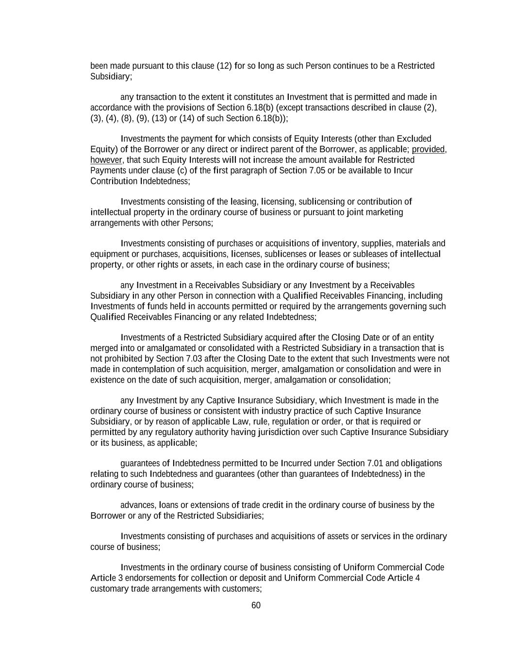 60 been made pursuant to this clause (12) for so long as such Person continues to be a Restricted Subsidiary; any transaction to the extent it constitutes an Investment that is permitted and made in accordance with the provisions of Section 6.18(b) (except transactions described in clause (2), (3), (4), (8), (9), (13) or (14) of such Section 6.18(b)); Investments the payment for which consists of Equity Interests (other than Excluded Equity) of the Borrower or any direct or indirect parent of the Borrower, as applicable; provided, however, that such Equity Interests will not increase the amount available for Restricted Payments under clause (c) of the first paragraph of Section 7.05 or be available to Incur Contribution Indebtedness; Investments consisting of the leasing, licensing, sublicensing or contribution of intellectual property in the ordinary course of business or pursuant to joint marketing arrangements with other Persons; Investments consisting of purchases or acquisitions of inventory, supplies, materials and equipment or purchases, acquisitions, licenses, sublicenses or leases or subleases of intellectual property, or other rights or assets, in each case in the ordinary course of business; any Investment in a Receivables Subsidiary or any Investment by a Receivables Subsidiary in any other Person in connection with a Qualified Receivables Financing, including Investments of funds held in accounts permitted or required by the arrangements governing such Qualified Receivables Financing or any related Indebtedness; Investments of a Restricted Subsidiary acquired after the Closing Date or of an entity merged into or amalgamated or consolidated with a Restricted Subsidiary in a transaction that is not prohibited by Section 7.03 after the Closing Date to the extent that such Investments were not made in contemplation of such acquisition, merger, amalgamation or consolidation and were in existence on the date of such acquisition, merger, amalgamation or consolidation; any Investment by any Captive Insurance Subsidiary, which Investment is made in the ordinary course of business or consistent with industry practice of such Captive Insurance Subsidiary, or by reason of applicable Law, rule, regulation or order, or that is required or permitted by any regulatory authority having jurisdiction over such Captive Insurance Subsidiary or its business, as applicable; guarantees of Indebtedness permitted to be Incurred under Section 7.01 and obligations relating to such Indebtedness and guarantees (other than guarantees of Indebtedness) in the ordinary course of business; advances, loans or extensions of trade credit in the ordinary course of business by the Borrower or any of the Restricted Subsidiaries; Investments consisting of purchases and acquisitions of assets or services in the ordinary course of business; Investments in the ordinary course of business consisting of Uniform Commercial Code Article 3 endorsements for collection or deposit and Uniform Commercial Code Article 4 customary trade arrangements with customers;