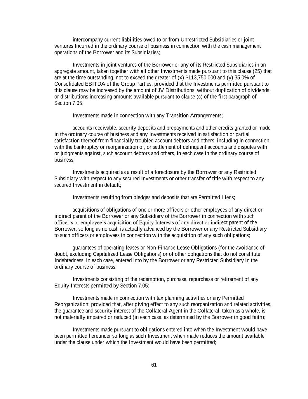 61 intercompany current liabilities owed to or from Unrestricted Subsidiaries or joint ventures Incurred in the ordinary course of business in connection with the cash management operations of the Borrower and its Subsidiaries; Investments in joint ventures of the Borrower or any of its Restricted Subsidiaries in an aggregate amount, taken together with all other Investments made pursuant to this clause (25) that are at the time outstanding, not to exceed the greater of (x) $113,750,000 and (y) 35.0% of Consolidated EBITDA of the Group Parties; provided that the Investments permitted pursuant to this clause may be increased by the amount of JV Distributions, without duplication of dividends or distributions increasing amounts available pursuant to clause (c) of the first paragraph of Section 7.05; Investments made in connection with any Transition Arrangements; accounts receivable, security deposits and prepayments and other credits granted or made in the ordinary course of business and any Investments received in satisfaction or partial satisfaction thereof from financially troubled account debtors and others, including in connection with the bankruptcy or reorganization of, or settlement of delinquent accounts and disputes with or judgments against, such account debtors and others, in each case in the ordinary course of business; Investments acquired as a result of a foreclosure by the Borrower or any Restricted Subsidiary with respect to any secured Investments or other transfer of title with respect to any secured Investment in default; Investments resulting from pledges and deposits that are Permitted Liens; acquisitions of obligations of one or more officers or other employees of any direct or indirect parent of the Borrower or any Subsidiary of the Borrower in connection with such officer’s or employee’s acquisition of Equity Interests of any direct or indirect parent of the Borrower, so long as no cash is actually advanced by the Borrower or any Restricted Subsidiary to such officers or employees in connection with the acquisition of any such obligations; guarantees of operating leases or Non-Finance Lease Obligations (for the avoidance of doubt, excluding Capitalized Lease Obligations) or of other obligations that do not constitute Indebtedness, in each case, entered into by the Borrower or any Restricted Subsidiary in the ordinary course of business; Investments consisting of the redemption, purchase, repurchase or retirement of any Equity Interests permitted by Section 7.05; Investments made in connection with tax planning activities or any Permitted Reorganization; provided that, after giving effect to any such reorganization and related activities, the guarantee and security interest of the Collateral Agent in the Collateral, taken as a whole, is not materially impaired or reduced (in each case, as determined by the Borrower in good faith); Investments made pursuant to obligations entered into when the Investment would have been permitted hereunder so long as such Investment when made reduces the amount available under the clause under which the Investment would have been permitted;