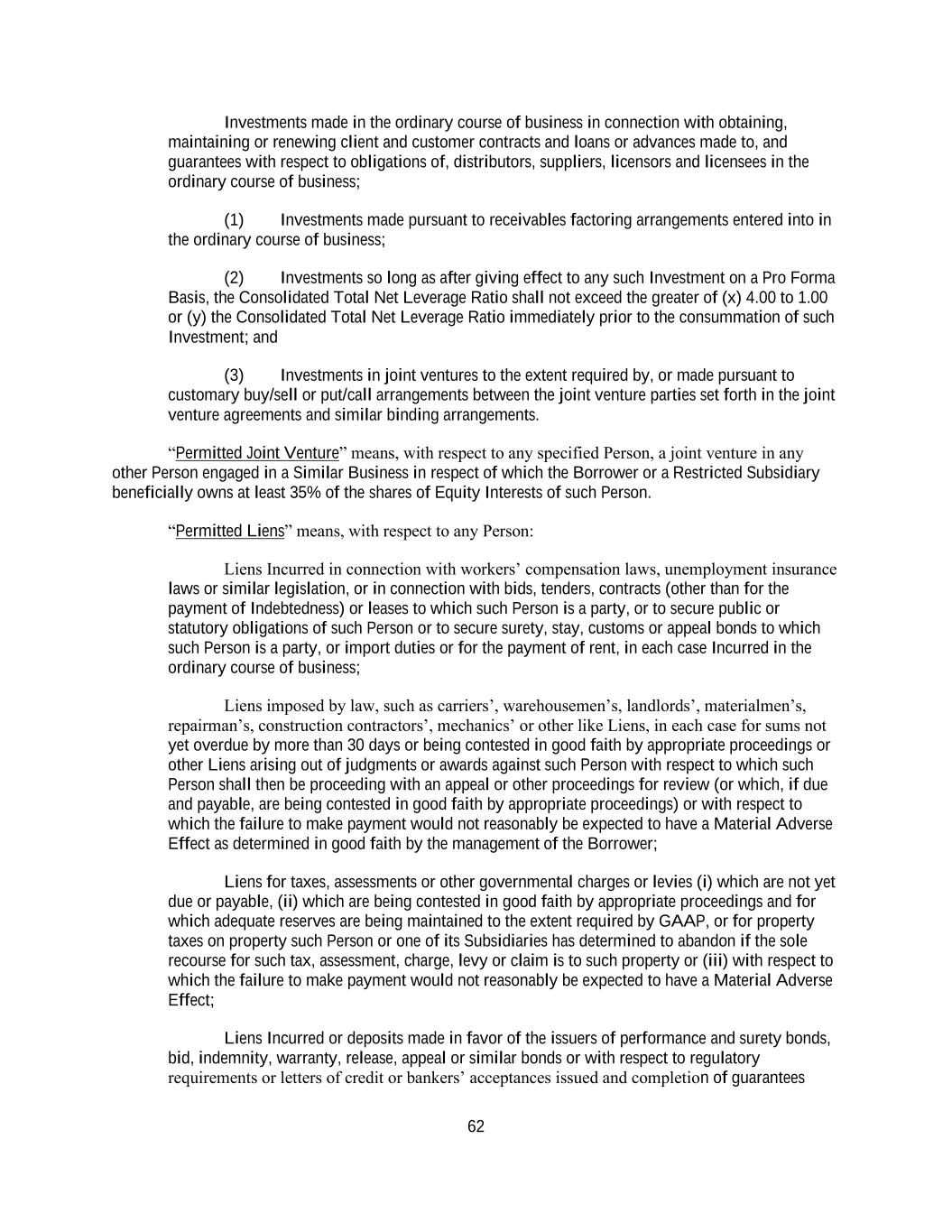 62 Investments made in the ordinary course of business in connection with obtaining, maintaining or renewing client and customer contracts and loans or advances made to, and guarantees with respect to obligations of, distributors, suppliers, licensors and licensees in the ordinary course of business; (1) Investments made pursuant to receivables factoring arrangements entered into in the ordinary course of business; (2) Investments so long as after giving effect to any such Investment on a Pro Forma Basis, the Consolidated Total Net Leverage Ratio shall not exceed the greater of (x) 4.00 to 1.00 or (y) the Consolidated Total Net Leverage Ratio immediately prior to the consummation of such Investment; and (3) Investments in joint ventures to the extent required by, or made pursuant to customary buy/sell or put/call arrangements between the joint venture parties set forth in the joint venture agreements and similar binding arrangements. “Permitted Joint Venture” means, with respect to any specified Person, a joint venture in any other Person engaged in a Similar Business in respect of which the Borrower or a Restricted Subsidiary beneficially owns at least 35% of the shares of Equity Interests of such Person. “Permitted Liens” means, with respect to any Person: Liens Incurred in connection with workers’ compensation laws, unemployment insurance laws or similar legislation, or in connection with bids, tenders, contracts (other than for the payment of Indebtedness) or leases to which such Person is a party, or to secure public or statutory obligations of such Person or to secure surety, stay, customs or appeal bonds to which such Person is a party, or import duties or for the payment of rent, in each case Incurred in the ordinary course of business; Liens imposed by law, such as carriers’, warehousemen’s, landlords’, materialmen’s, repairman’s, construction contractors’, mechanics’ or other like Liens, in each case for sums not yet overdue by more than 30 days or being contested in good faith by appropriate proceedings or other Liens arising out of judgments or awards against such Person with respect to which such Person shall then be proceeding with an appeal or other proceedings for review (or which, if due and payable, are being contested in good faith by appropriate proceedings) or with respect to which the failure to make payment would not reasonably be expected to have a Material Adverse Effect as determined in good faith by the management of the Borrower; Liens for taxes, assessments or other governmental charges or levies (i) which are not yet due or payable, (ii) which are being contested in good faith by appropriate proceedings and for which adequate reserves are being maintained to the extent required by GAAP, or for property taxes on property such Person or one of its Subsidiaries has determined to abandon if the sole recourse for such tax, assessment, charge, levy or claim is to such property or (iii) with respect to which the failure to make payment would not reasonably be expected to have a Material Adverse Effect; Liens Incurred or deposits made in favor of the issuers of performance and surety bonds, bid, indemnity, warranty, release, appeal or similar bonds or with respect to regulatory requirements or letters of credit or bankers’ acceptances issued and completion of guarantees
