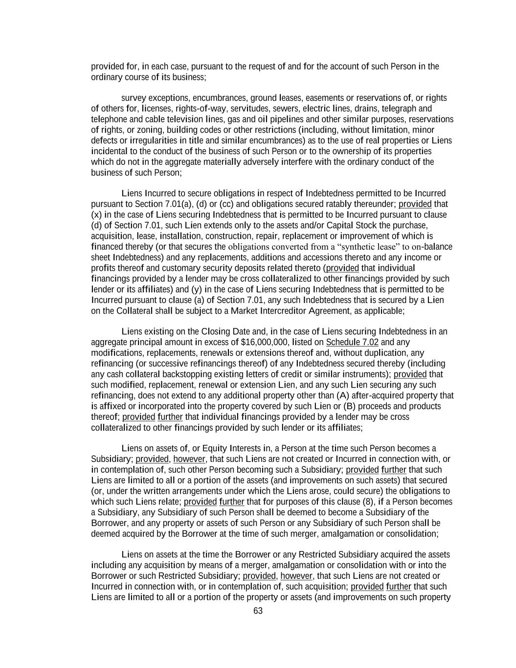 63 provided for, in each case, pursuant to the request of and for the account of such Person in the ordinary course of its business; survey exceptions, encumbrances, ground leases, easements or reservations of, or rights of others for, licenses, rights-of-way, servitudes, sewers, electric lines, drains, telegraph and telephone and cable television lines, gas and oil pipelines and other similar purposes, reservations of rights, or zoning, building codes or other restrictions (including, without limitation, minor defects or irregularities in title and similar encumbrances) as to the use of real properties or Liens incidental to the conduct of the business of such Person or to the ownership of its properties which do not in the aggregate materially adversely interfere with the ordinary conduct of the business of such Person; Liens Incurred to secure obligations in respect of Indebtedness permitted to be Incurred pursuant to Section 7.01(a), (d) or (cc) and obligations secured ratably thereunder; provided that (x) in the case of Liens securing Indebtedness that is permitted to be Incurred pursuant to clause (d) of Section 7.01, such Lien extends only to the assets and/or Capital Stock the purchase, acquisition, lease, installation, construction, repair, replacement or improvement of which is financed thereby (or that secures the obligations converted from a “synthetic lease” to on-balance sheet Indebtedness) and any replacements, additions and accessions thereto and any income or profits thereof and customary security deposits related thereto (provided that individual financings provided by a lender may be cross collateralized to other financings provided by such lender or its affiliates) and (y) in the case of Liens securing Indebtedness that is permitted to be Incurred pursuant to clause (a) of Section 7.01, any such Indebtedness that is secured by a Lien on the Collateral shall be subject to a Market Intercreditor Agreement, as applicable; Liens existing on the Closing Date and, in the case of Liens securing Indebtedness in an aggregate principal amount in excess of $16,000,000, listed on Schedule 7.02 and any modifications, replacements, renewals or extensions thereof and, without duplication, any refinancing (or successive refinancings thereof) of any Indebtedness secured thereby (including any cash collateral backstopping existing letters of credit or similar instruments); provided that such modified, replacement, renewal or extension Lien, and any such Lien securing any such refinancing, does not extend to any additional property other than (A) after-acquired property that is affixed or incorporated into the property covered by such Lien or (B) proceeds and products thereof; provided further that individual financings provided by a lender may be cross collateralized to other financings provided by such lender or its affiliates; Liens on assets of, or Equity Interests in, a Person at the time such Person becomes a Subsidiary; provided, however, that such Liens are not created or Incurred in connection with, or in contemplation of, such other Person becoming such a Subsidiary; provided further that such Liens are limited to all or a portion of the assets (and improvements on such assets) that secured (or, under the written arrangements under which the Liens arose, could secure) the obligations to which such Liens relate; provided further that for purposes of this clause (8), if a Person becomes a Subsidiary, any Subsidiary of such Person shall be deemed to become a Subsidiary of the Borrower, and any property or assets of such Person or any Subsidiary of such Person shall be deemed acquired by the Borrower at the time of such merger, amalgamation or consolidation; Liens on assets at the time the Borrower or any Restricted Subsidiary acquired the assets including any acquisition by means of a merger, amalgamation or consolidation with or into the Borrower or such Restricted Subsidiary; provided, however, that such Liens are not created or Incurred in connection with, or in contemplation of, such acquisition; provided further that such Liens are limited to all or a portion of the property or assets (and improvements on such property