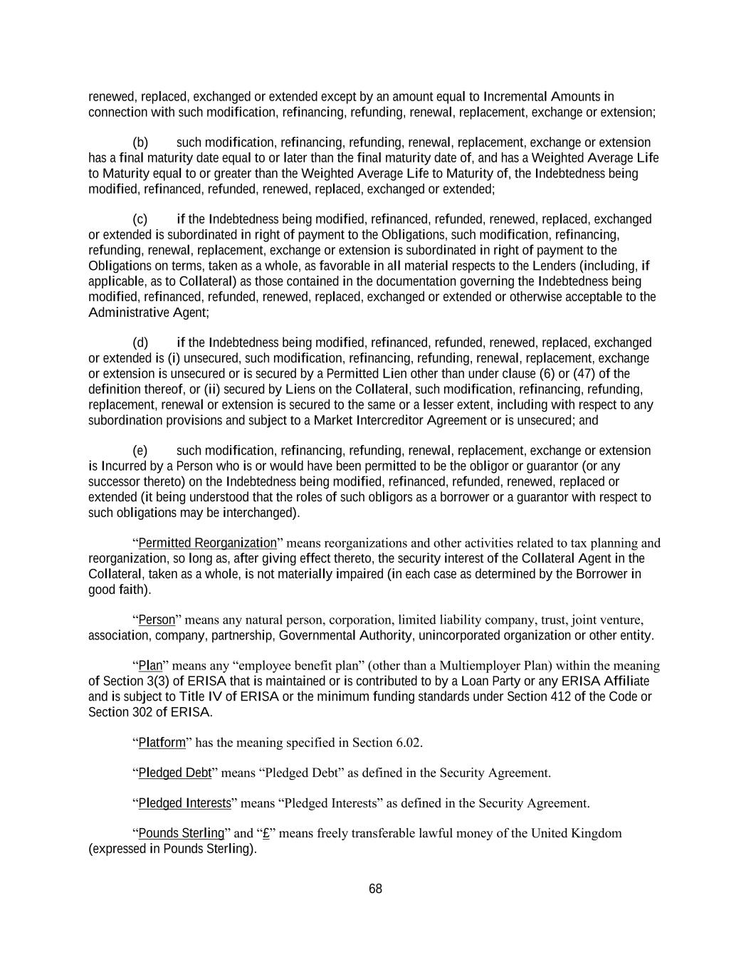 162 (m) any guarantee by the Borrower or a Restricted Subsidiary of Indebtedness or other obligations of the Borrower or any of its Restricted Subsidiaries so long as the Incurrence of such Indebtedness or other obligations by the Borrower or such Restricted Subsidiary is permitted under the terms of this Agreement; (n) the Incurrence by the Borrower or any of its Restricted Subsidiaries of Indebtedness or Disqualified Stock, or Preferred Stock of a Restricted Subsidiary, that serves to refund, refinance, replace, redeem, repurchase, retire or defease, in whole or in part, and is in an aggregate principal amount (or if issued with original issue discount an aggregate issue price) that is equal to or less than, Indebtedness Incurred or Disqualified Stock or Preferred Stock permitted under the first paragraph of this Section 7.01 or clause (c), (d), (l), (n), (o), (r), (t), (cc), (dd), (gg) or (hh) of this Section 7.01, plus any additional Indebtedness Incurred or Disqualified Stock or Preferred Stock issued to fund Incremental Amounts Incurred in connection therewith (subject to the following proviso, “Refinancing Indebtedness”); provided, however, that such Refinancing Indebtedness: (1) except with respect to Extendable Bridge Loans, has a Weighted Average Life to Maturity at the time such Refinancing Indebtedness is Incurred that is not less than the remaining Weighted Average Life to Maturity of the Indebtedness, Disqualified Stock or Preferred Stock being refunded, refinanced, replaced, redeemed, repurchased or retired; provided that this clause (1) shall apply solely with respect to any Indebtedness Incurred pursuant to the first paragraph of Section 7.01; (2) the Incurrence of any Refinancing Indebtedness shall not be deemed to refresh or increase capacity with respect to any clause under which the Indebtedness being refinanced was originally Incurred; (3) to the extent that such Refinancing Indebtedness refinances (i) Subordinated Indebtedness, such Refinancing Indebtedness is Subordinated Indebtedness or (ii) Disqualified Stock or Preferred Stock, such Refinancing Indebtedness is Disqualified Stock or Preferred Stock, respectively; (4) shall not include (x) Indebtedness, Disqualified Stock or Preferred Stock of a Non-Loan Party that refinances Indebtedness, Disqualified Stock or Preferred Stock of the Borrower or a Guarantor, or (y) Indebtedness or Disqualified Stock of the Borrower or Indebtedness, Disqualified Stock or Preferred Stock of a Restricted Subsidiary that refinances Indebtedness, Disqualified Stock or Preferred Stock of an Unrestricted Subsidiary; and (5) with respect to any Refinancing Indebtedness Incurred by a Loan Party, to the extent that such Refinancing Indebtedness is secured, the Liens securing such Refinancing Indebtedness have a Lien priority equal to or junior to the Indebtedness being refunded, refinanced, replaced, redeemed, repurchased or retired; (o) (1) Indebtedness, Disqualified Stock or Preferred Stock of any Person that is acquired by the Borrower or any of its Restricted Subsidiaries or merged into or consolidated or amalgamated with the Borrower or a Restricted Subsidiary in accordance with the terms of this Agreement after the Closing Date and (2) Indebtedness, Disqualified Stock or Preferred Stock of any Person assumed in anticipation of, or in connection with, an acquisition of any assets, business or Person; provided that, in the case of each of sub-clauses (1) and (2), such Indebtedness, Disqualified Stock or Preferred Stock was not Incurred or created in contemplation of such merger, consolidation, amalgamation or acquisition;