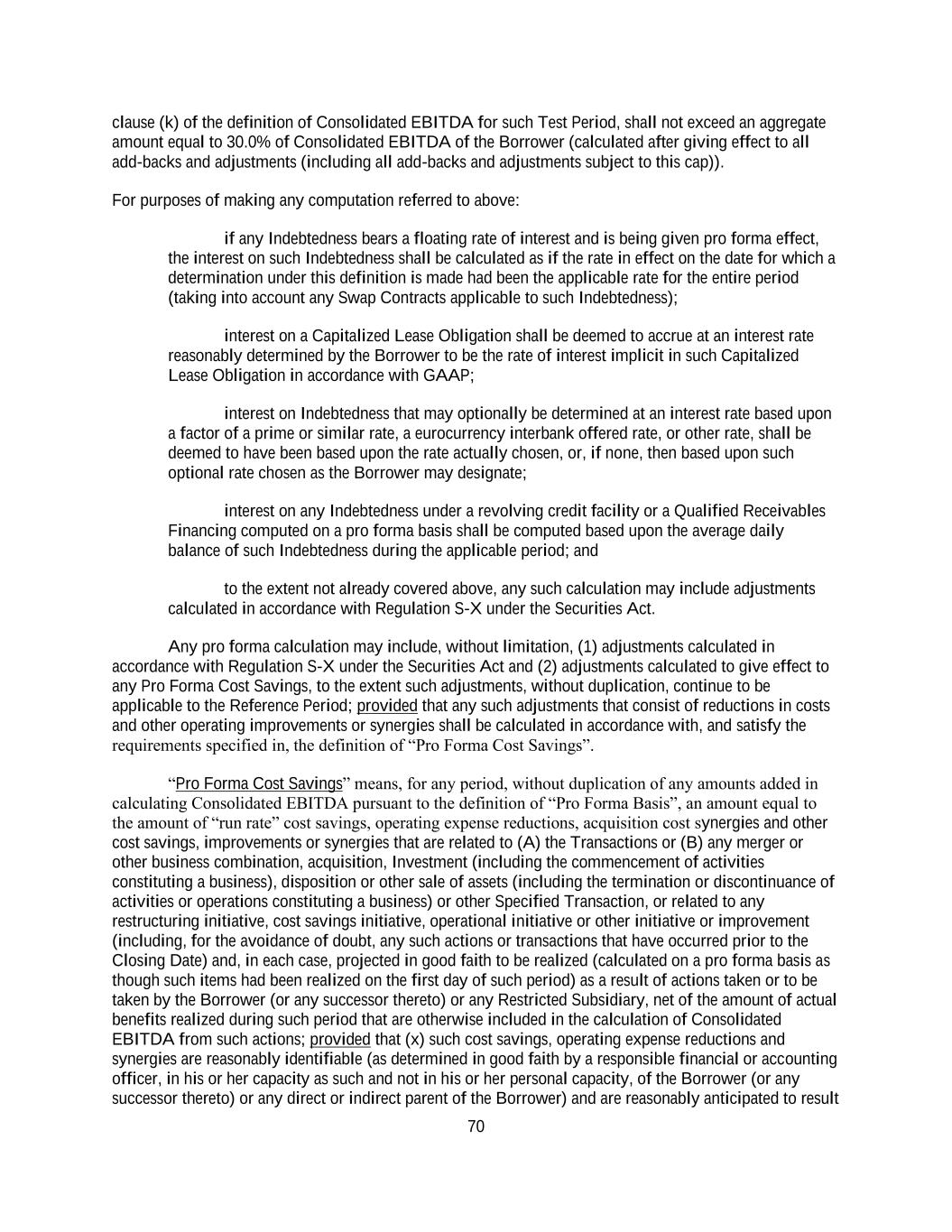 17 (rr) Pro Forma Cost Savings; provided that such Pro Forma Cost Savings added back pursuant to clause (B) of the definition thereof (excluding any such Pro Forma Cost Savings that result from mergers and other business combinations, acquisitions, investments, dispositions or other sales of assets, the discontinuance of activities or operations or other specified transactions, restructurings, cost savings initiatives, operating initiatives or operating improvements, in each case, occurring prior to the Closing Date) under this clause (k) in any Test Period, when aggregated with the amount of any increase in Consolidated EBITDA for such Test Period as a result of any “run-rate” cost savings, operating expense reductions and synergies added pursuant to clause (x) of the definition of “Pro Forma Basis” (excluding any such “run-rate” cost savings, operating expense reductions and synergies that either (A) are related to the Transactions or (B) result from, or are related to, mergers and other business combinations, acquisitions, Investments, dispositions or other sales of assets, the discontinuance of activities or operations or other specified transactions, operating improvements or purchasing improvements and other initiatives, in each case under this sub-clause (B), occurring prior to the Closing Date), shall not exceed an aggregate amount equal to 30.0% of Consolidated EBITDA of the Borrower (calculated after giving effect to all add-backs and adjustments (including all add-backs and adjustments subject to this cap)); plus (ss) [reserved]; plus (tt) the amount of loss or discount on sale of receivables and related assets in connection with a Receivables Financing or factoring transaction; plus (uu) with respect to any joint venture that is not a Restricted Subsidiary, an amount equal to the proportion of those items described in clauses (a), (b) and (c) above relating to such joint venture corresponding to such Person’s and the Restricted Subsidiaries’ proportionate share of such joint venture’s Consolidated Net Income (determined as if such joint venture were a Restricted Subsidiary) solely to the extent Consolidated Net Income was reduced thereby; plus (vv) adjustments calculated in accordance with Regulation S-X; plus (ww) adjustments (x) identified or set forth in any quality of earnings report in connection with any acquisition or other Permitted Investment conducted by financial advisors (which financial advisors are (A) nationally recognized or (B) reasonably acceptable to the Administrative Agent (it being understood that the “Big Four” accounting firms are acceptable) and retained by the Borrower, (y) identified or set forth in the Public Lender Presentation, dated February 13, 2023 or (z) approved by the Administrative Agent; plus (xx) add backs and adjustments contained in the Financial Model; plus (yy) [reserved], plus (zz) [reserved]; (aaa) the amount of any costs or expenses incurred on or prior to the Closing Date that are allocated to the Sky Business (or otherwise to the Borrower and its Restricted Subsidiaries) in connection with corporate allocations made between the Borrower and its Subsidiaries, on the one hand, and the businesses of the Seller Entities (as defined in the