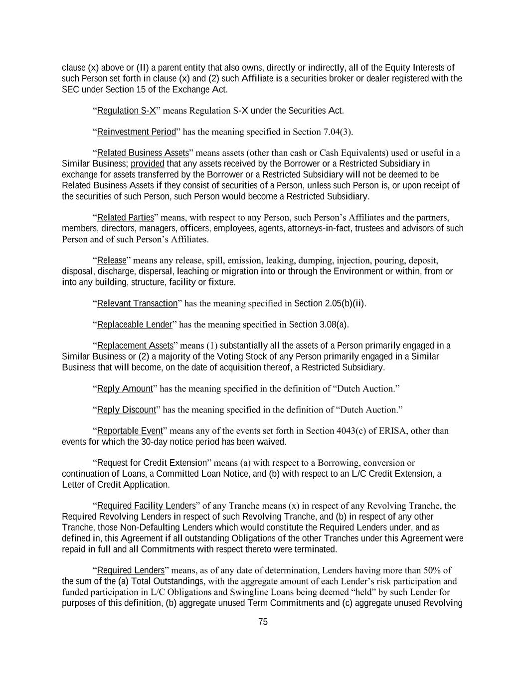39 “Existing Lender Assignment” means an assignment of, as applicable, (x) Commitments under a Term Facility, a Specified Refinancing Term Loan Facility or a New Term Facility or (y) Term Loans, Specified Refinancing Term Loans and New Term Loans, in each case to an existing Lender, an Affiliate of an existing Lender or an Approved Fund thereof (other than any Disqualified Institution). “Existing Letters of Credit” has the meaning specified in Section 2.03(m). “Existing Second Lien Credit Agreement” means that certain Second Lien Credit Agreement, dated as of December 6, 2021, by and among, the Borrower, Holdings, the lenders from time to time party thereto and Royal Bank of Canada, as administrative agent, as amended, restated, amended and restated, supplemented or otherwise modified from time to time. “Extendable Bridge Loans” means any bridge loan which provides for an automatic extension of the maturity thereof, subject to customary conditions, to a date that is not earlier than the Latest Maturity Date of the Initial2025 Term Loan Facility and the Weighted Average Life to Maturity of the long-term debt into which such bridge loan is to be converted or exchanged is not shorter than the remaining Weighted Average Life to Maturity of the Initial2025 Term Loan Facility or any Indebtedness that is being refinanced with the proceeds of such Extendable Bridge Loans, as applicable. “FACA” means the Assignment of Claims Act of 1940 (41 U.S.C. Section 15, 31 U.S.C. Section 3737, and 31 U.S.C. Section 3727) including all amendments thereto and regulations promulgated thereunder. “FACA Requirement” has the meaning specified in Section 6.20. “FACA Requirement Documents” means all documents, instruments and assignments, as may be reasonably requested by the Collateral Agent to comply with FACA in its reasonable discretion. “Facility” means the Term Facilities or the Revolving Credit Facility, as the context may require. “Failed Auction” has the meaning specified in the definition of “Dutch Auction.” “Fair Market Value” means, with respect to any asset or property, the price that could be negotiated in an arm’s-length, free market transaction, for cash, between a willing seller and a willing and able buyer, neither of whom is under undue pressure or compulsion to complete the transaction (as determined in good faith by the Borrower, whose determination will be conclusive for all purposes under the Loan Documents). “FATCA” means Sections 1471 through 1474 of the Code, as of the date of this Agreement (or any amended or successor version that is substantively comparable and not materially more onerous to comply with), any current or future Treasury regulations or official administrative interpretations thereof, any agreements entered into pursuant to current Section 1471(b)(1) of the Code (or any amended or successor version described above) and any intergovernmental agreements implementing the foregoing (together with any Laws implementing such agreements). “Federal Funds Rate” means, for any day, the rate per annum calculated by the Federal Reserve Bank of New York based on such day’s federal funds transactions by depository institutions (as determined in such manner as the Federal Reserve Bank of New York shall set forth on its public website from time to time) and published on the next succeeding Business Day by the Federal Reserve Bank of New York as the federal funds effective rate; provided that if the Federal Funds Rate as so determined would be less than zero, such rate shall be deemed to be zero for the purposes of this Agreement.