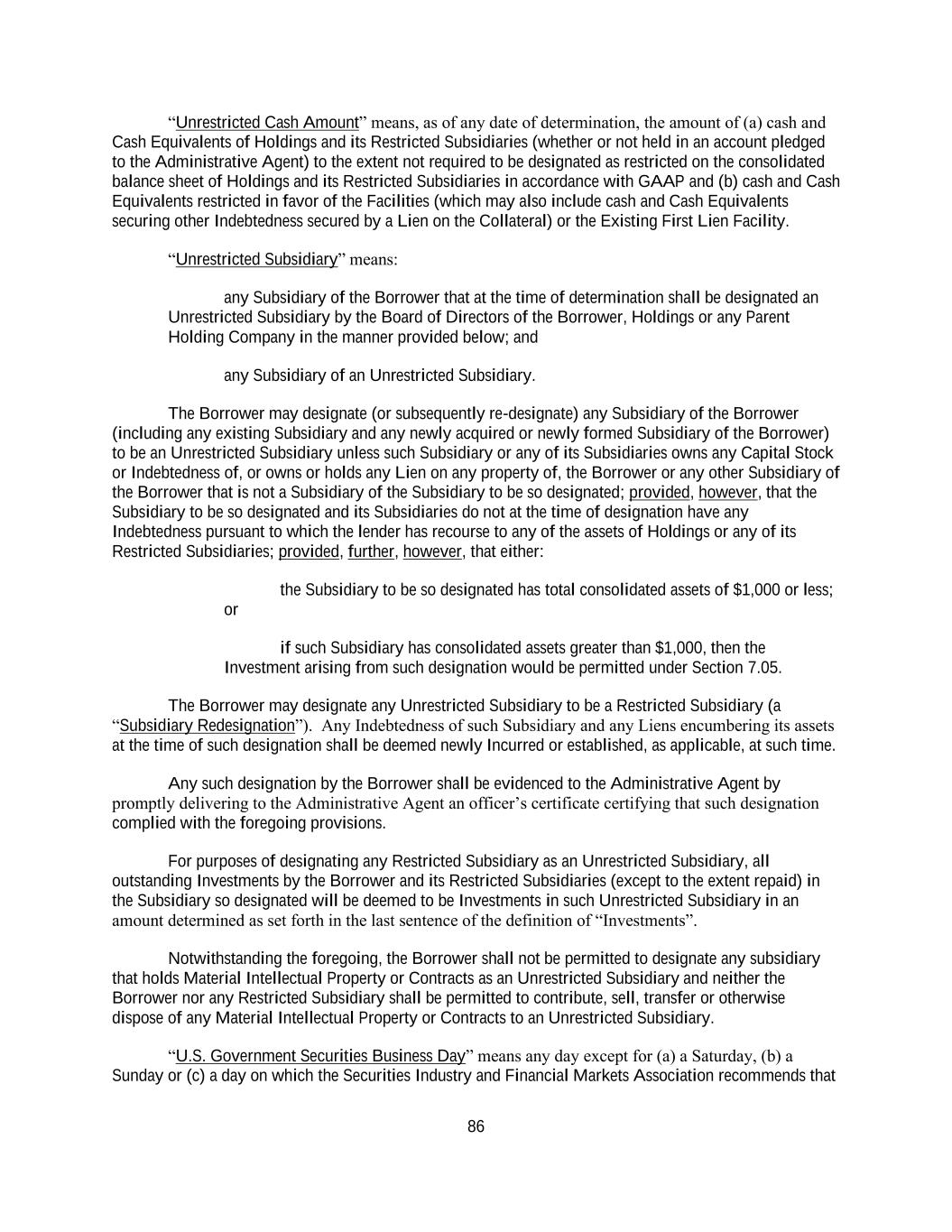 168 (iii) to make an investment in any one or more businesses, properties or assets that replace the businesses, properties and/or assets that are the subject of such Asset Sale or Casualty Event; or (iv) any combination of the foregoing; provided that the Borrower and its Restricted Subsidiaries will be deemed to have complied with the provisions described in clause (ii) or (iii) above if and to the extent that, within 18 months after the receipt of the Net Cash Proceeds generated by such Asset Sale, the Borrower or such Restricted Subsidiary, as applicable, has entered into a binding agreement to make an investment in compliance with the provision described in clauses (ii) and (iii) of this paragraph, and that investment is thereafter completed within 180 days after the end of such 18 month period; provided, further that the Borrower may elect to deem expenditures that otherwise would be permissible applications of the Net Cash Proceeds that occur prior to receipt of the Net Cash Proceeds from such from such Asset Sale or such Casualty Event to have been applied in accordance with the provisions hereof (it being agreed that such deemed expenditure shall have been made no earlier than the earlier of (x) notice to the Administrative Agent of such intended Asset Sale (y) execution of a definitive agreement for such Asset Sale, if applicable, and (z) consummation of such Asset Sale or Casualty Event). Pending the final application of any such amount of Net Cash Proceeds pursuant to Section 2.05(b)(ii) and this Section 7.04, the Borrower or such Restricted Subsidiary may temporarily reduce Indebtedness under the Revolving Credit Facility, or otherwise invest or utilize such Net Cash Proceeds in any manner not prohibited by this Agreement. To the extent any Collateral is sold, disposed of or distributed or to be sold, disposed of or distributed as part of or in connection with any transaction permitted under this Section 7.04, in each case to a Person that is not a Loan Party, such Collateral shall be sold, disposed of or distributed free and clear of any Liens created by the Loan Documents, and the Collateral Agent shall (and shall be authorized to) take any action deemed appropriate to effect or evidence the foregoing. Notwithstanding the foregoing, neither the Borrower nor any of its Restricted Subsidiaries may transfer legal title to, or license on an exclusive basis, any intellectual property or customer contracts owned by the Borrower or any restricted subsidiary that is, in the good faith determination of the Borrower, material to the operation of the business of the Borrower and its Restricted Subsidiaries, taken as a whole (“Material Intellectual Property or Contracts”) to any Unrestricted Subsidiary. Section 7.05 Restricted Payments. Directly or indirectly: (1) declare or pay any dividend or make any payment or distribution on account of the Borrower’s or any of its Restricted Subsidiaries’ Equity Interests, including any payment made in connection with any merger, amalgamation or consolidation involving Holdings or the Borrower (other than) dividends or distributions by a Restricted Subsidiary so long as, in the case of any dividend or distribution payable on or in respect of any class or series of securities issued by a Restricted Subsidiary other than a Wholly Owned Restricted Subsidiary, the Borrower or a Restricted Subsidiary receives at least its pro rata share of such dividend or distribution in accordance with its Equity Interests in such class or series of securities); (2) purchase, redeem, defease or otherwise acquire or retire for value any Equity Interests of the Borrower or any direct or indirect parent of the Borrower, including in connection with any merger, amalgamation or consolidation;