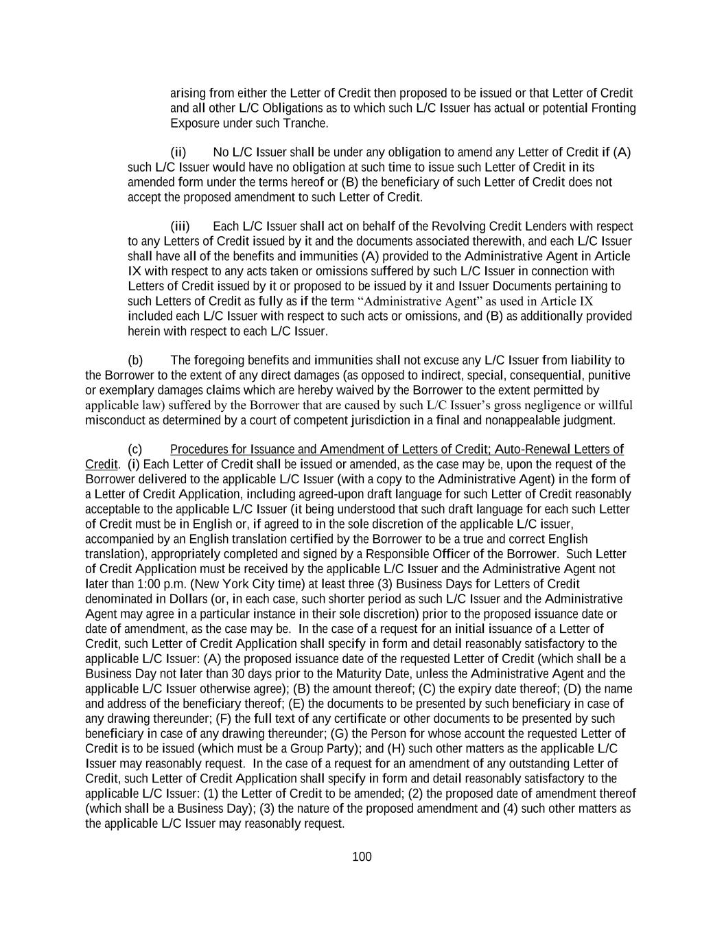 185 acknowledged and accepted the appointment of the Administrative Agent pursuant to the terms of Article IX for itself and its Affiliates as if a “Lender” party hereto. It is understood and agreed by each Loan Party and each Secured Party that the Administrative Agent and Collateral Agent shall have no liability for any determinations made by it in this Section 8.04, in each case except to the extent resulting from the gross negligence or willful misconduct of the Administrative Agent or the Collateral Agent, as applicable (as determined by a court of competent jurisdiction in a final and non-appealable decision). Each Loan Party and each Secured Party also agrees that the Administrative Agent and the Collateral Agent may (but shall not be required to), at any time and in its sole discretion, and with no liability resulting therefrom, petition a court of competent jurisdiction regarding any application of Collateral in accordance with the requirements hereof, and the Administrative Agent and the Collateral Agent shall be entitled to wait for, and may conclusively rely on, any such determination. ARTICLE IX. Administrative Agent and Other Agents Section 9.01 Appointment and Authorization of Agents. (a) Each Lender, the Swingline Lender and each L/C Issuer hereby irrevocably appoints Bank of America to act on its behalf as Administrative Agent hereunder and under the other Loan Documents (subject to the provisions in Section 9.09), and designates and authorizes the Administrative Agent to take such actions on its behalf under the provisions of this Agreement and each other Loan Document and to exercise such powers and perform such duties as are expressly delegated to the Administrative Agent by the terms of this Agreement or any other Loan Document, together with such actions and powers as are reasonably incidental thereto (including to extend any deadline (which such extension may be retroactive) or requirement in connection with compliance with the provisions of the Loan Documents relating to any Guaranty). The Administrative Agent may perform any of its duties through its officers, directors, agents, employees, or affiliates. Except as expressly provided for in Sections 9.09 and 9.11 with respect to the Borrower’s right to receive, or its ability to furnish, notice as described therein, and the provisions related to the release of Guarantors or Collateral, the provisions of this Article are solely for the benefit of the Administrative Agent, the Lenders, the Swingline Lender and each L/C Issuer, and no Loan Party shall have rights as a third party beneficiary of any of such provisions. Notwithstanding any provision to the contrary contained elsewhere herein or in any other Loan Document no Agent shall have any duties or responsibilities, except those expressly set forth herein, nor shall any Agent have or be deemed to have any fiduciary relationship with any Lender, the Swingline Lender or any L/C Issuer or participant, and no implied covenants, functions, responsibilities, duties, obligations or liabilities shall be read into this Agreement or any other Loan Document or otherwise exist against any Agent. Regardless of whether a Default has occurred and is continuing and without limiting the generality of the foregoing sentence, the use of the term “agent” herein and in the other Loan Documents with reference to any Agent is not intended to connote any fiduciary or other implied (or express) obligations arising under agency doctrine of any applicable Law. Instead, such term is used merely as a matter of market custom, and is intended to create or reflect only an administrative relationship between independent contracting parties. (b) Each L/C Issuer shall act on behalf of the Lenders with respect to any Letters of Credit issued by it and the documents associated therewith, and such L/C Issuer shall have all of the benefits and immunities (i) provided to the Agents in this Article IX with respect to any acts taken or omissions suffered by such L/C Issuer in connection with Letters of Credit issued by it or proposed to be issued by it and the applications and agreements for letters of credit pertaining to such Letters of Credit as fully as if the term “Agent” as used in this Article IX and in the definition of “Agent-Related Person” included such